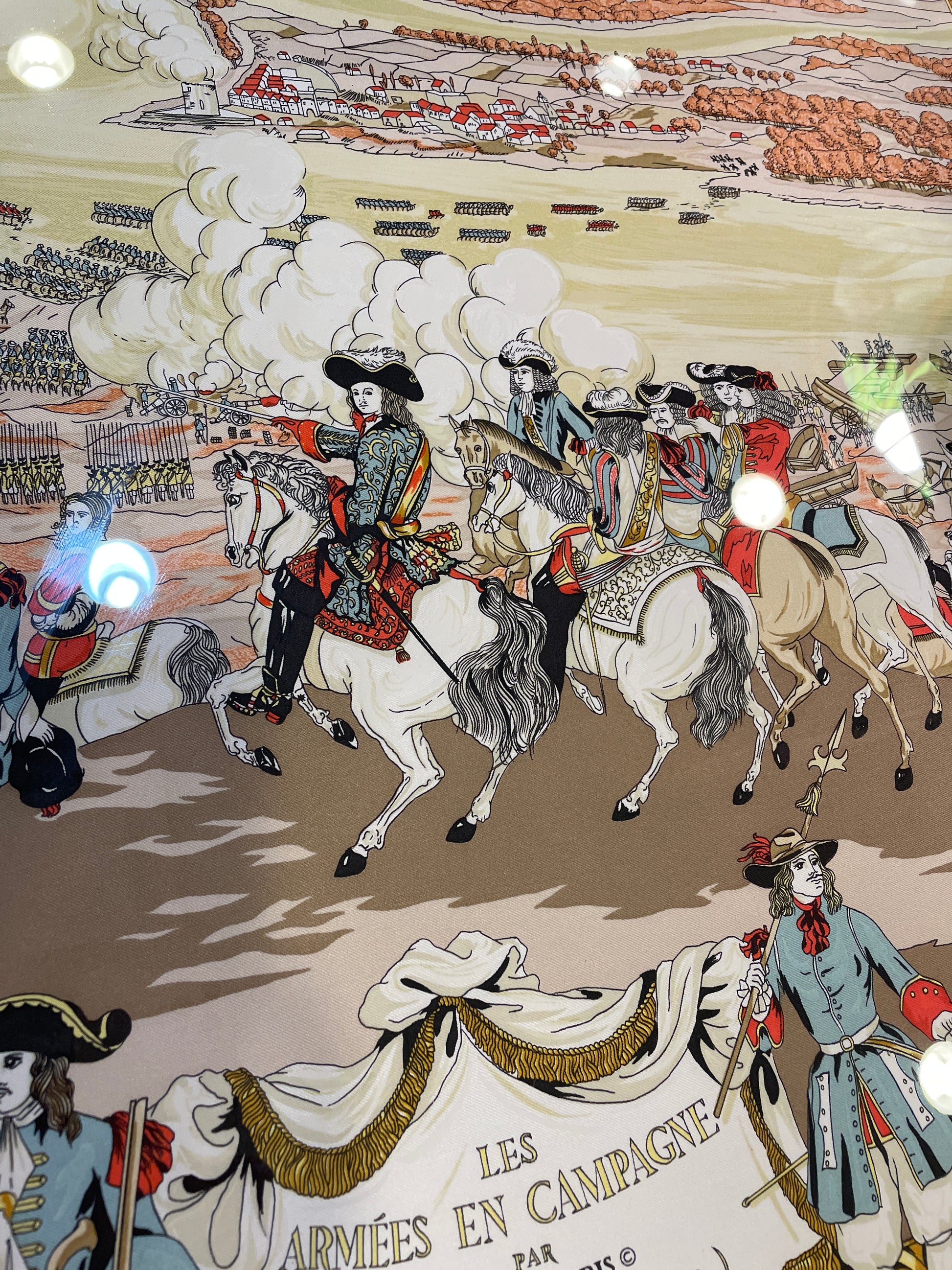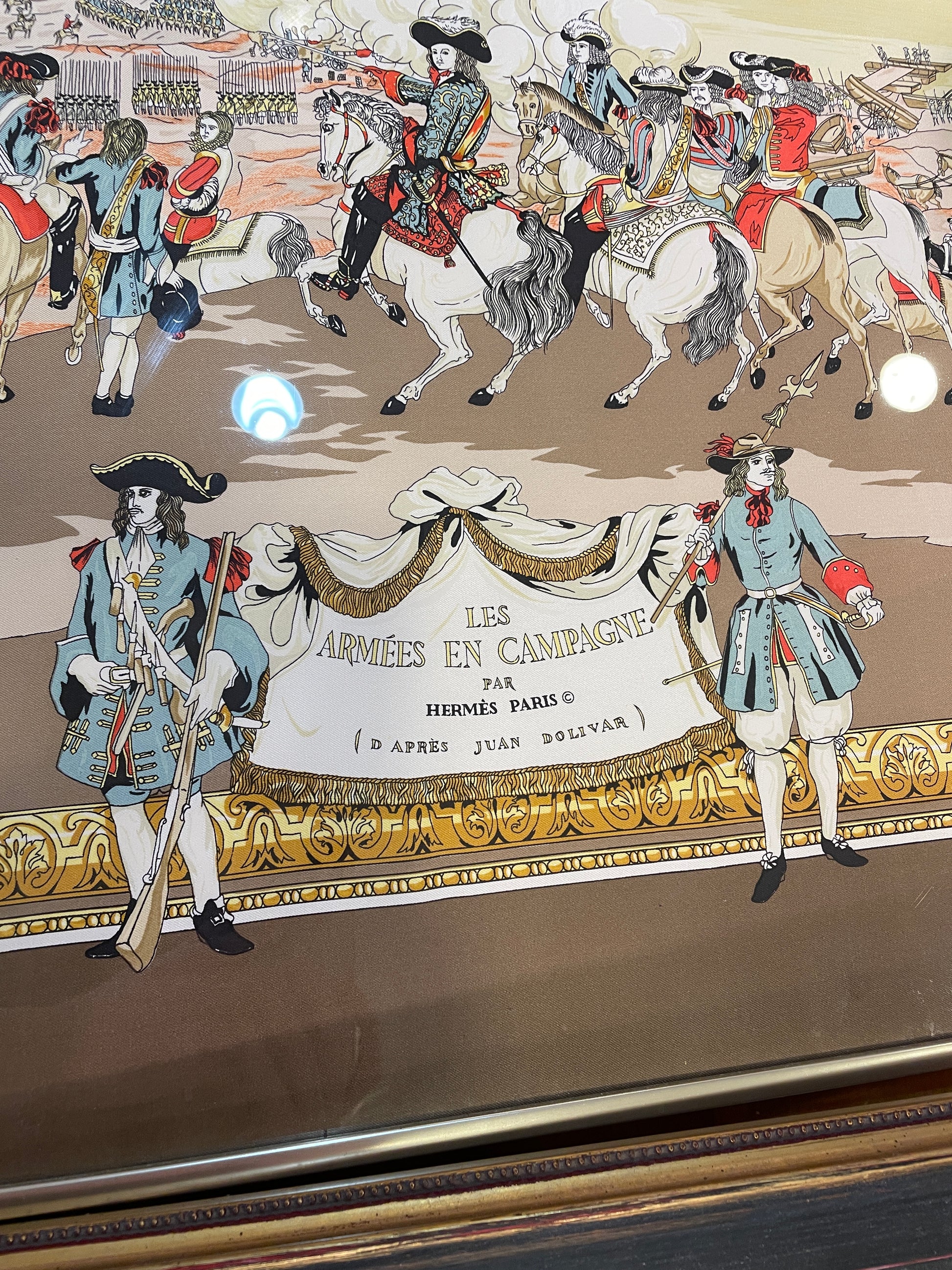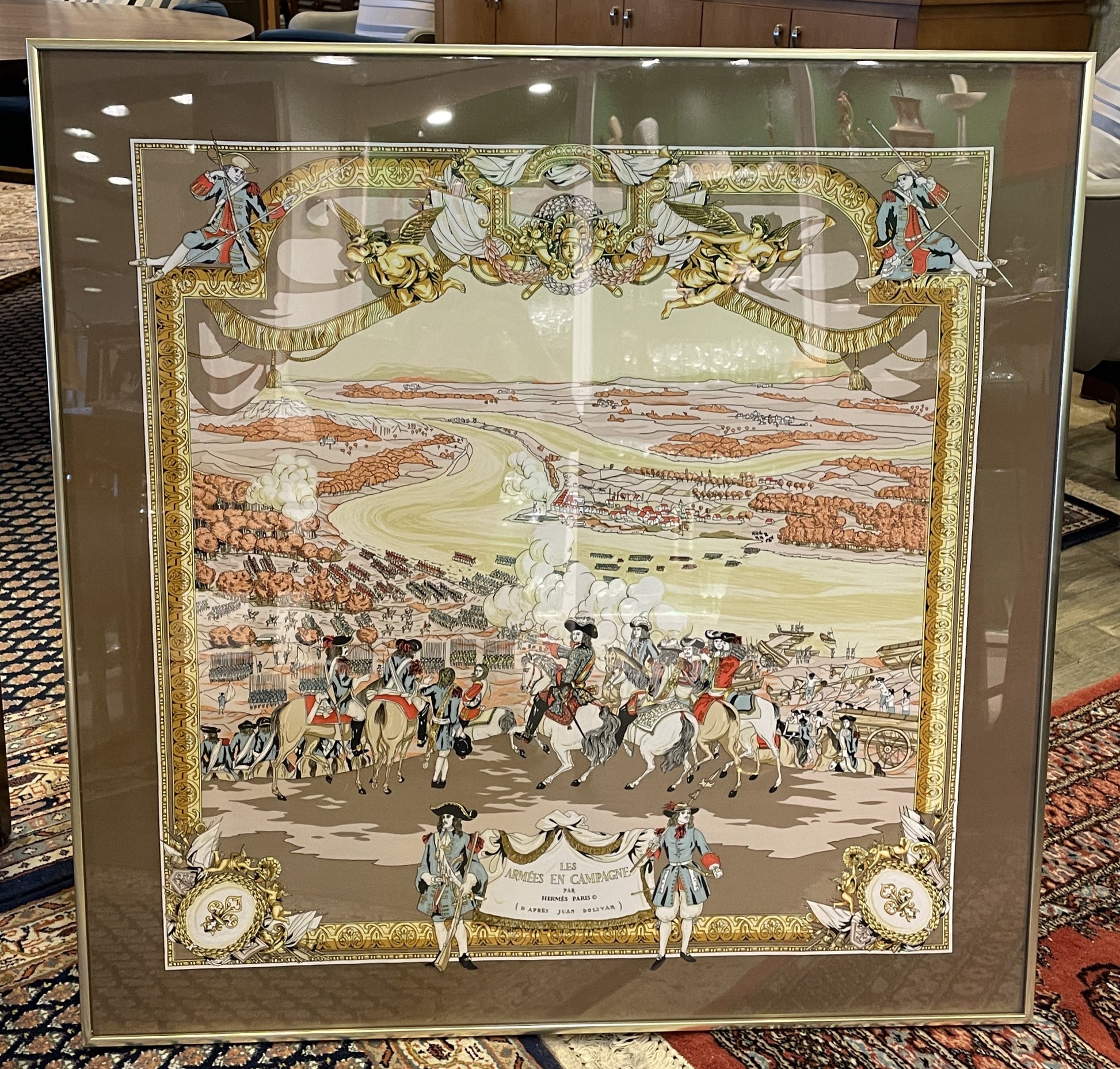 Hermes framed scarf titled "Les Armees in Campagne". This intricately designed scarf is a beautiful work of art. The scarf displays an intricate scene of an army in front of a small town. The foreground of the piece shows many different soldiers and their horses. The background has many more groups of soldiers, an river, and a few clusters of trees. The scene is embellished with a border that is similarly intricately detailed. The border has the appearance of a gilded ornately carved frame that is ornamented with flags, cherubs, angels, and more. The scarf is framed in a simple gold frame. A beautiful and unique addition to a space.
