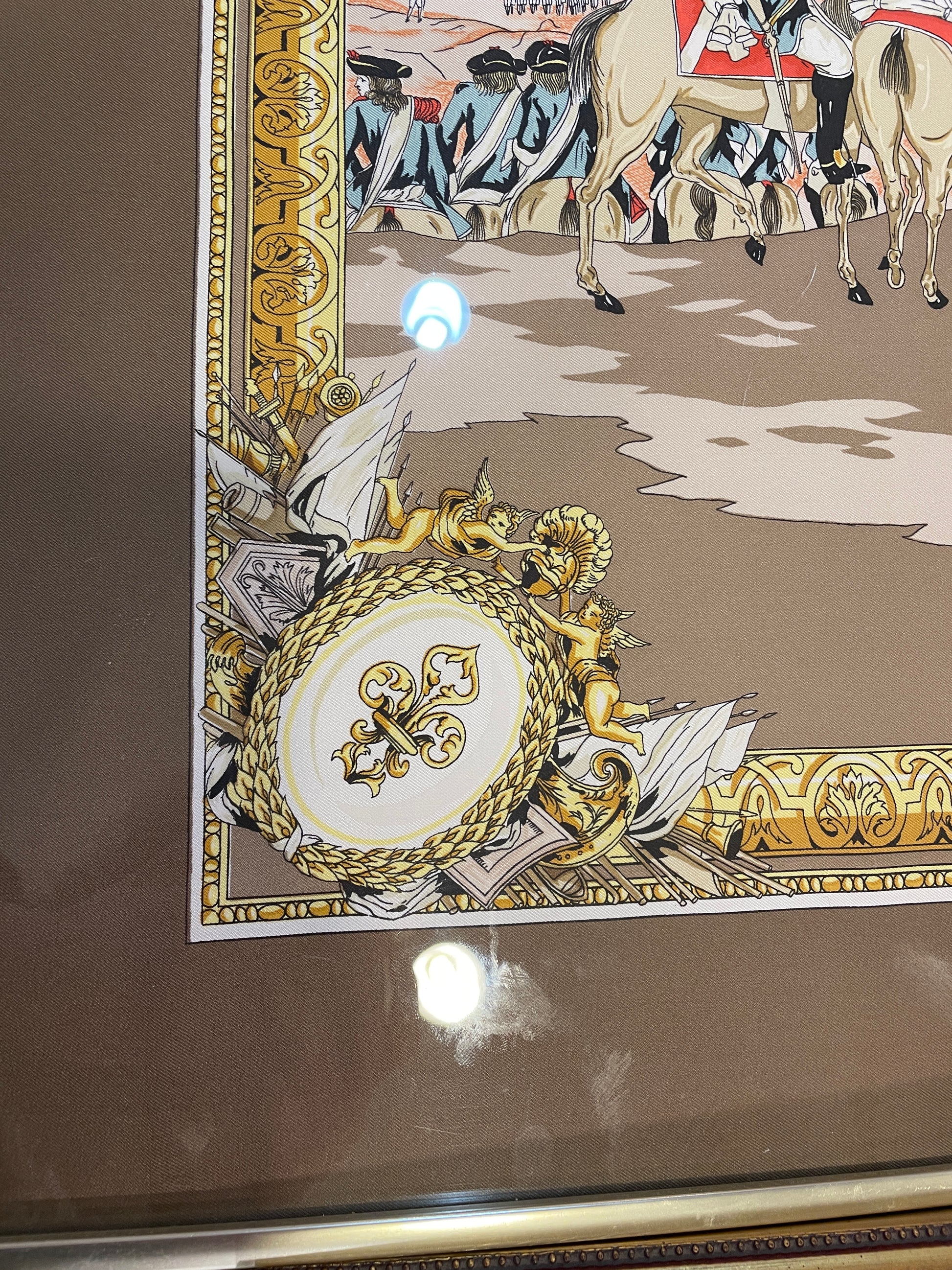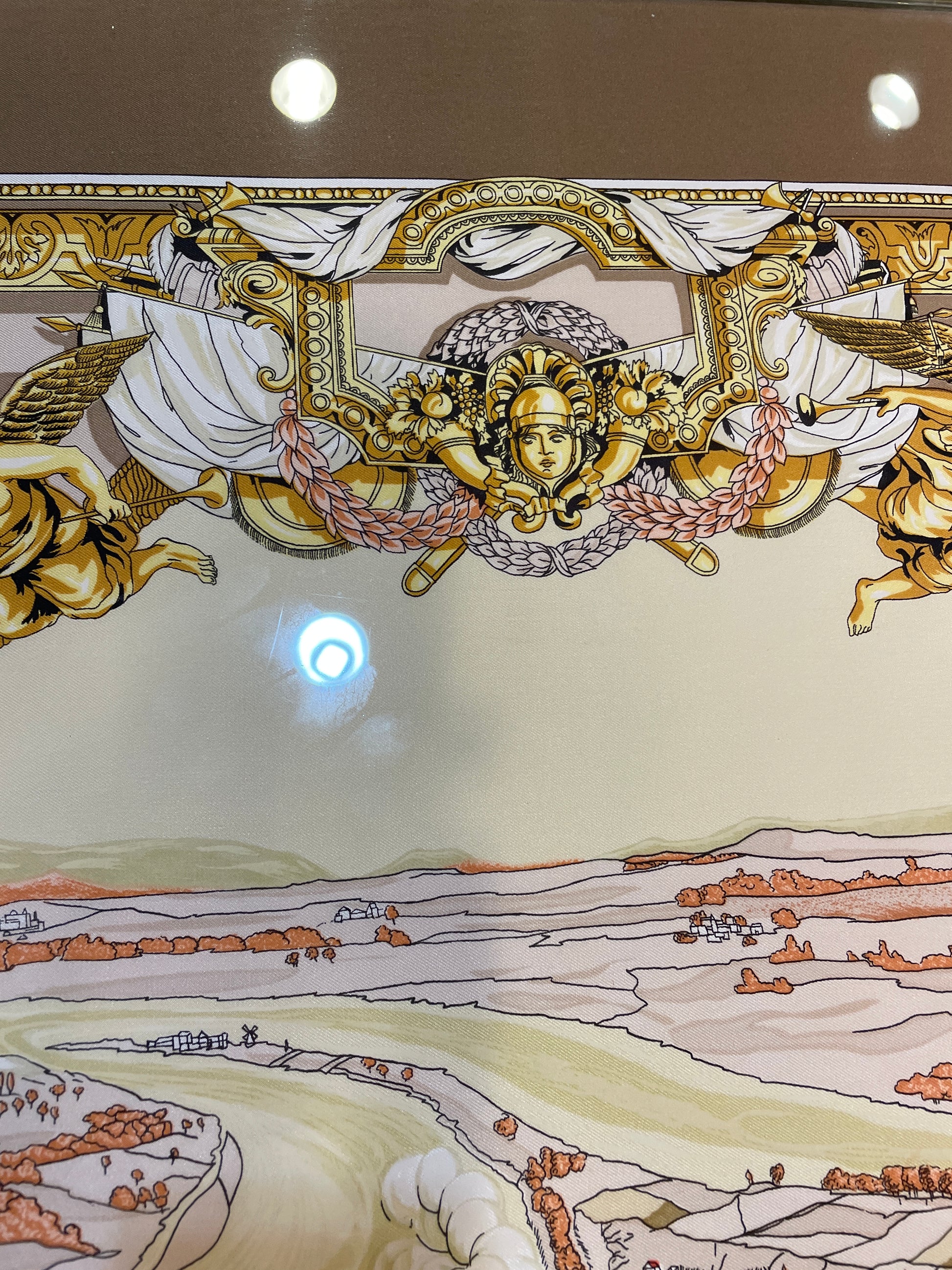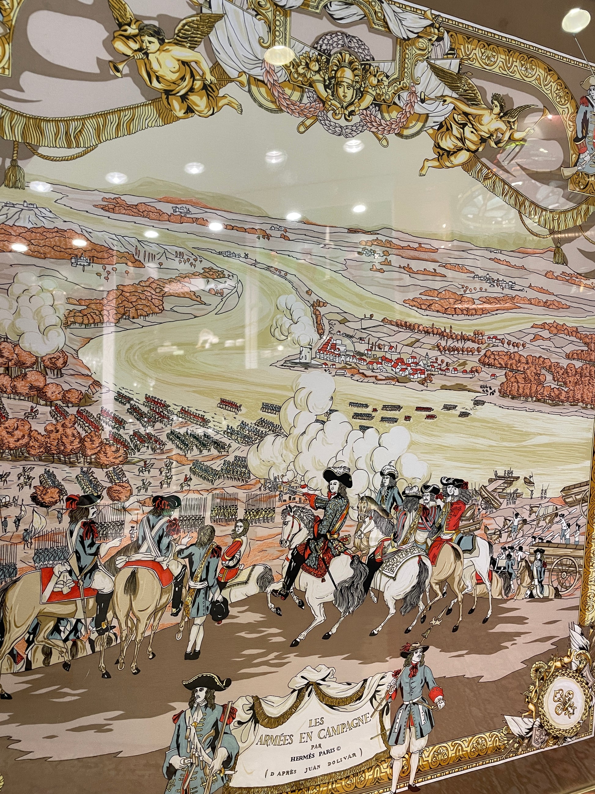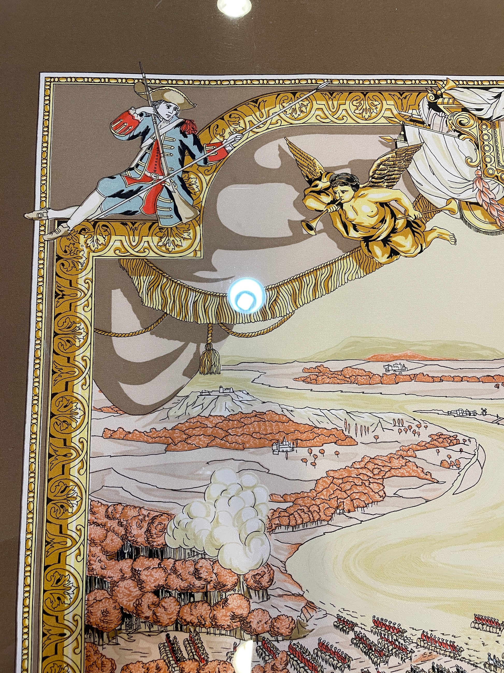 Hermes framed scarf titled "Les Armees in Campagne". This intricately designed scarf is a beautiful work of art. The scarf displays an intricate scene of an army in front of a small town. The foreground of the piece shows many different soldiers and their horses. The background has many more groups of soldiers, an river, and a few clusters of trees. The scene is embellished with a border that is similarly intricately detailed. The border has the appearance of a gilded ornately carved frame that is ornamented with flags, cherubs, angels, and more. The scarf is framed in a simple gold frame. A beautiful and unique addition to a space.