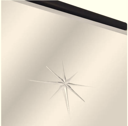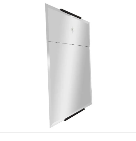 Etched "Trumeau" mirror from Holly Hunt. Features a large frameless mirror with beveled edges and a starburst design on the top section. The mirror sits in a rounded partial mahogany trim on the top and bottom.