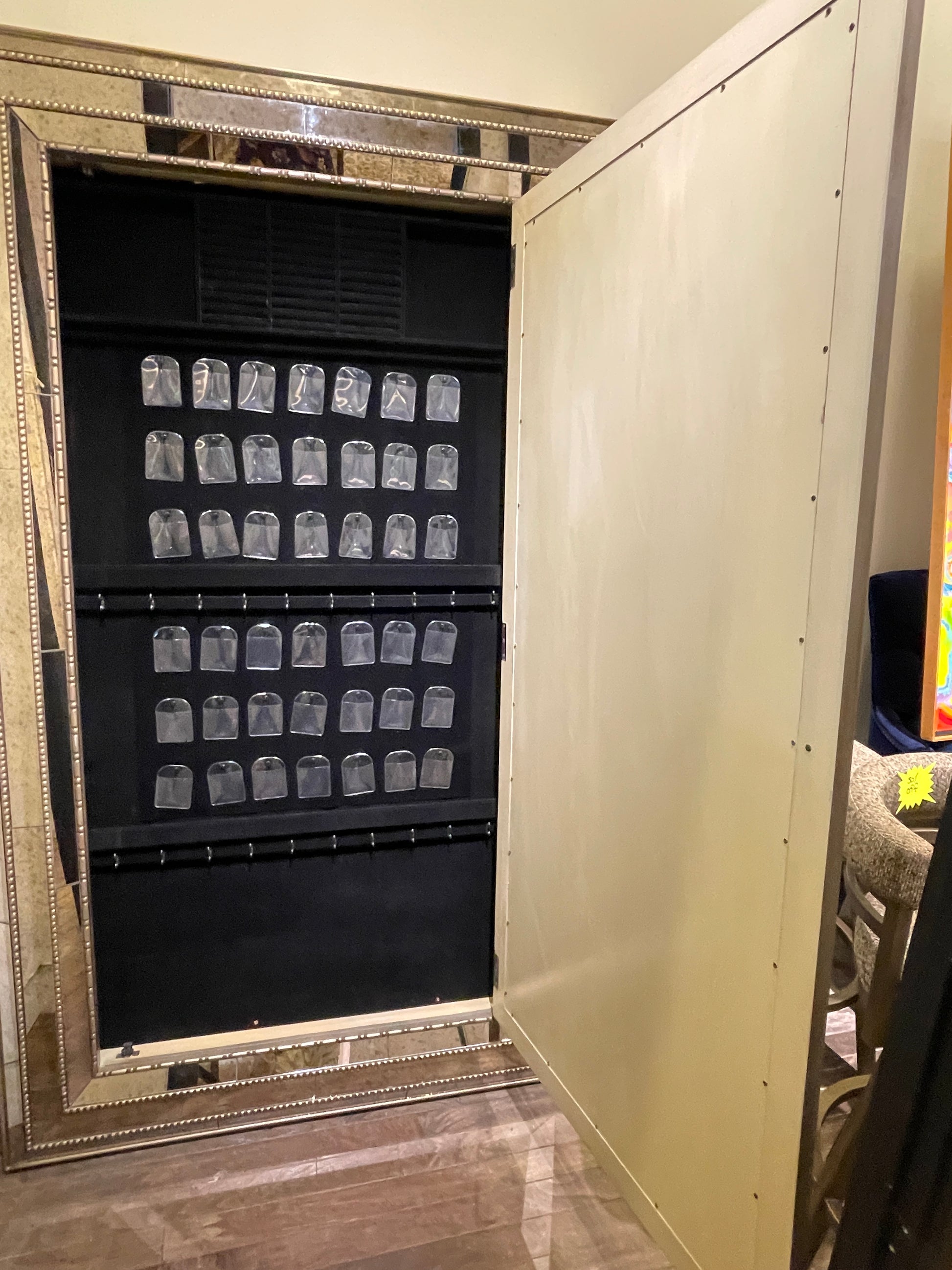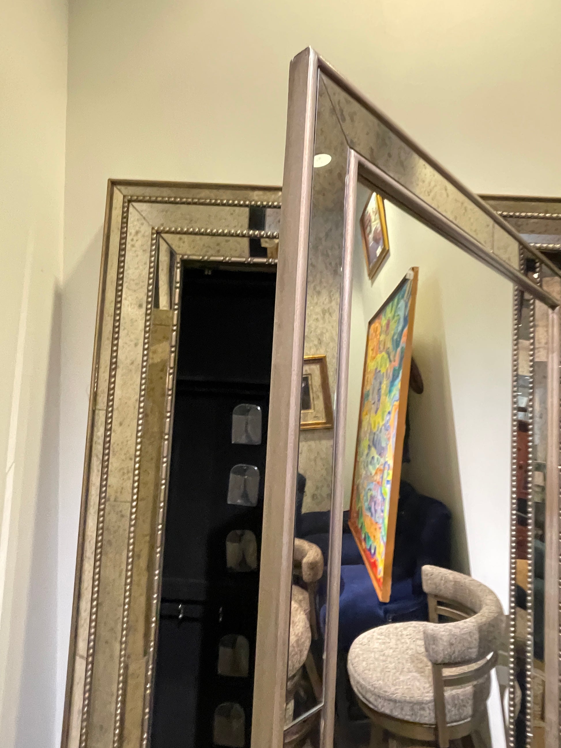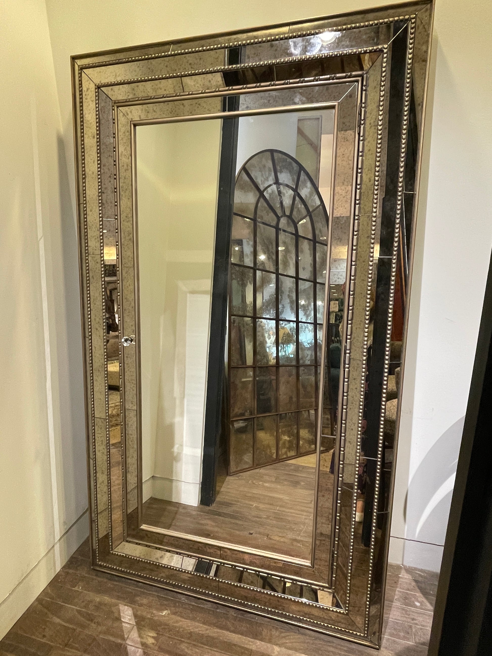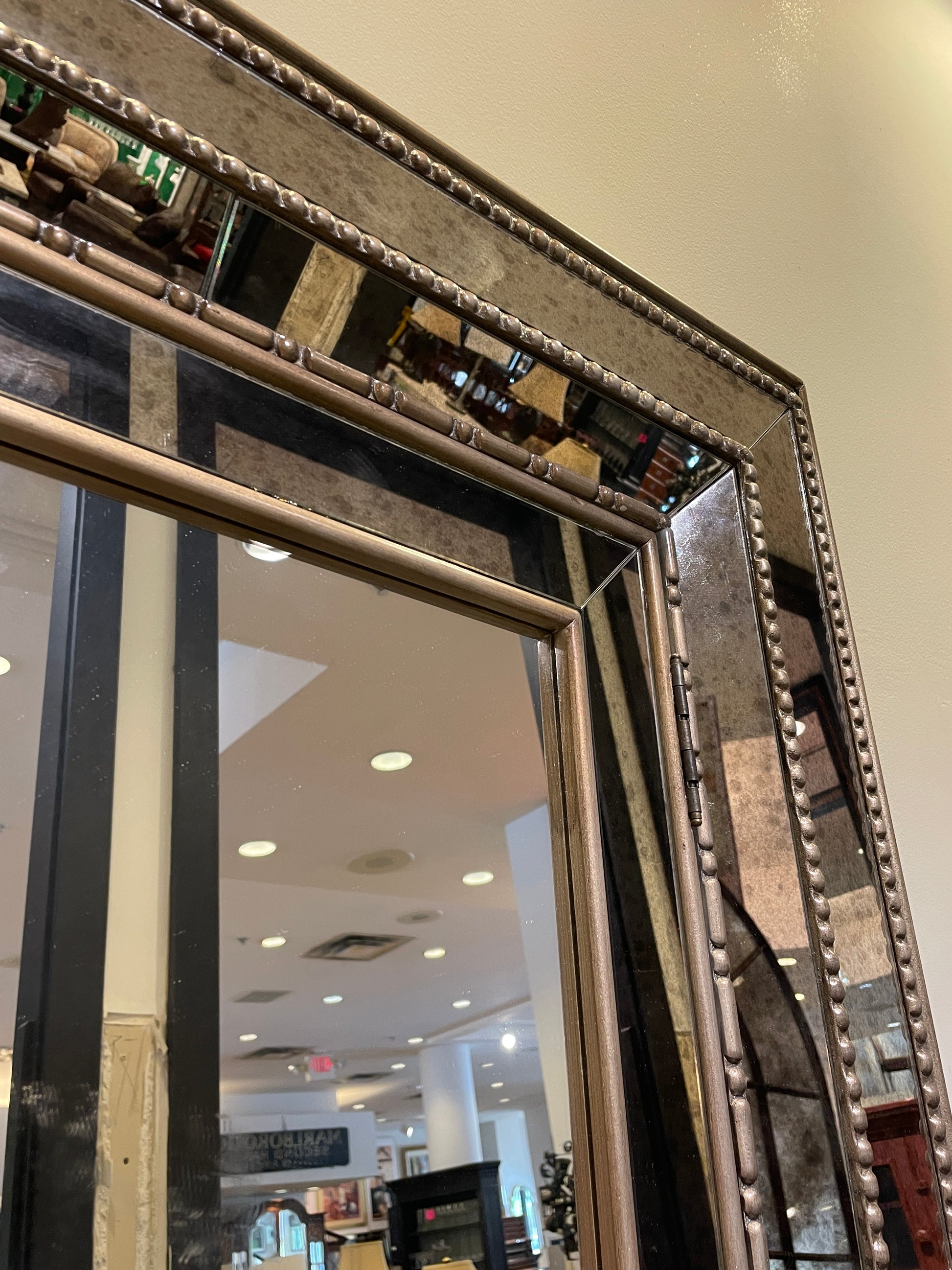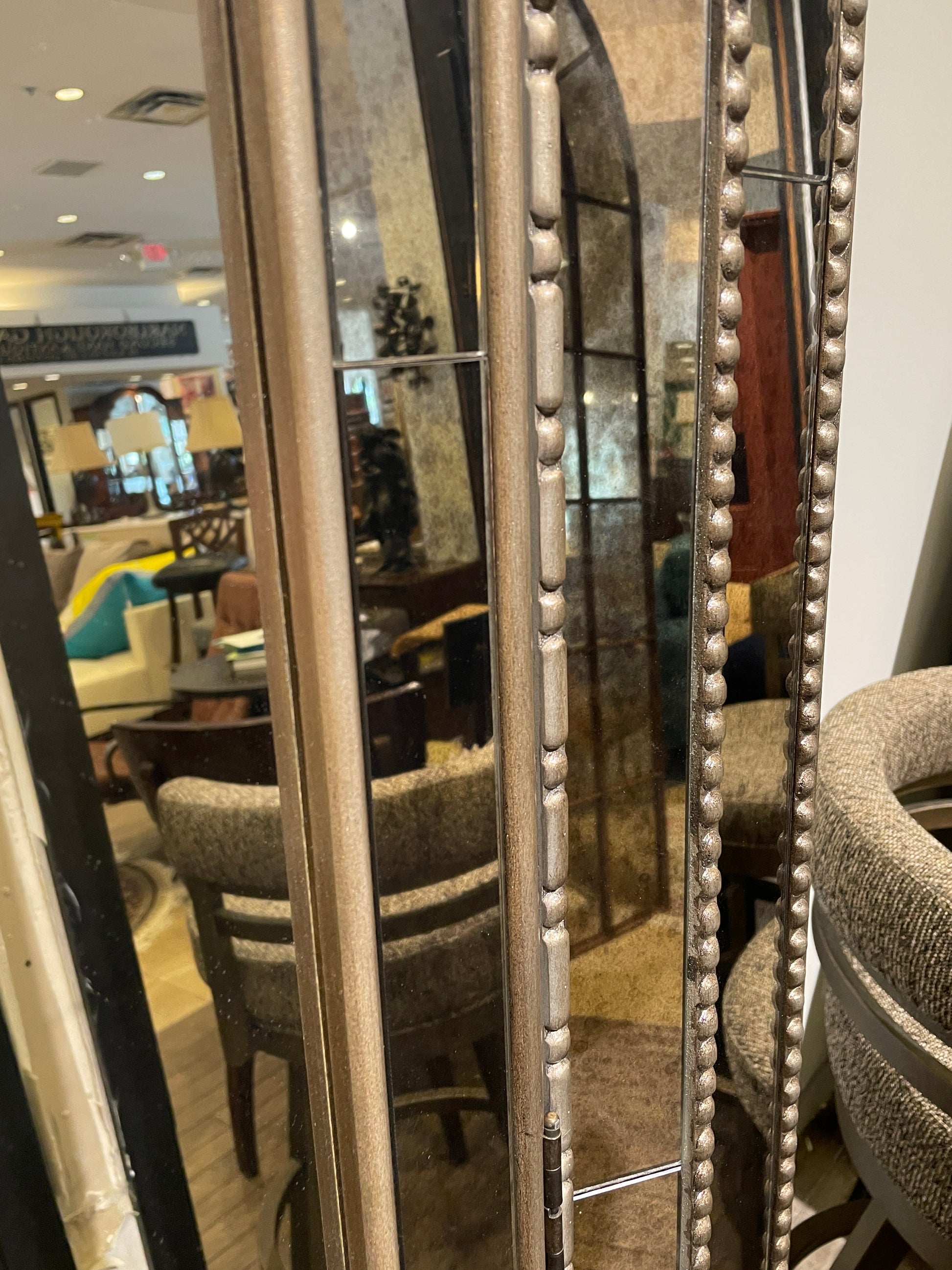 Melange Floor Mirror with jewelry storage by the brand Hooker. Features a wooden frame and silver coloration. The frame of the mirror has a tiered design with wooden designs and mirrors. The mirror opens with a small crystal knob to reveal a black velvet-lined cabinet with ample jewelry storage space. As described in the original listing, "interior contains two shelves, ring storage, and pouches with hook-and-loop fasteners and hooks for necklaces." A lovely place to display a jewelry collection and enhance your space! Retails at $2,300.00.