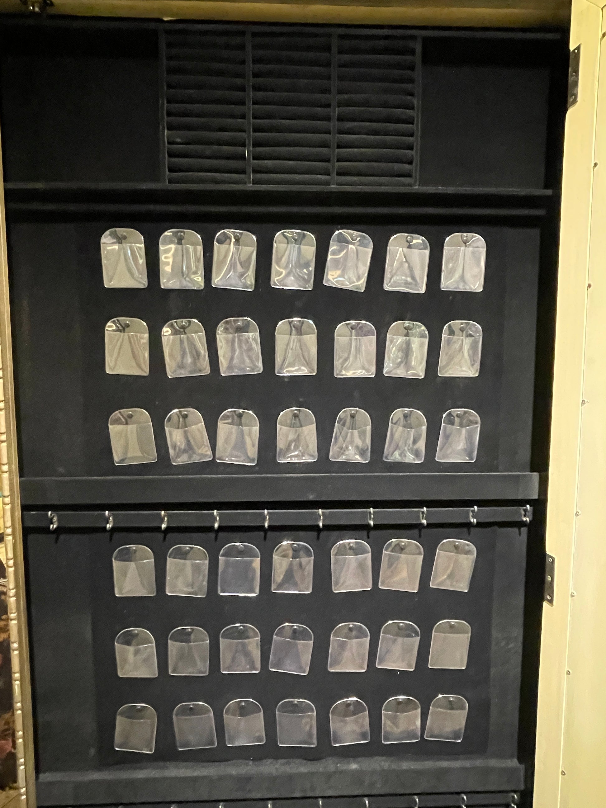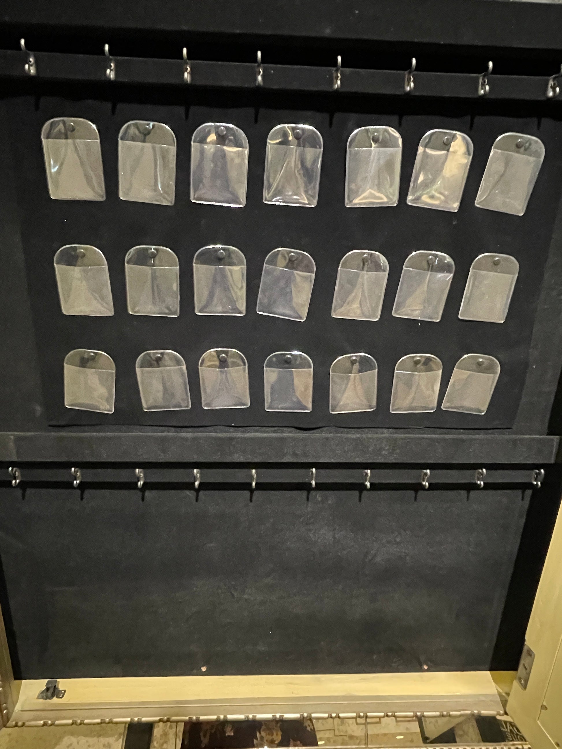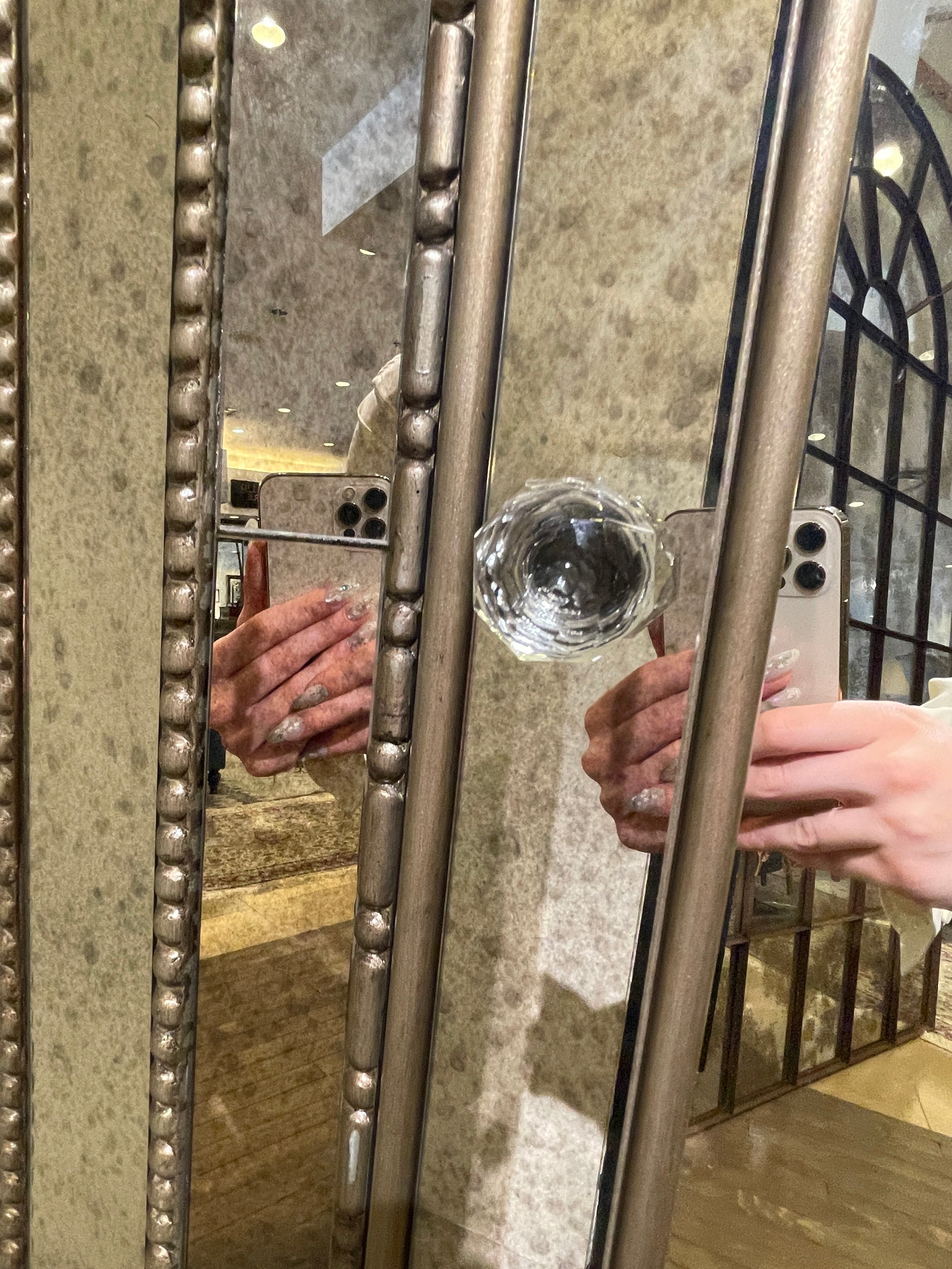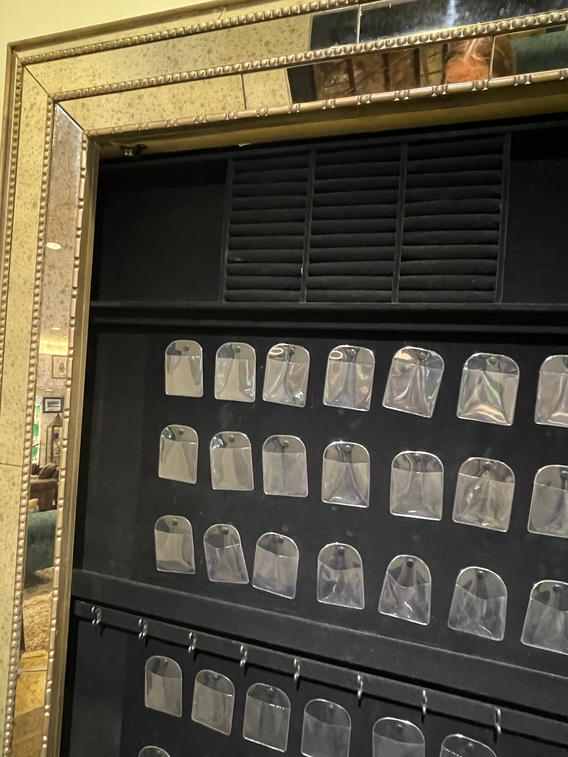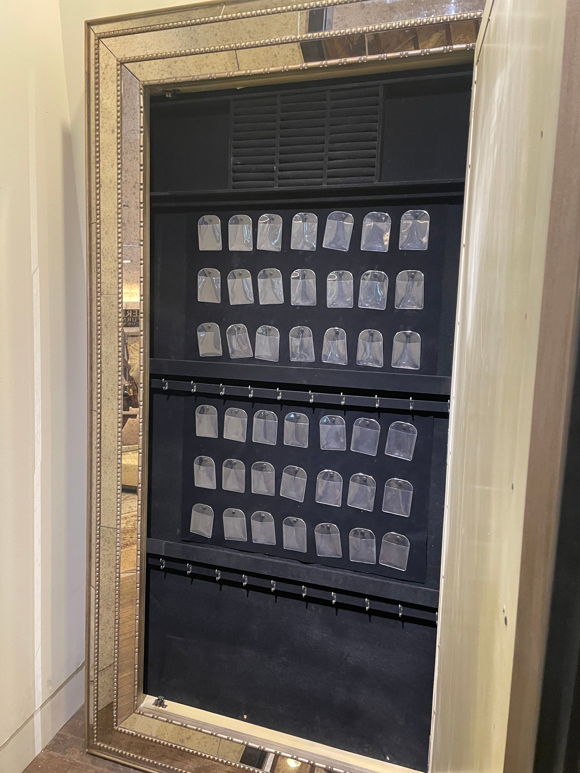 Melange Floor Mirror with jewelry storage by the brand Hooker. Features a wooden frame and silver coloration. The frame of the mirror has a tiered design with wooden designs and mirrors. The mirror opens with a small crystal knob to reveal a black velvet-lined cabinet with ample jewelry storage space. As described in the original listing, "interior contains two shelves, ring storage, and pouches with hook-and-loop fasteners and hooks for necklaces." A lovely place to display a jewelry collection and enhance your space! Retails at $2,300.00.