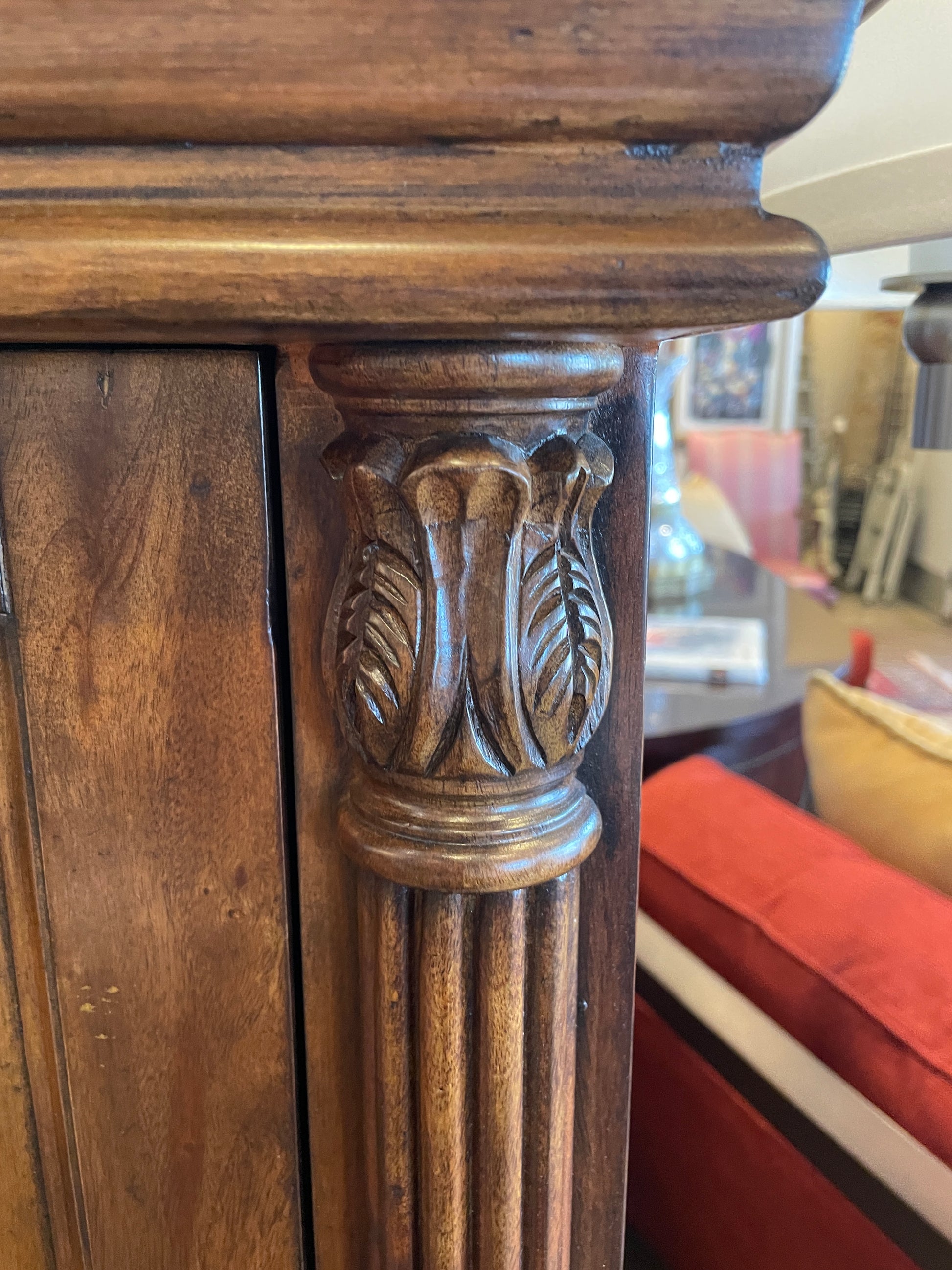 Howard Miller bar cabinet. This beautiful wooden cabinet features three different compartments. The upper one features a metal stemware rack, the middle one pivots out to reveal two half circle storage shelves, and the lowest has bottle storage. The uppermost cabinet features a mirrored back for added elegance. The piece is accented with brass hardware and carved details. The sides have fluted pillars, and the piece sits atop bun shaped feet. A beautiful display piece that's sure to turn heads.