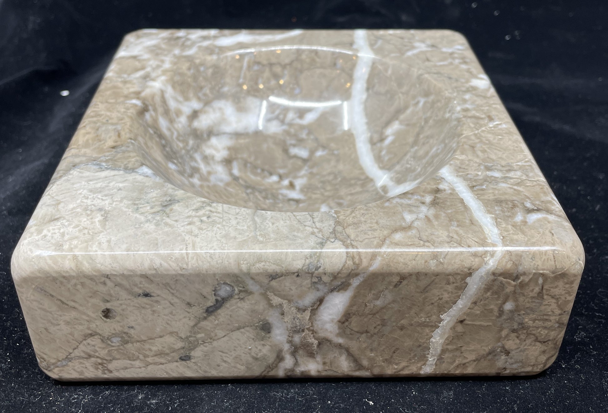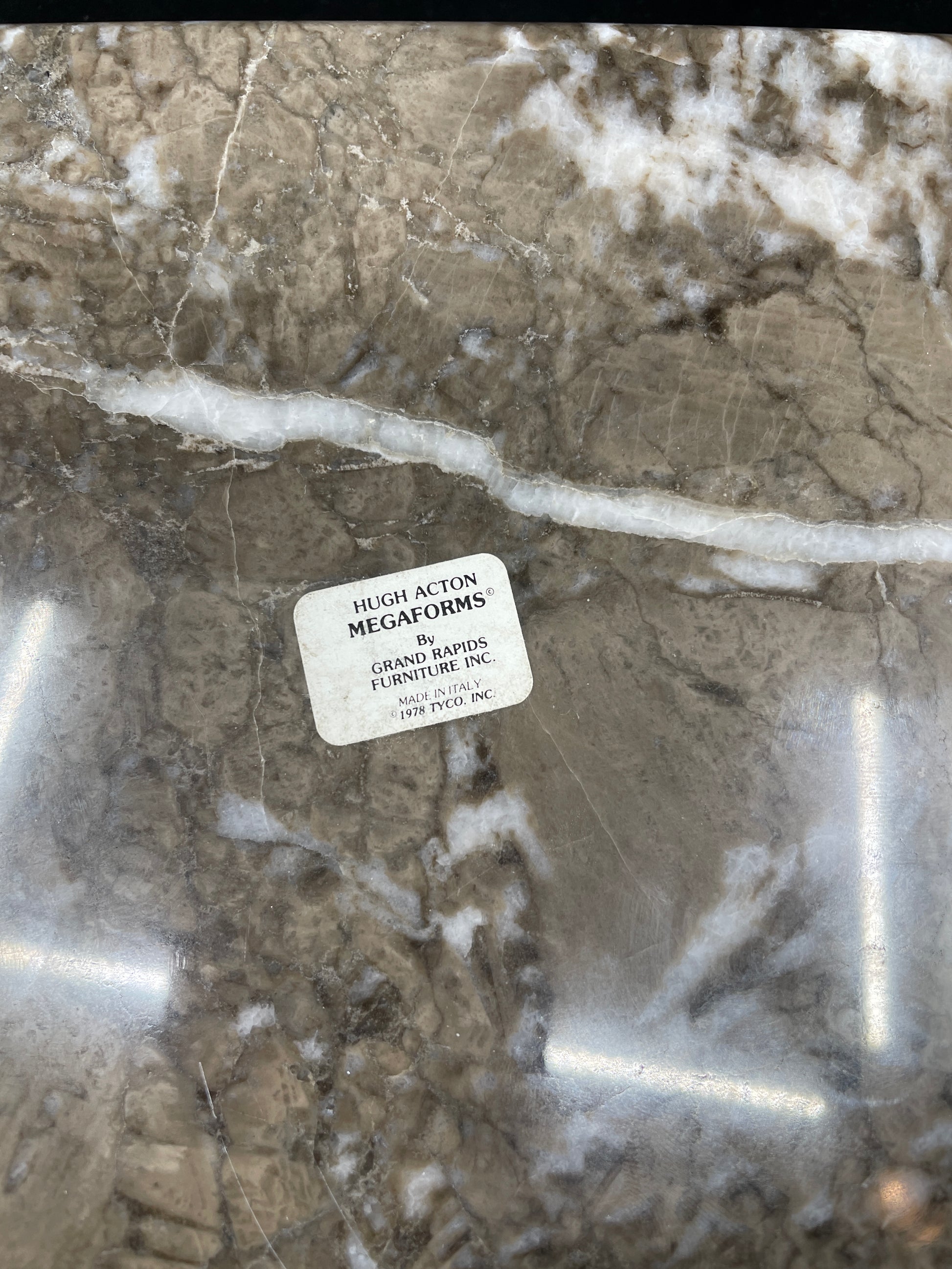 Art sculpture in a shallow bowl shape from the Megaforms collection by artist Hugh Acton. The sculpture is constructed of solid brown marble. The original sticker is present on the base of the sculpture. The perfect mid-century minimalist art accent piece to add depth to your space!