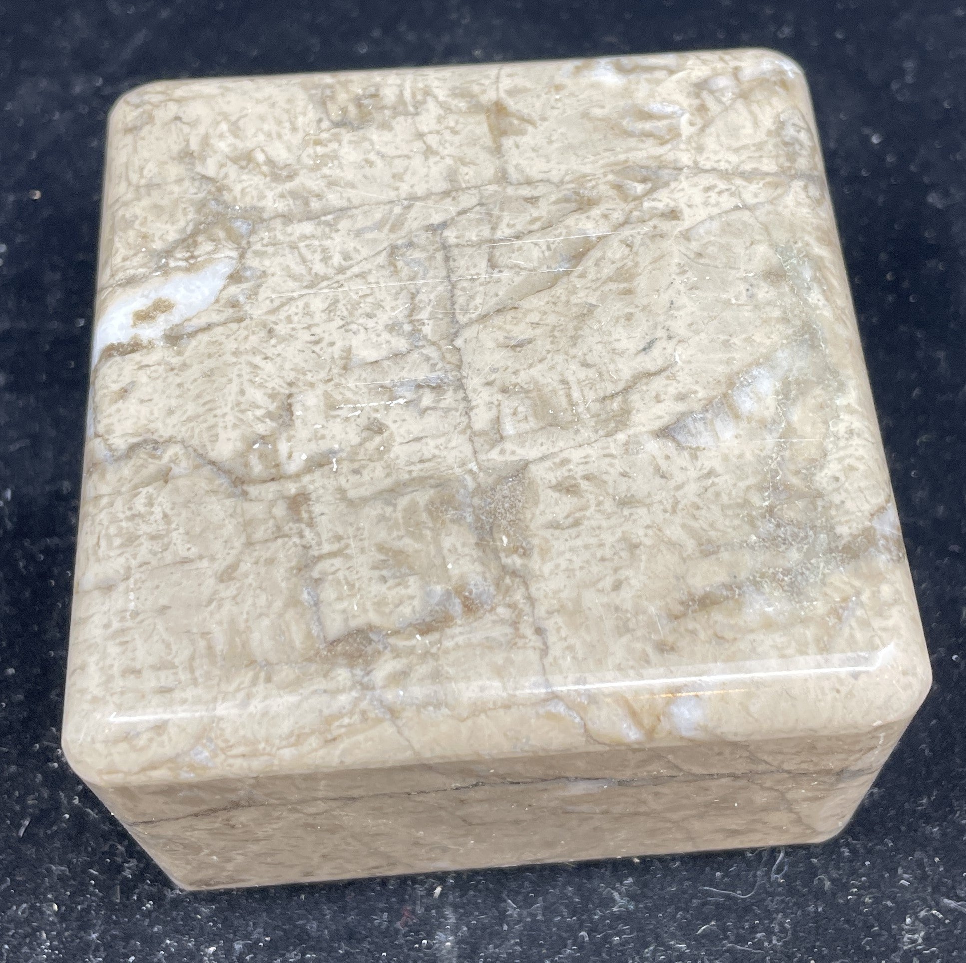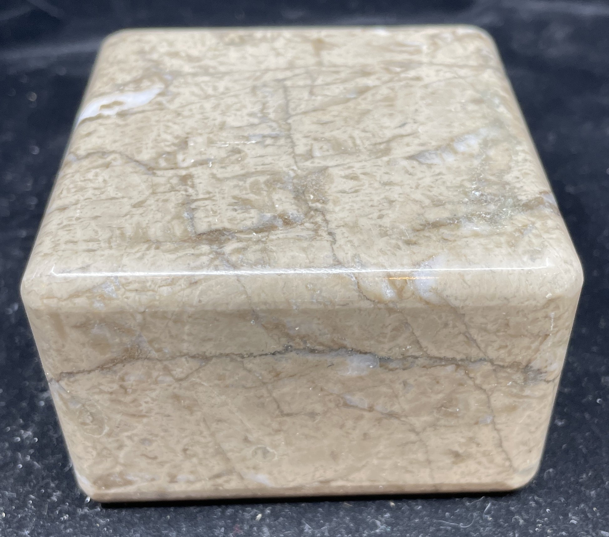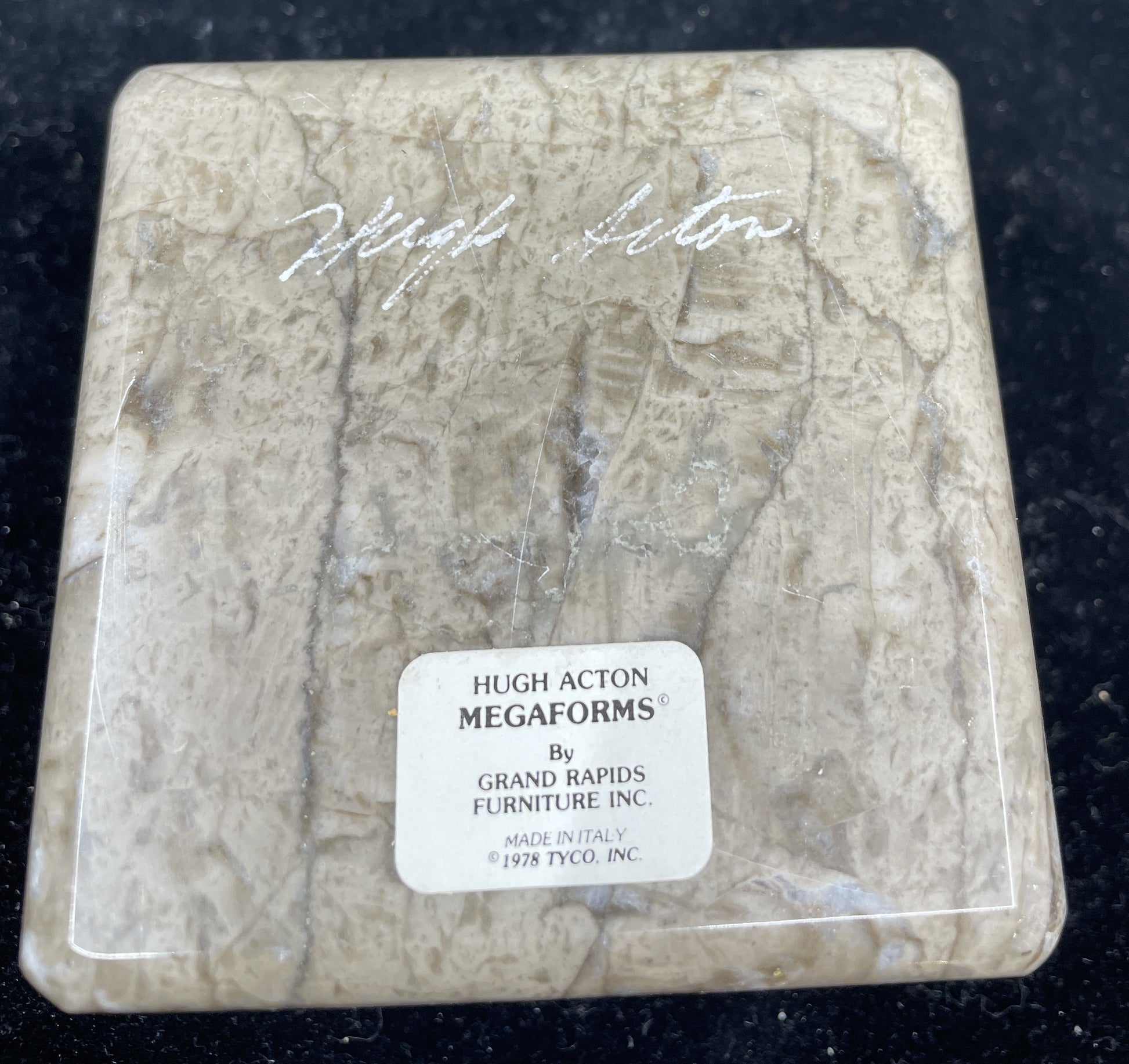 Petite pedestal/art sculpture from the Megaforms collection by artist Hugh Acton. The pedestal features brown marble construction, textured with veins and specks of white. The pedestal is a square shape with smoothed edges and a bright, shining appearance. The sculpture is signed with an original sticker present on the base.