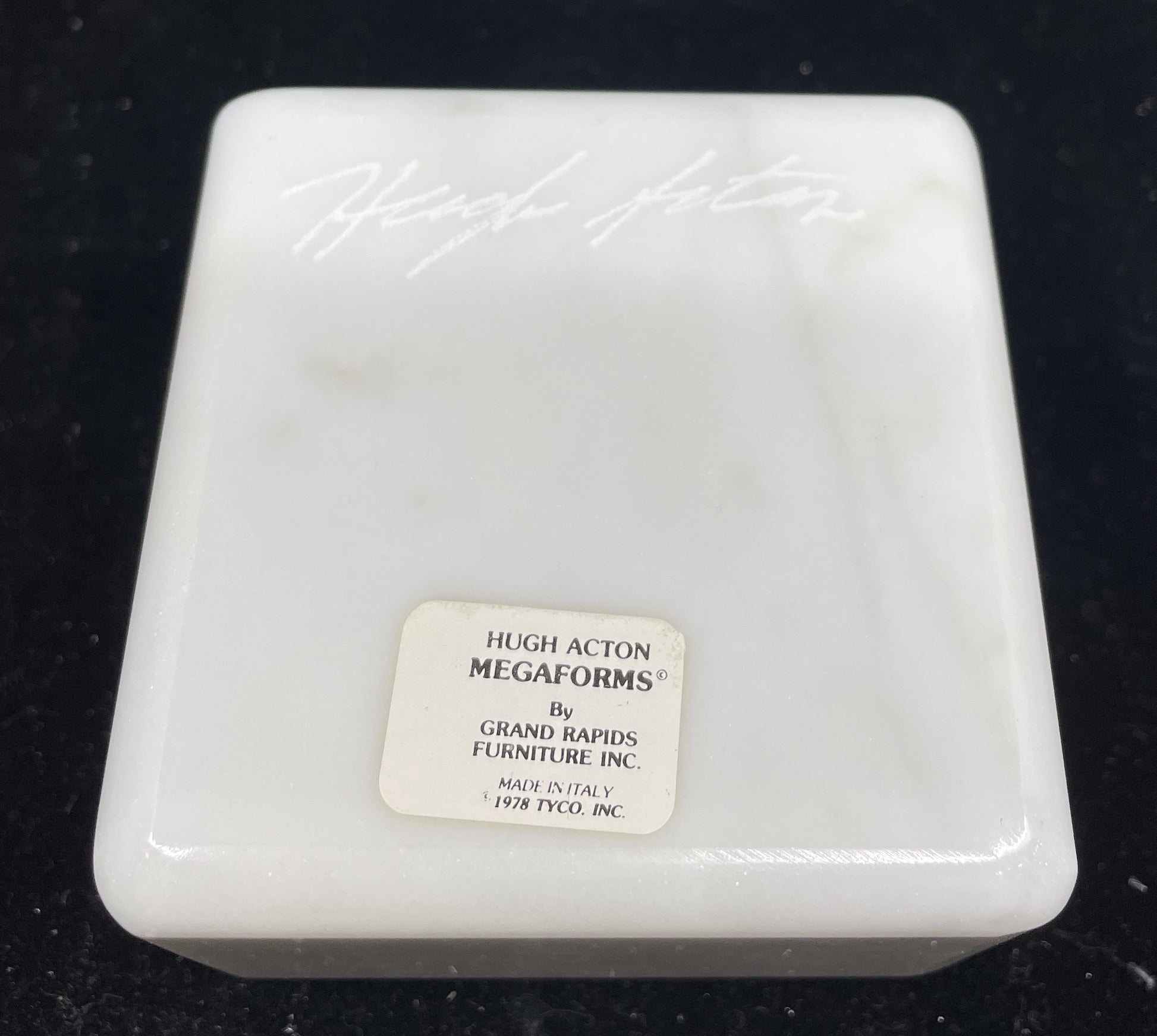 Petite pedestal/art sculpture from the Megaforms collection by artist Hugh Acton. The pedestal features Carrera marble construction with a bright white color. The pedestal is a square shape with smoothed edges and a bright, shining appearance. The sculpture has an original sticker present on the base.
