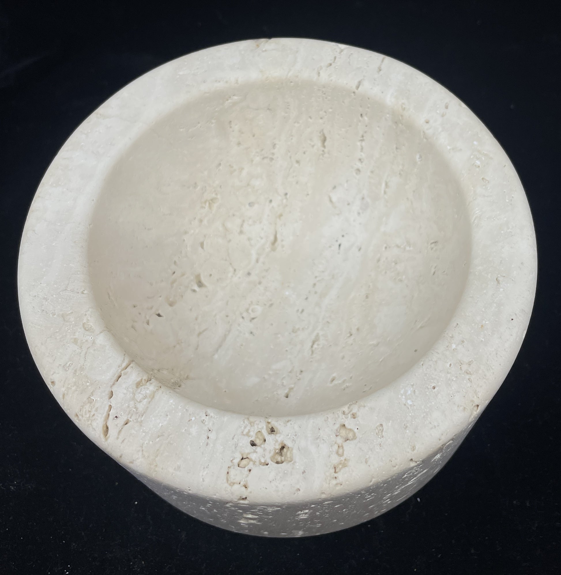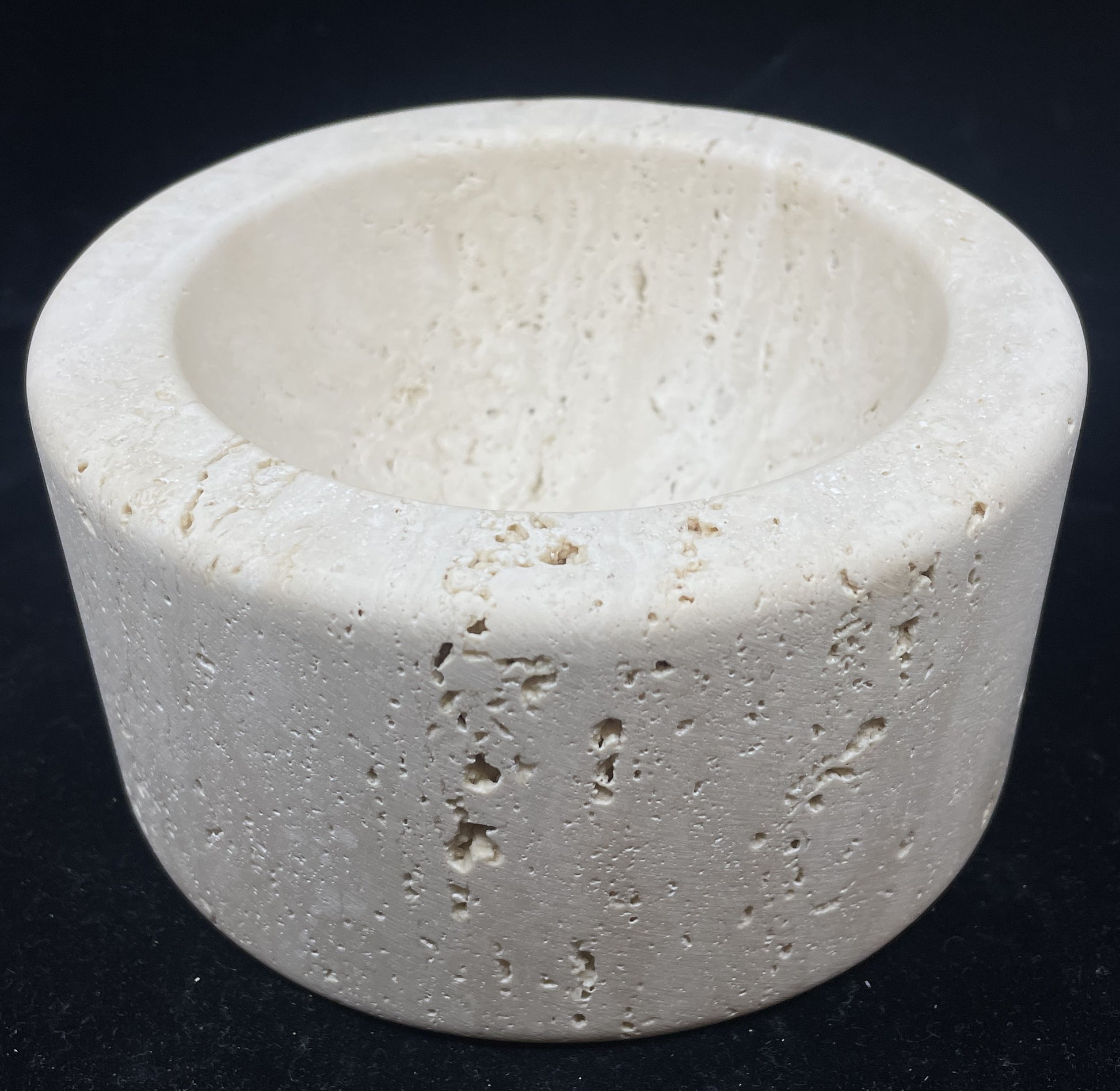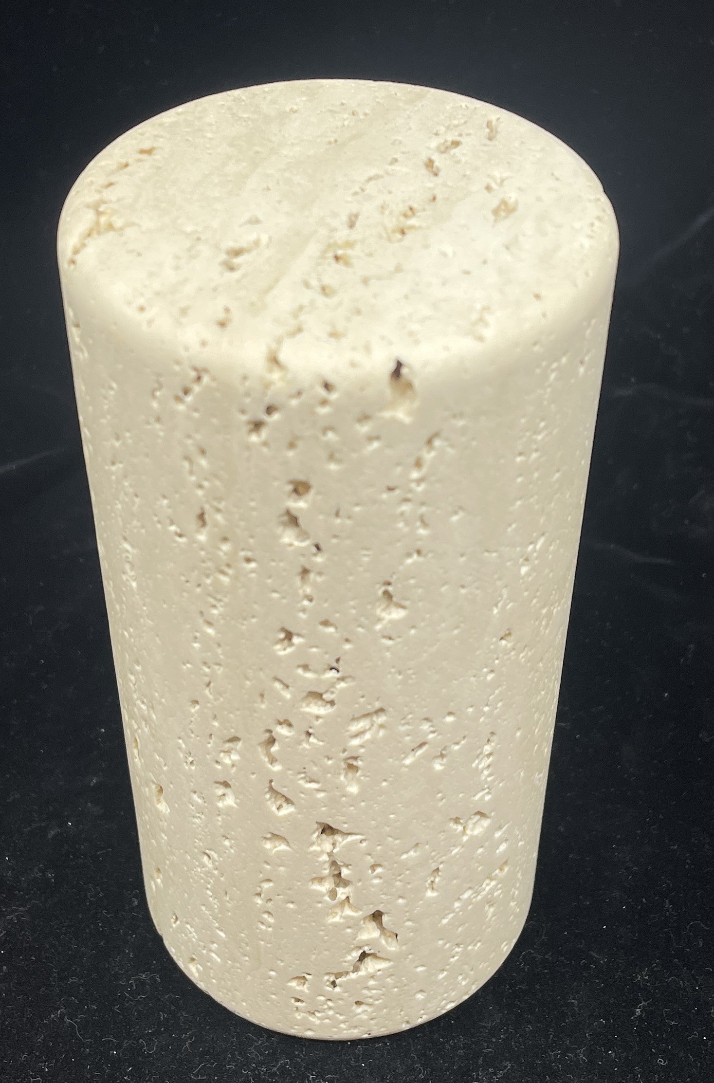 Set of four abstract art forms from the Megaforms collection by artist Hugh Acton. The set includes a low-lying bowl, tall cylinder, small circle and small square sculpture. The sculptures are constructed of solid travertine, a beautiful limestone with a milky beige coloration and textured with flowing specks and crevices. Each piece is signed with the original sticker present on the base.
