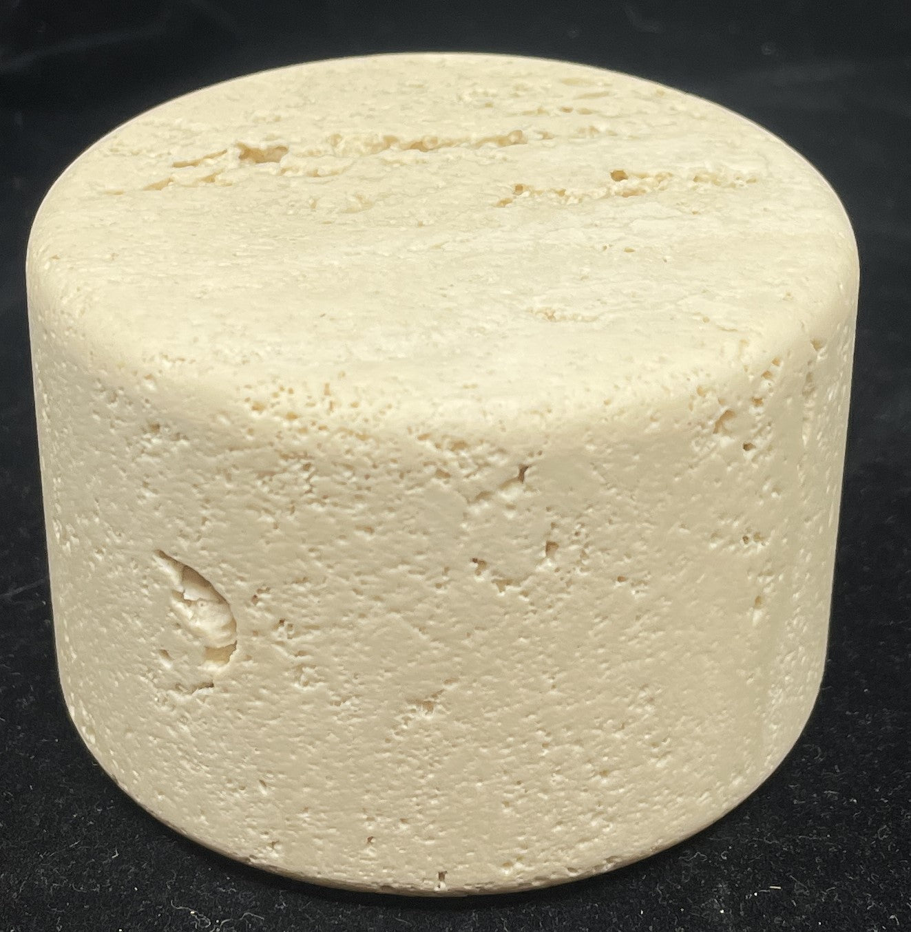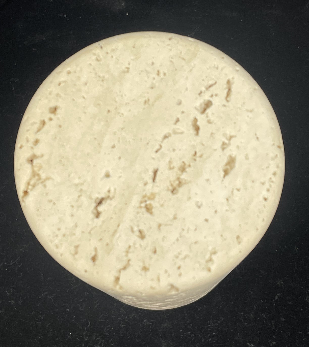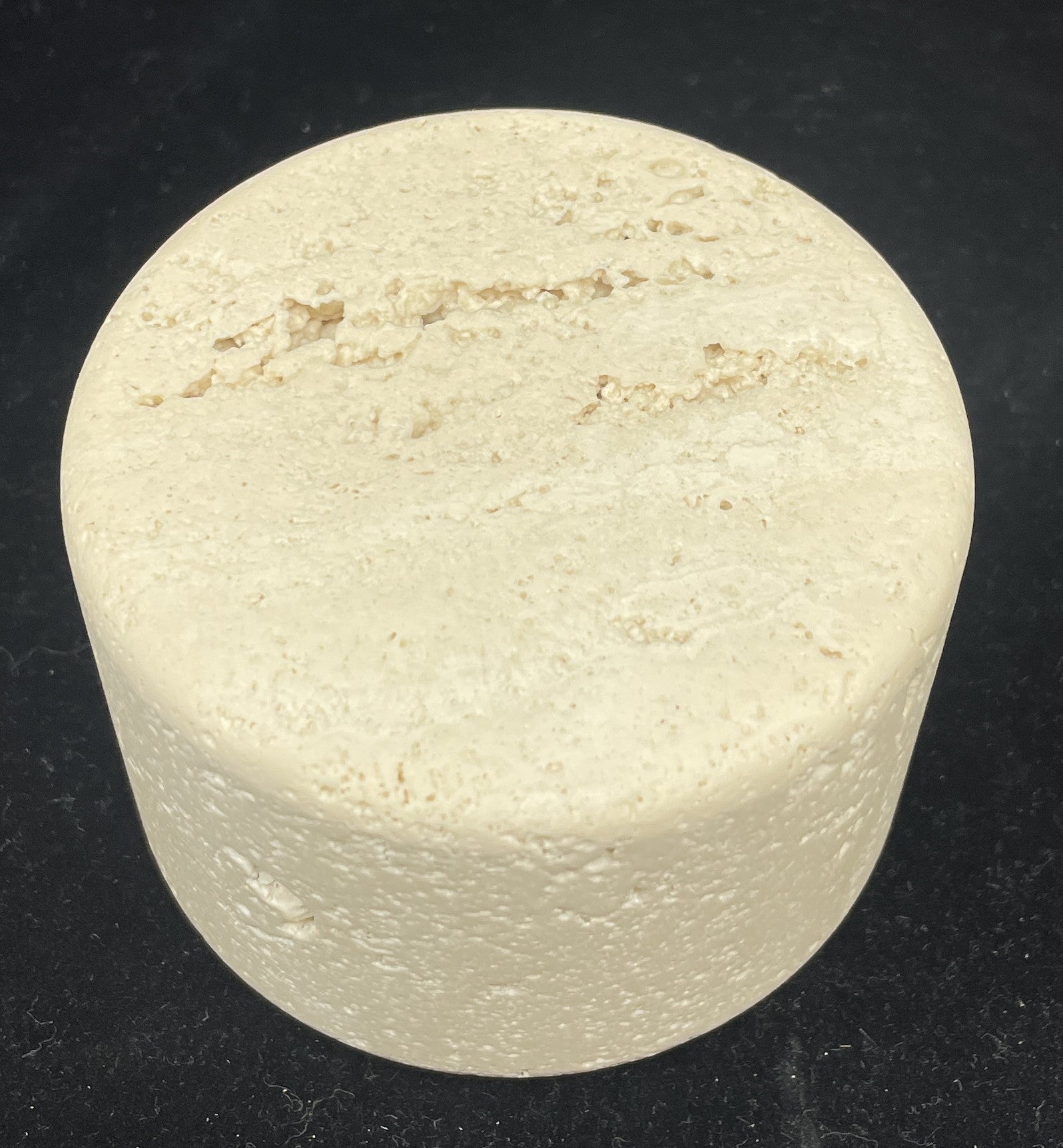 Set of four abstract art forms from the Megaforms collection by artist Hugh Acton. The set includes a low-lying bowl, tall cylinder, small circle and small square sculpture. The sculptures are constructed of solid travertine, a beautiful limestone with a milky beige coloration and textured with flowing specks and crevices. Each piece is signed with the original sticker present on the base.