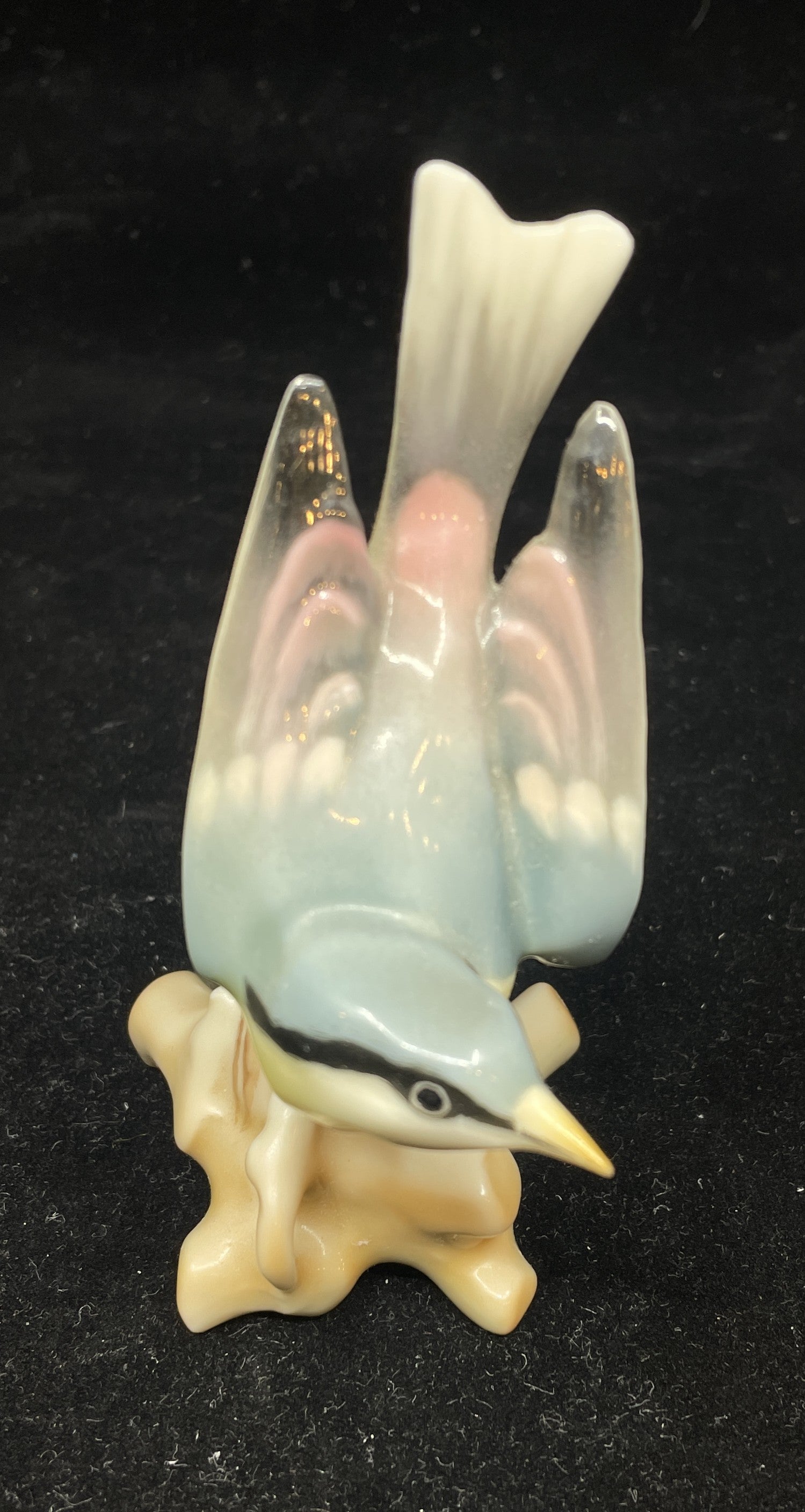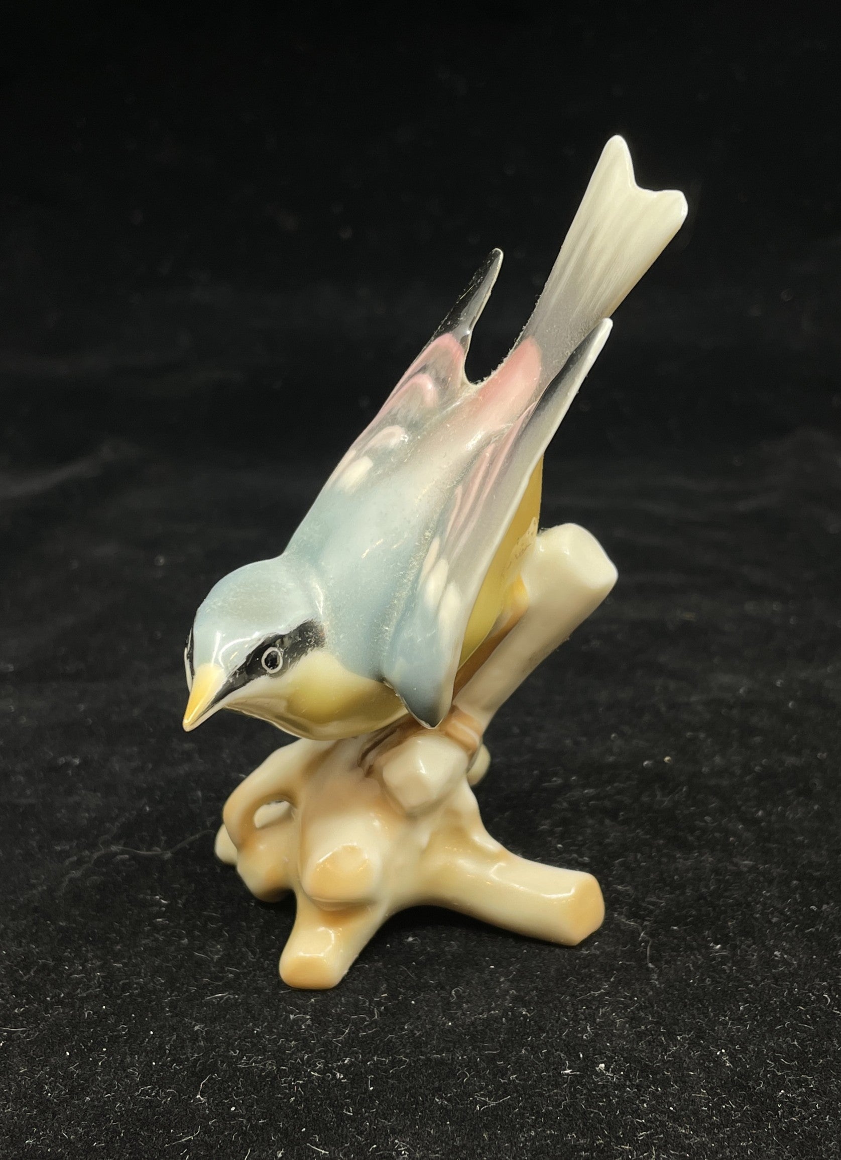 Hutschenreuther K Tutter porcelain bird on branch. This beautiful piece depicts a bird sitting on a small branch. The bird is painted in shades of blue, pink, yellow, and black, and the branch is a light brown color. The bird sits at a downward angle with its wings tucked and tail pointed towards the sky. A beautiful collector's item that's sure to elevate a setting.