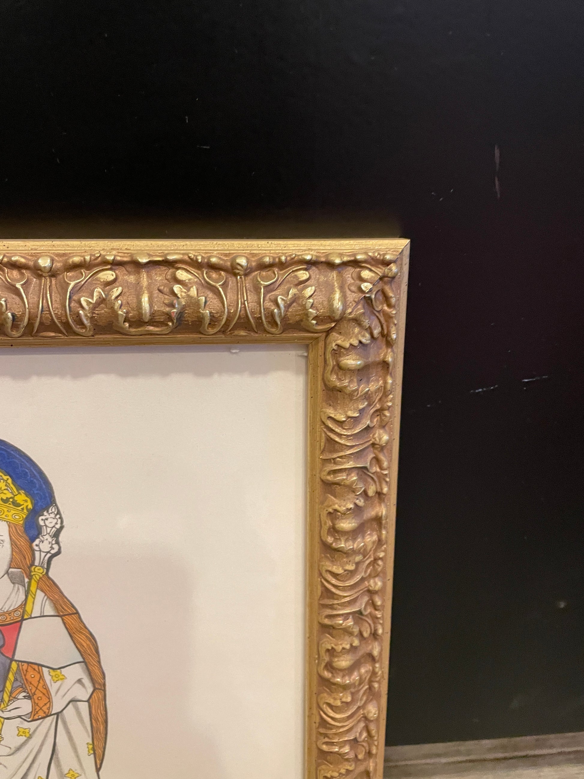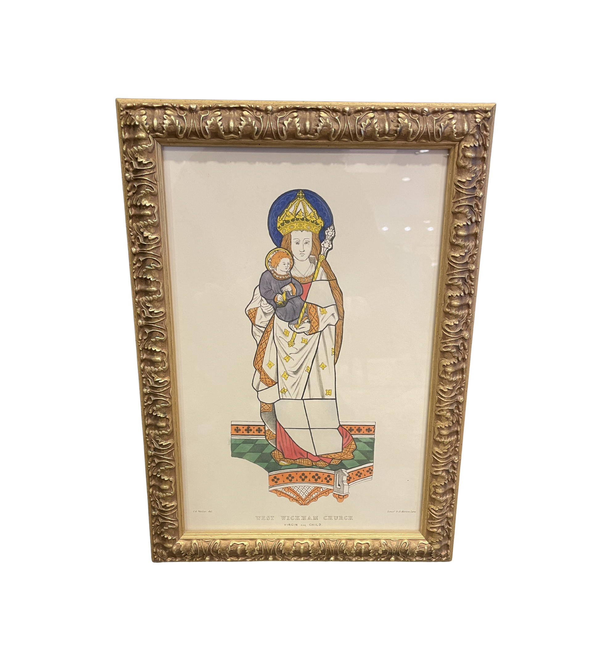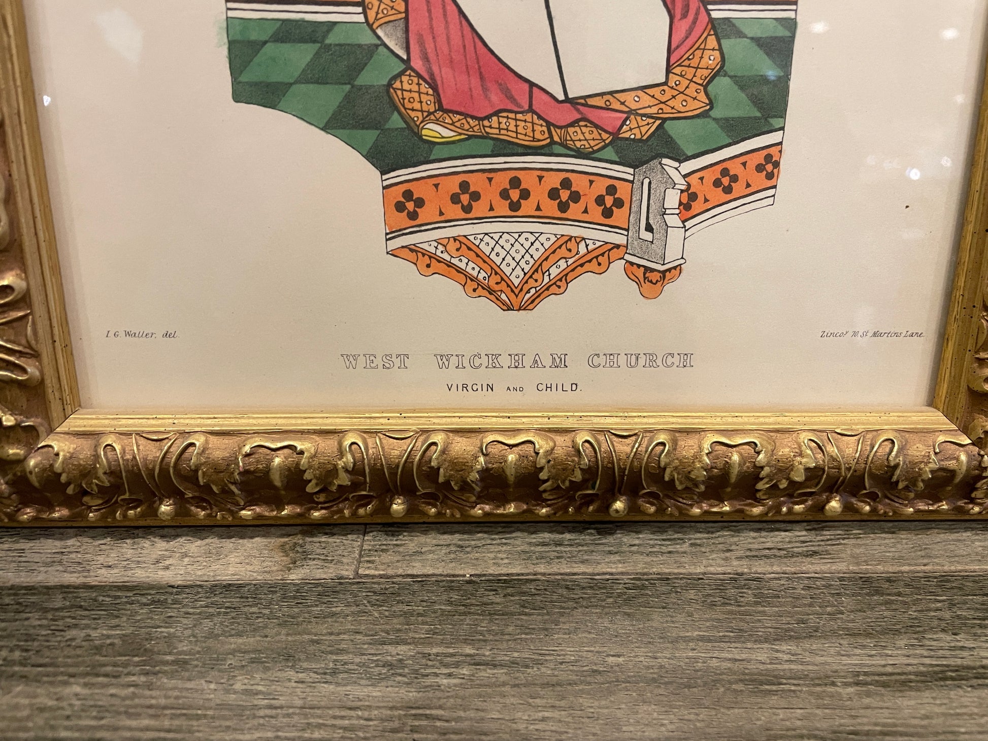 IG Waller stained glass engraving titled "Virgin and Child". Title and "West Wickham Church" marked lower center of piece. This piece depicts Mary holding a baby Jesus. Each figure has a halo around their head. This is a print of a portion of a stained glass piece. The print is set in an ornate carved gold frame. A unique addition to a space.