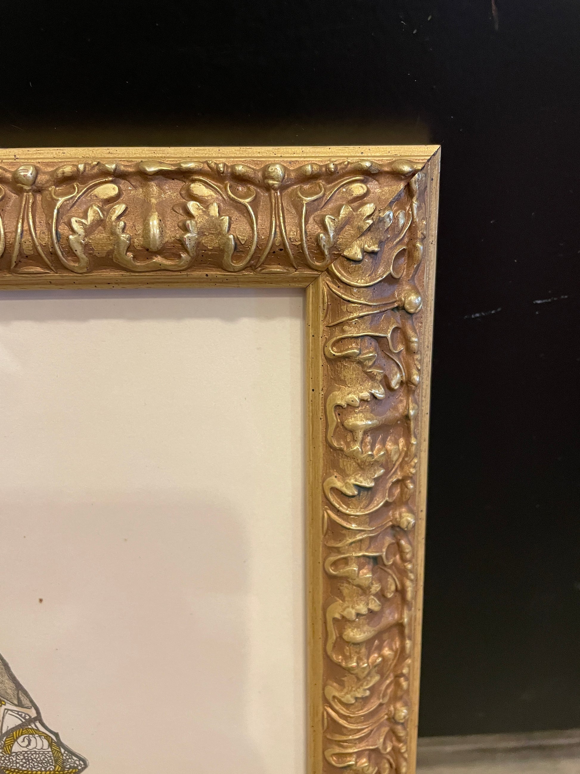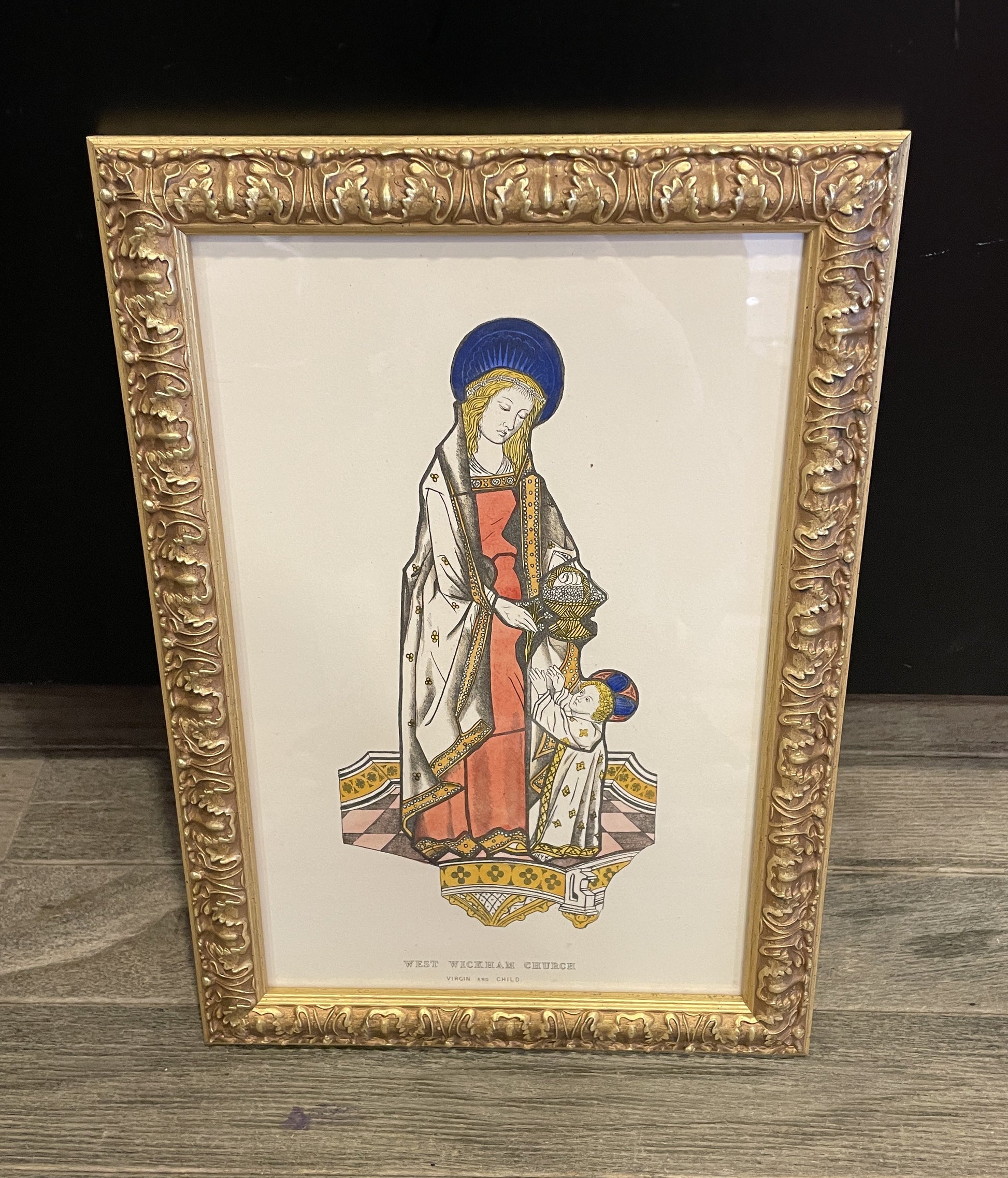 IG Waller stained glass engraving titled "Virgin and Child". Title and "West Wickham Church" marked lower center of piece. This piece depicts Mary standing with a young Jesus. Each figure has a halo around their head. This is a print of a portion of a stained glass piece. The print is set in an ornate carved gold frame. A unique addition to a space.