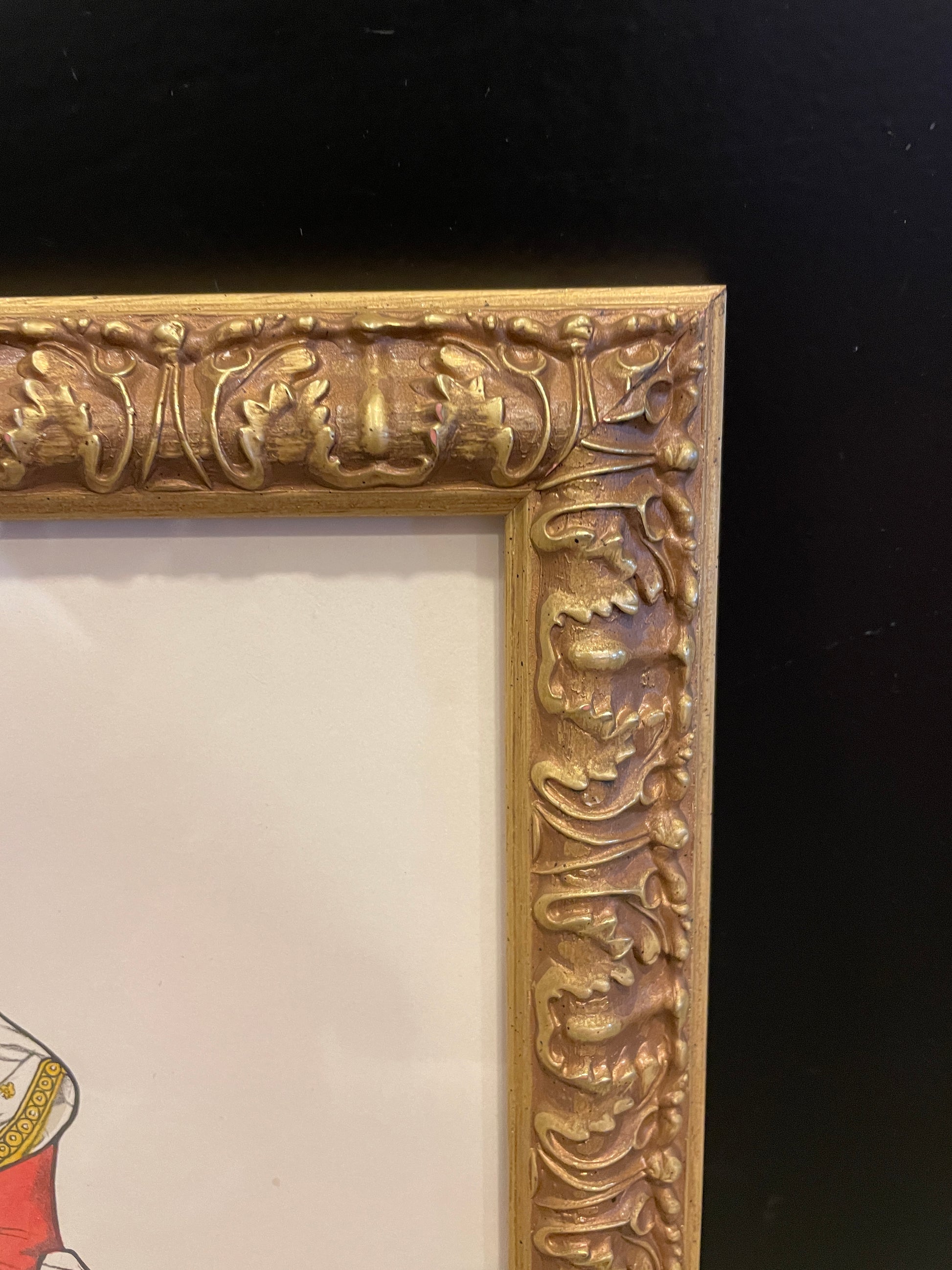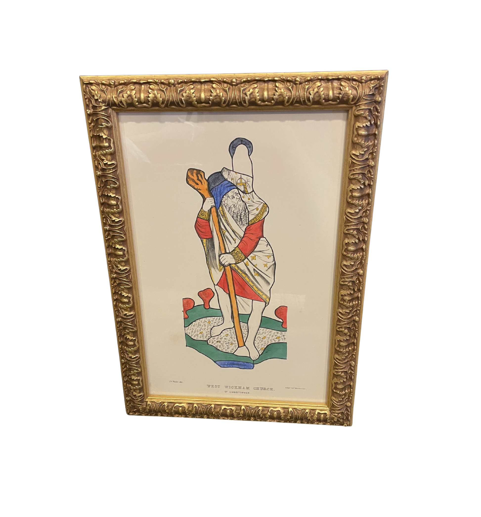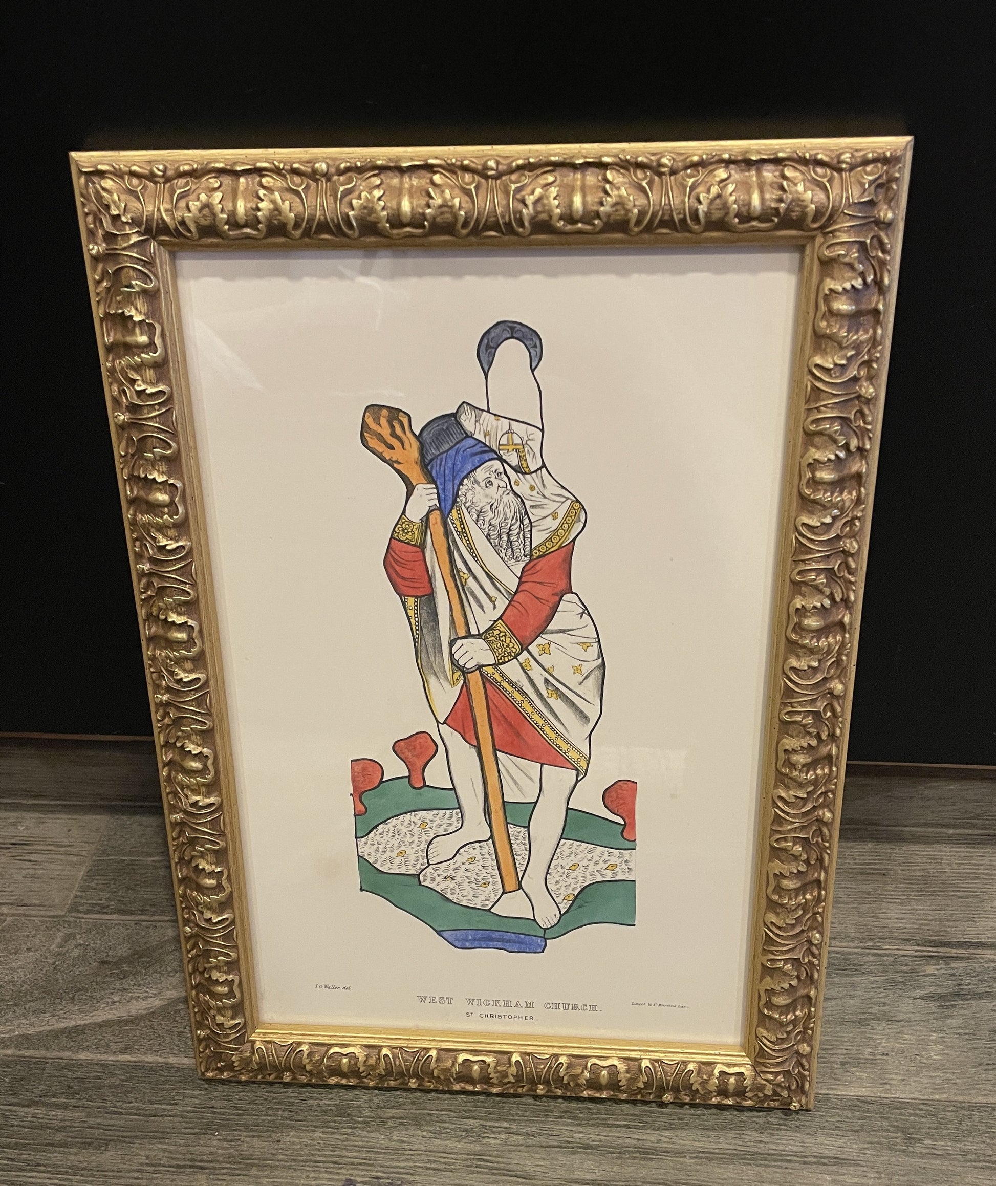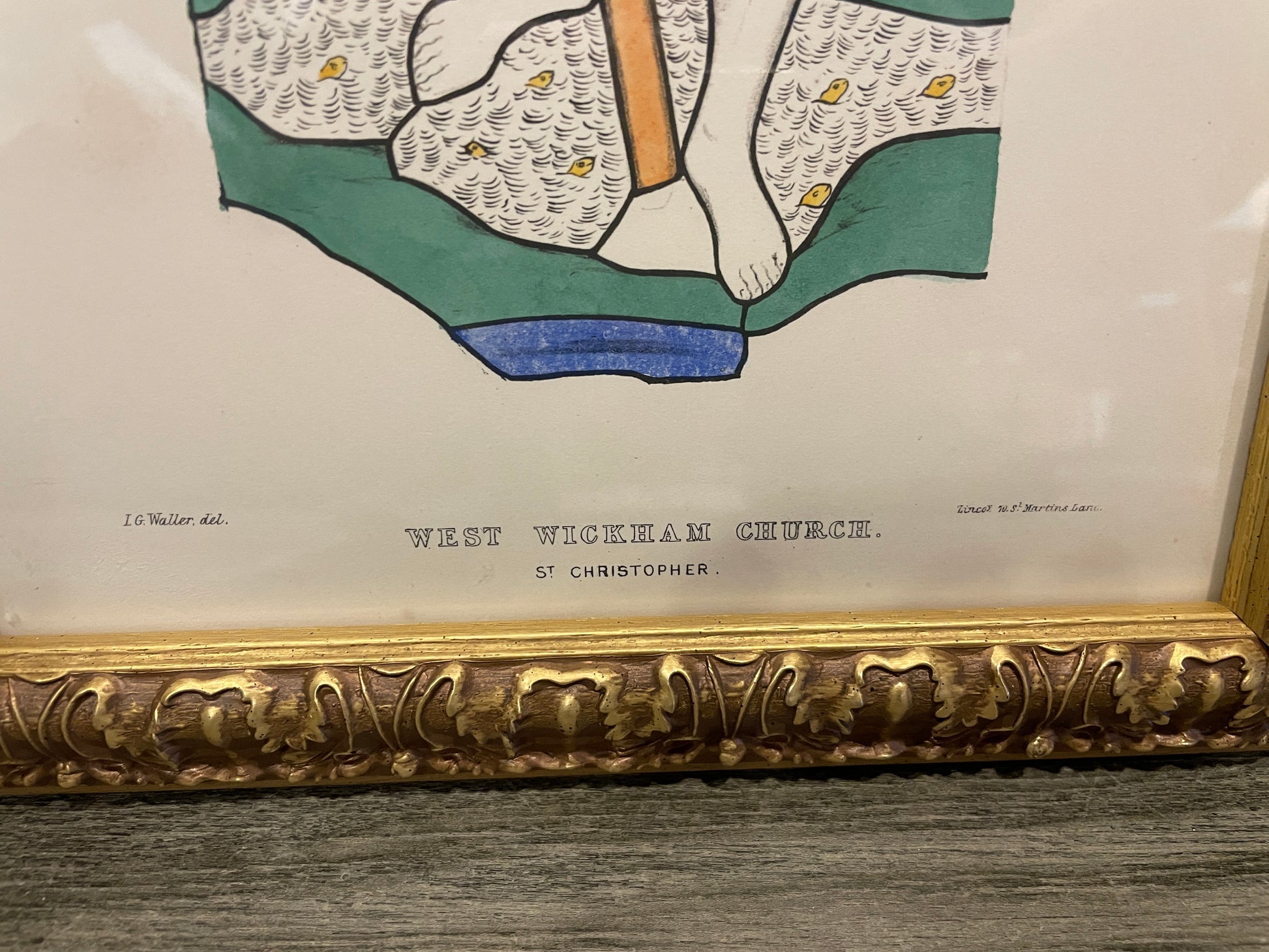 IG Waller stained glass engraving titled "St Christopher". Title and "West Wickham Church" marked lower center of piece. This piece depicts Saint Christopher standing with a staff. He is hunched over and wearing draped robes. This is a print of a portion of a stained glass piece. The print is set in an ornate carved gold frame. A unique addition to a space.