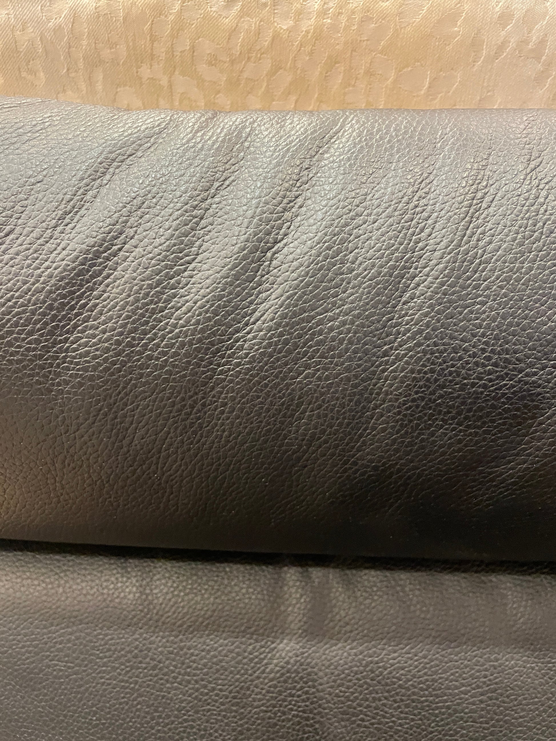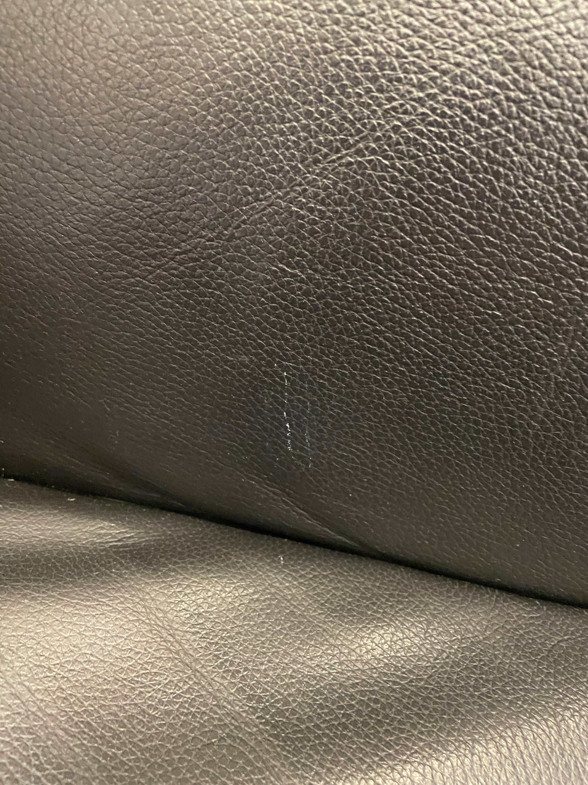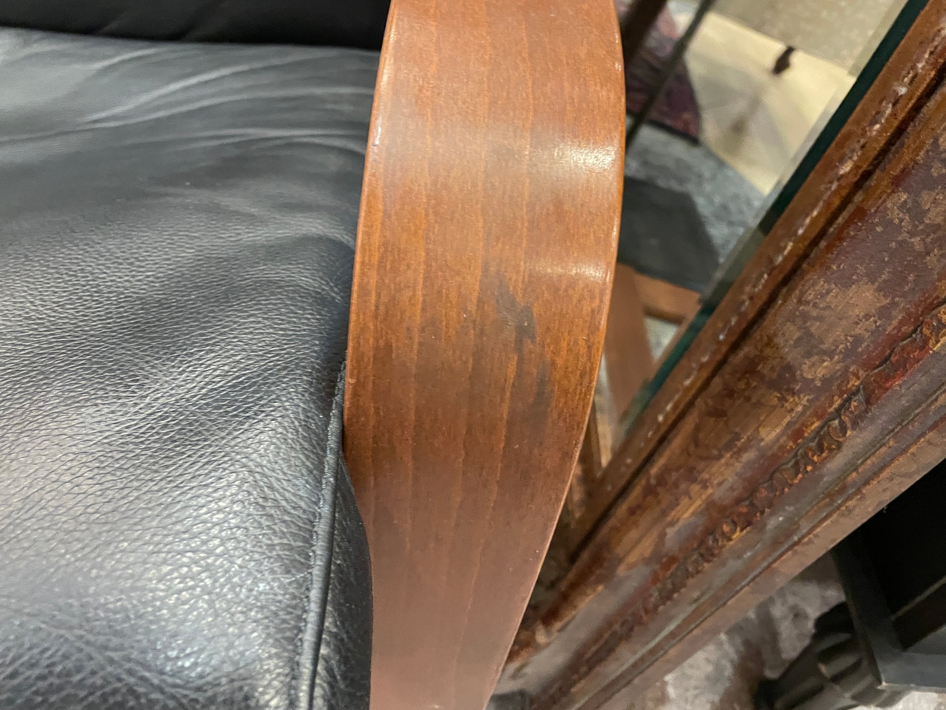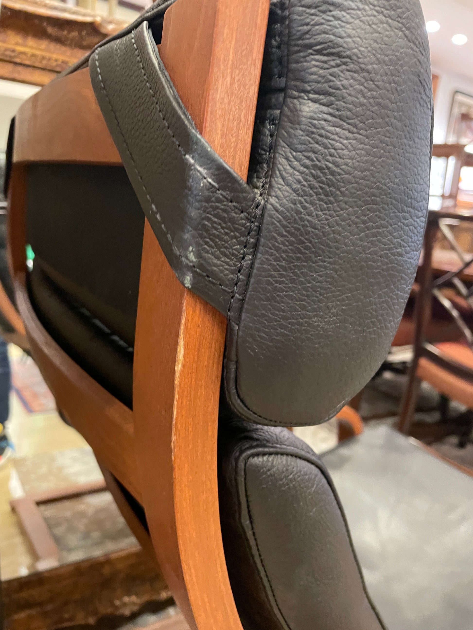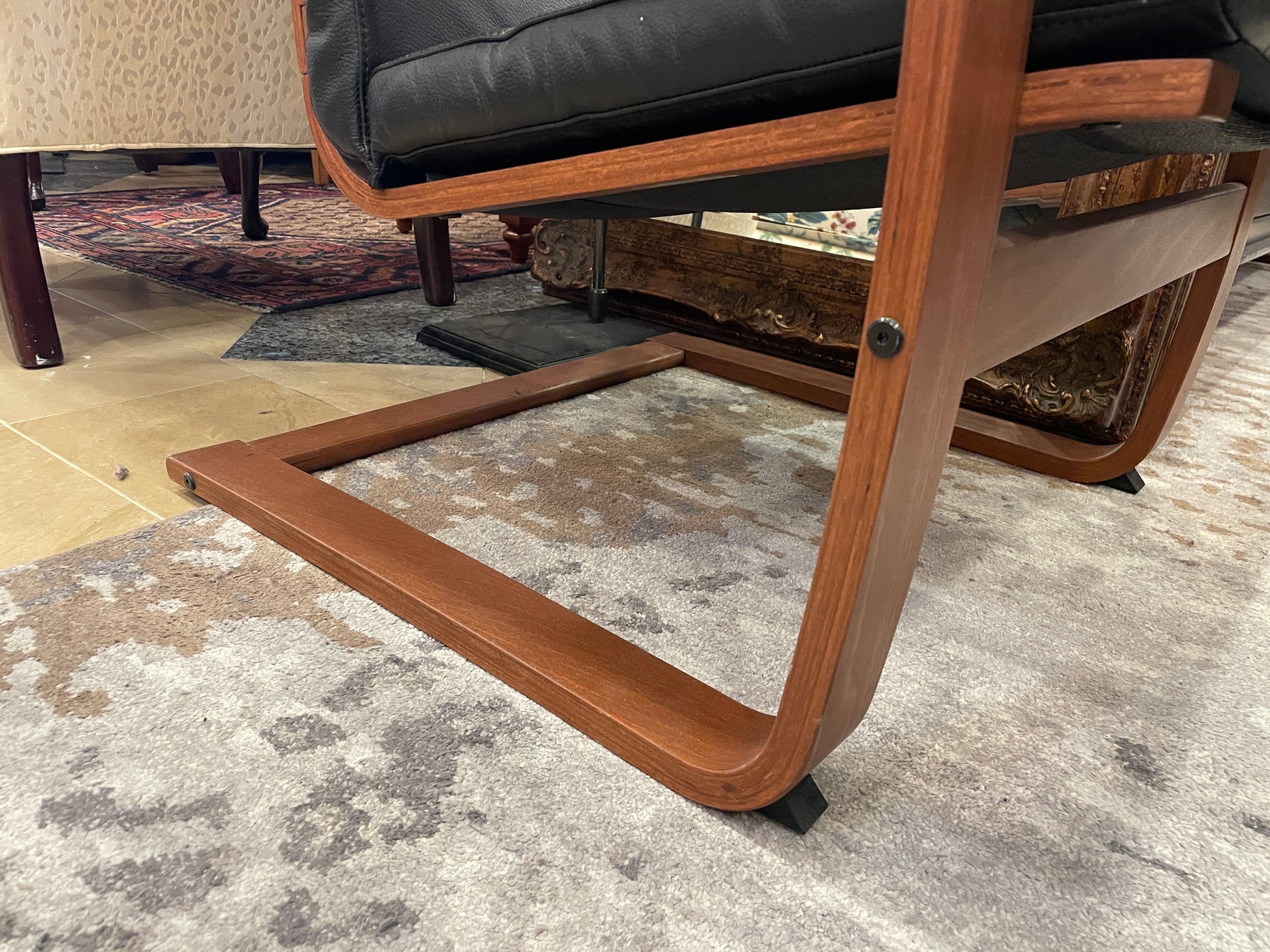 Ikea black Poang cantilever chair. This beautiful chair features a medium toned bentwood frame and black leather upholstered seat. The frame has a sleek design with a cantilever base that leads into the two arms. The back is accented by horizonal slats that allow the leather seat to peek through. The leather seat has a subtle texture to it. Atop the seat sits a cushioned headrest for added comfort. This chair is sure to elevate a space with its classic, modern design and comfortability.