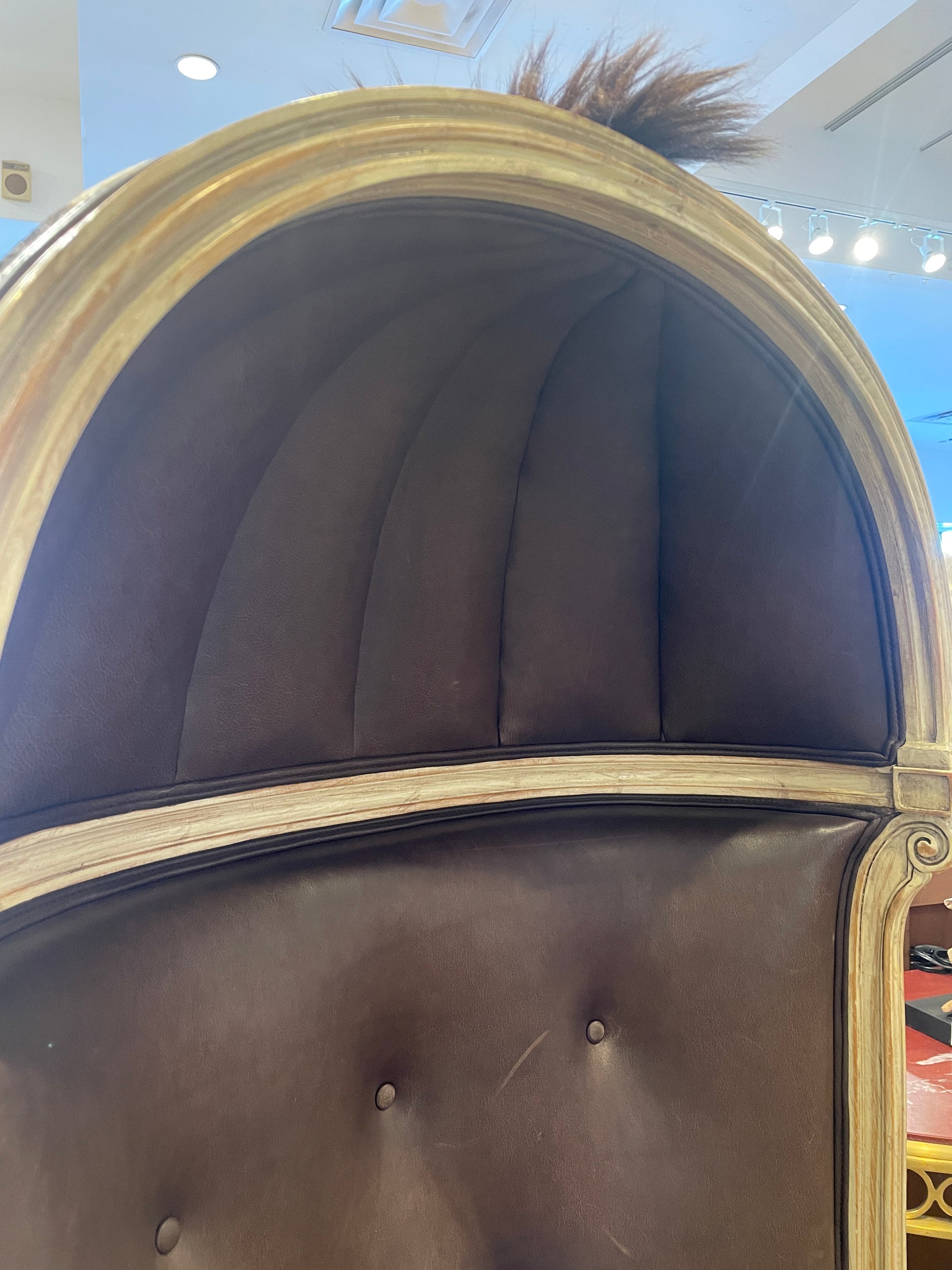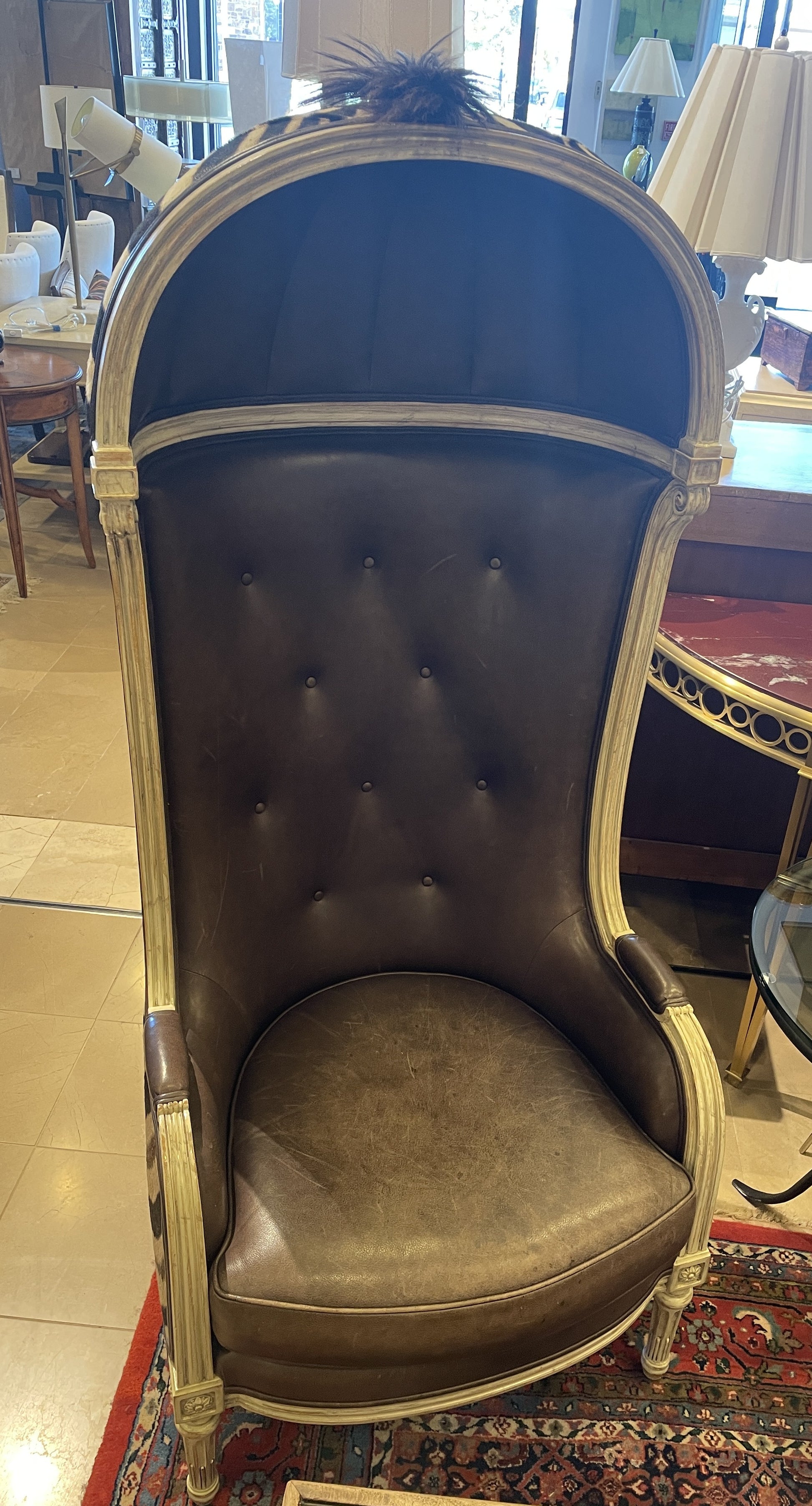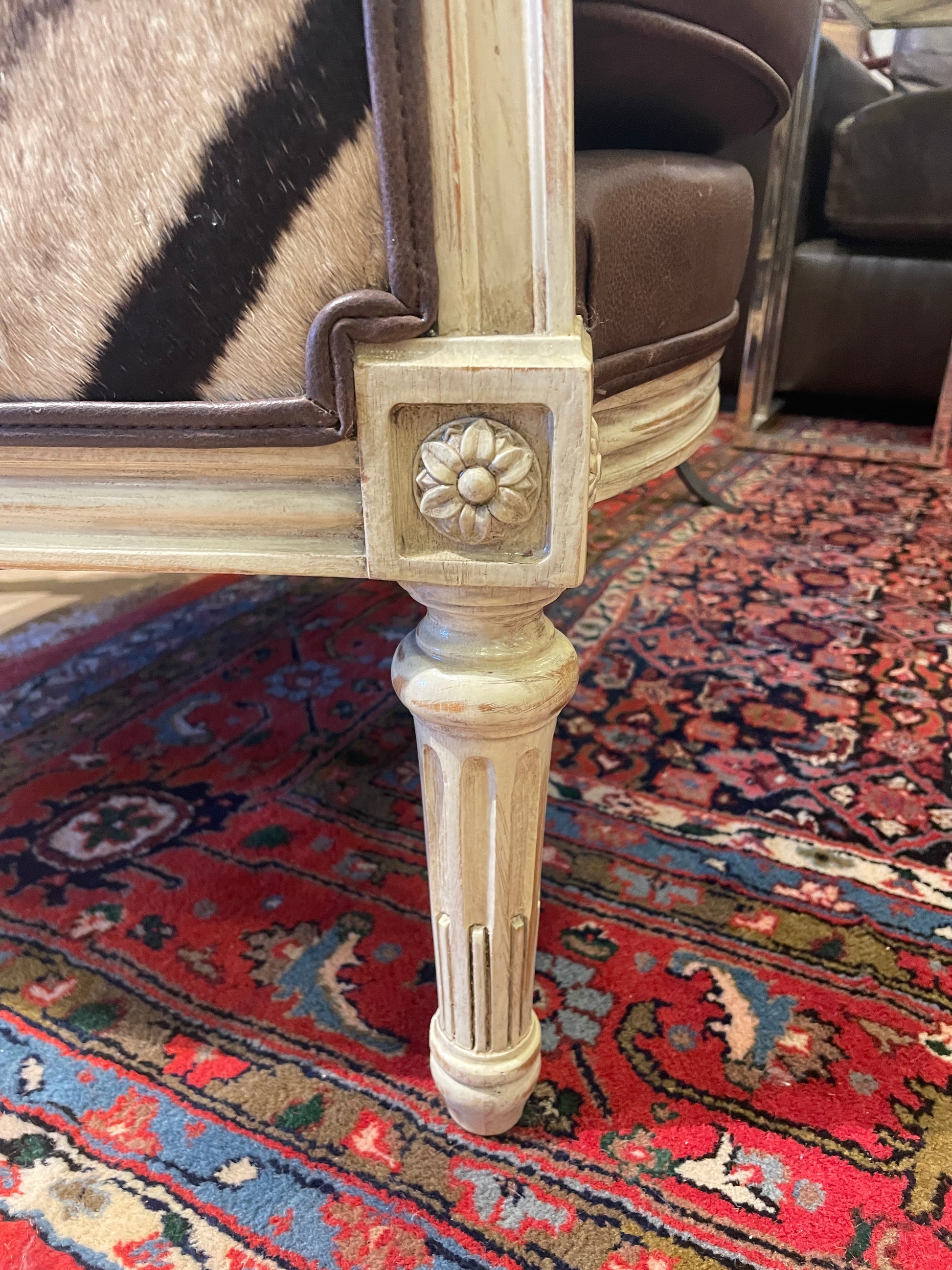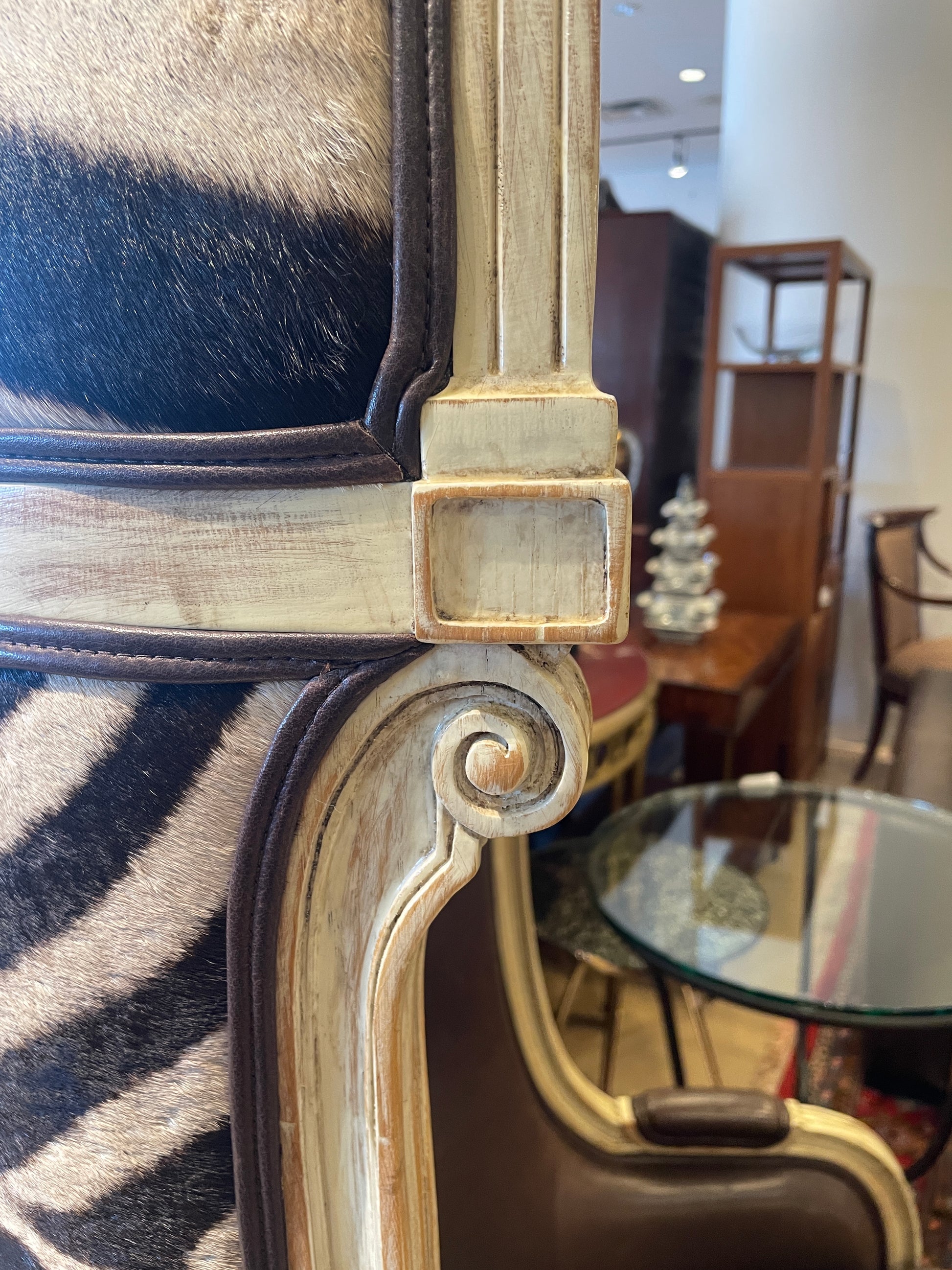 Interior crafts zebra hide and leather porter/balloon chair. This playful seat has a beautiful brown leather interior and charming zebra hide exterior. The chair is a porter or balloon style chair with a rounded back and domed top that shades a portion of the seat. The interior leather has a button tufted design, and the exterior is accented with a zebra mane down the center of the top. An off white wooden frame further elevates this piece with carved details. Short fluted legs hold the chair up off the ground This eclectic piece is sure to add character and excitement to any space.