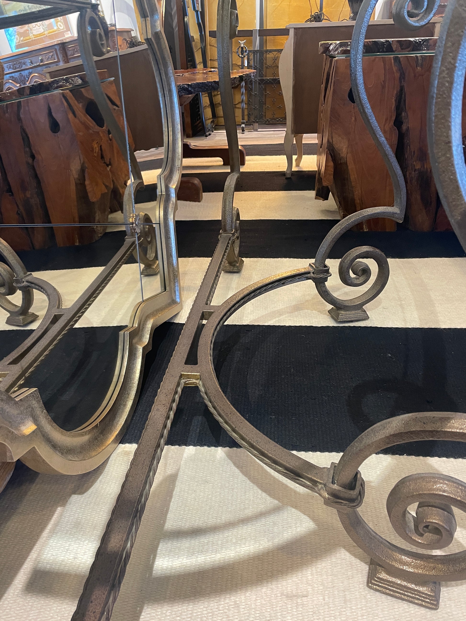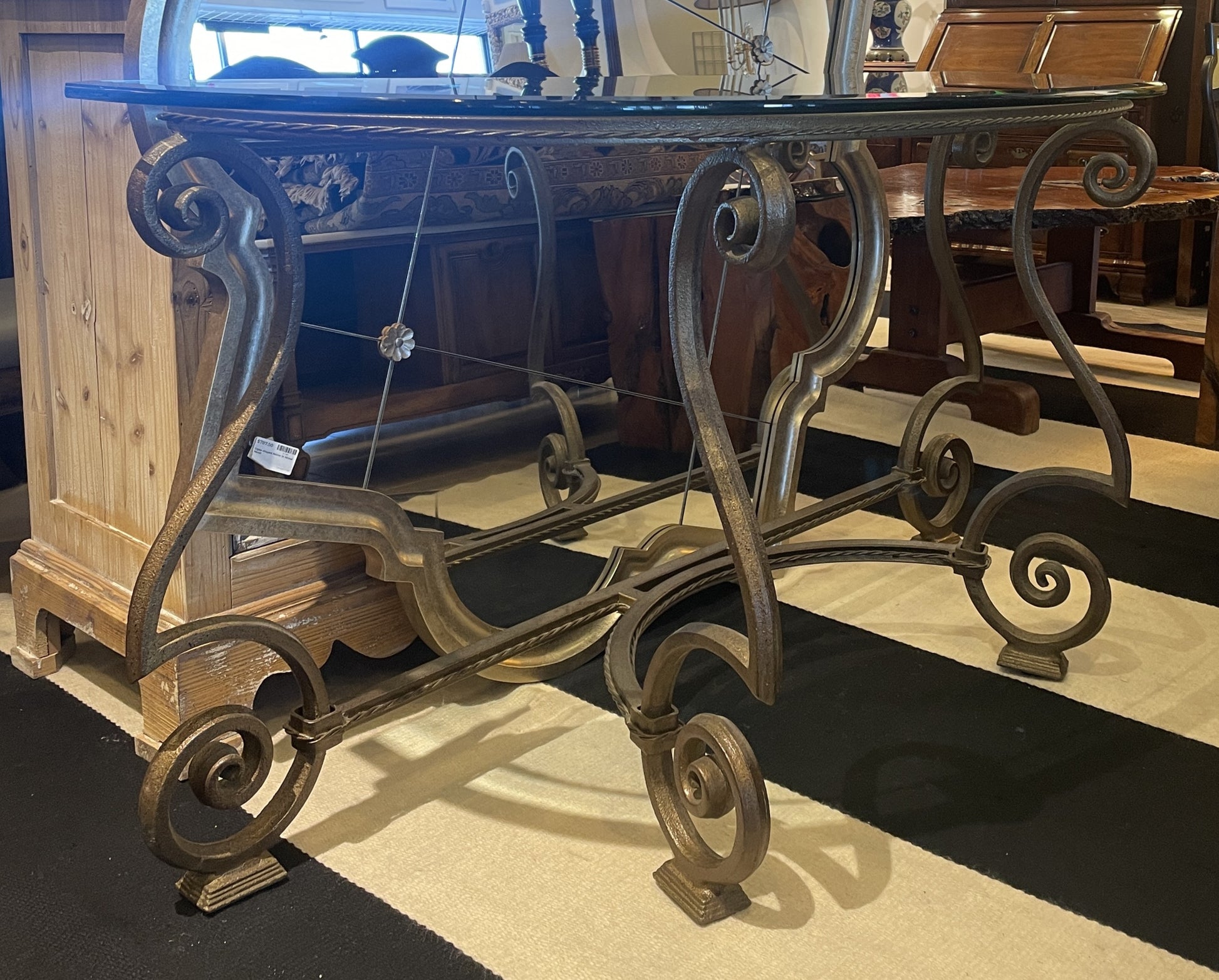 Iron and glass demilune console. This charming console features a gorgeous iron base and glass tabletop. The base is accented with scrolled details and sits on small square feet. The legs have an elegant curve and a stretcher connects them all. The tabletop is a glass semicircle shape that rests on a support that has a twisted accent on its side. An elegant piece that would pair beautifully behind a sofa.