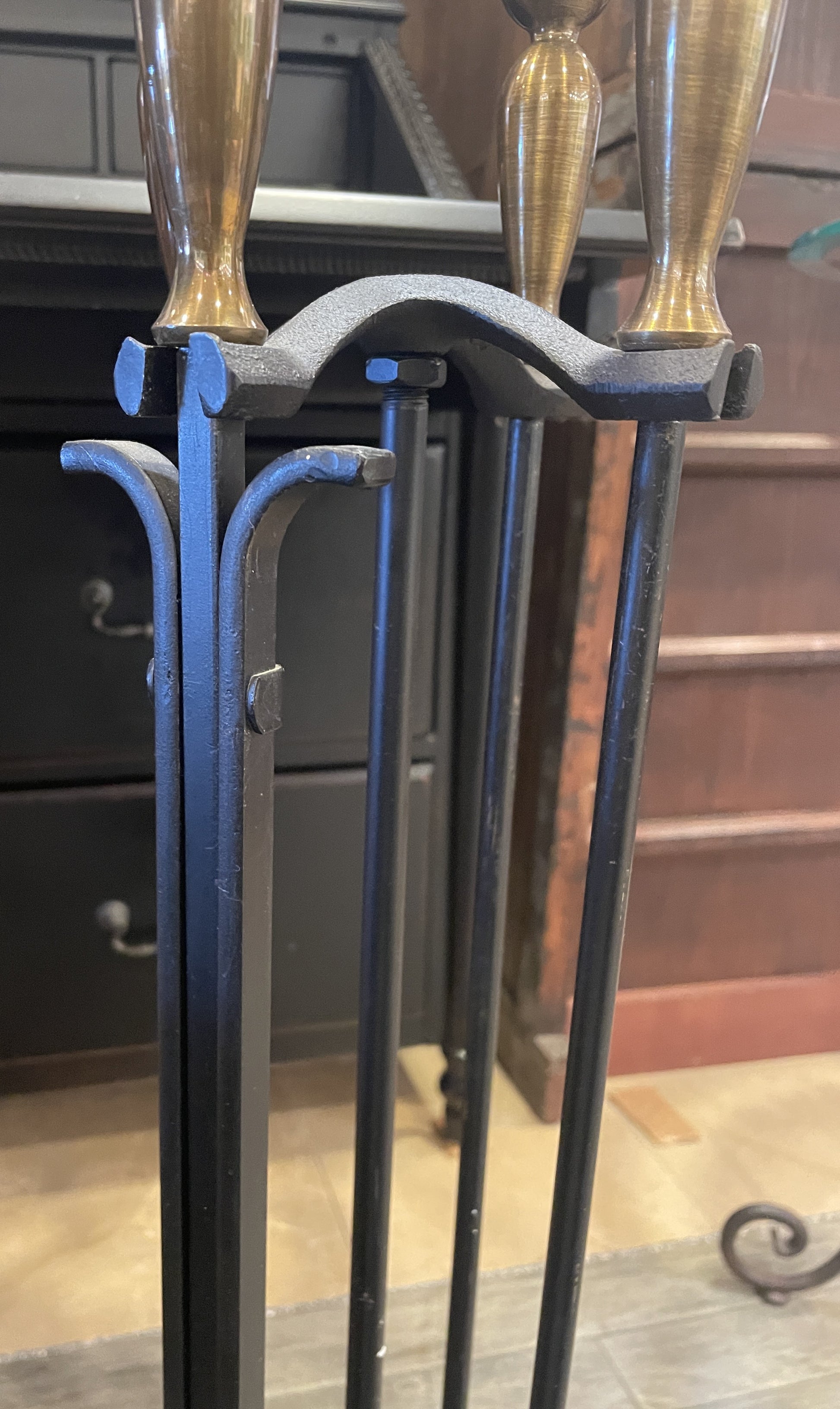 Classic iron fireplace tools. This set of four fireplace tools features a brush, tongs. shovel, and poker. They are crafted out of black iron, and are capped with a brass colored handle that has a large spherical accent on the very end. The tools rest in a matching stand with a circular base and small bronze guard rail. An elegant and timeless set of fireplace tools that is sure to add a touch of luxury to a fireplace setting.