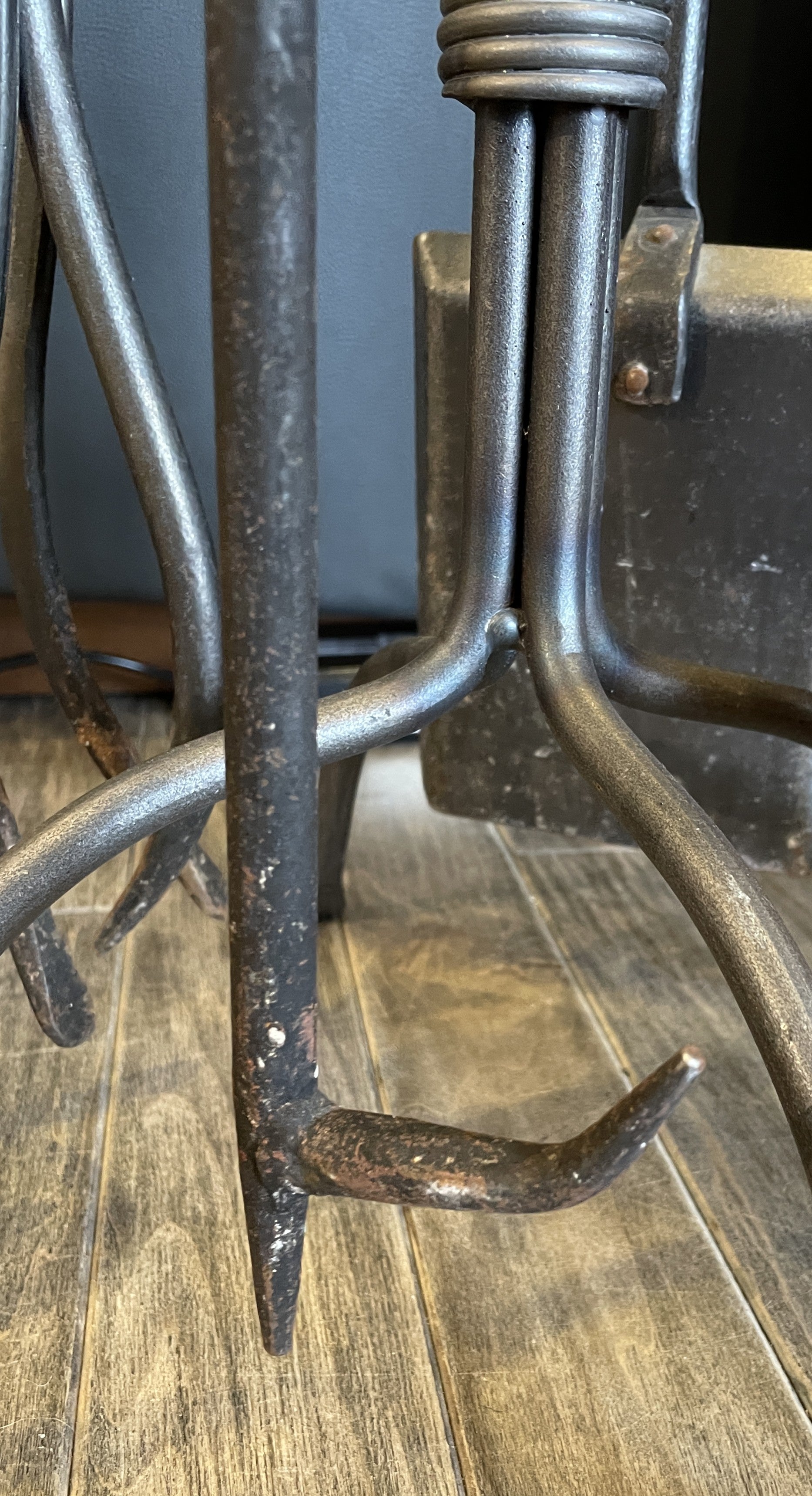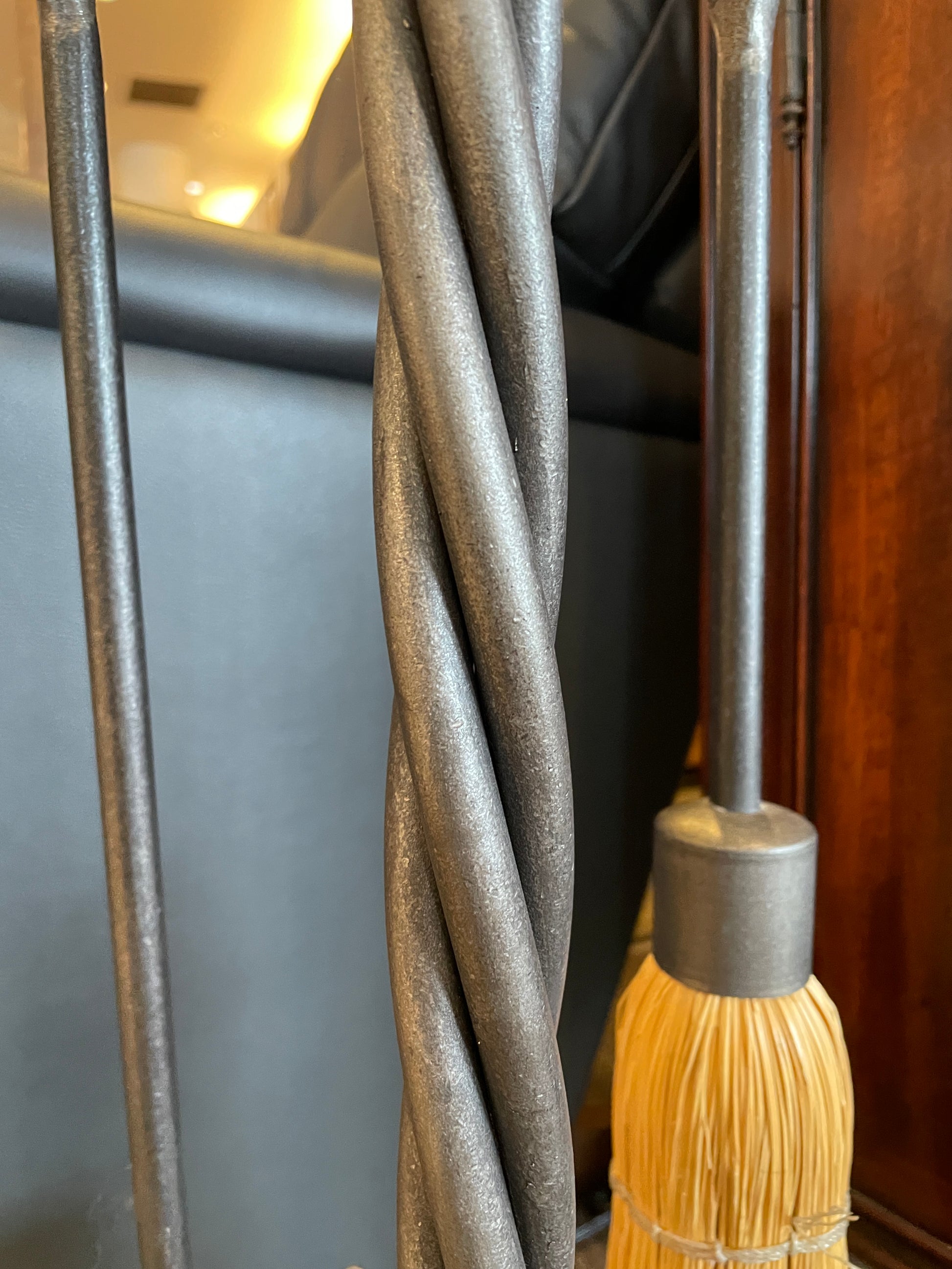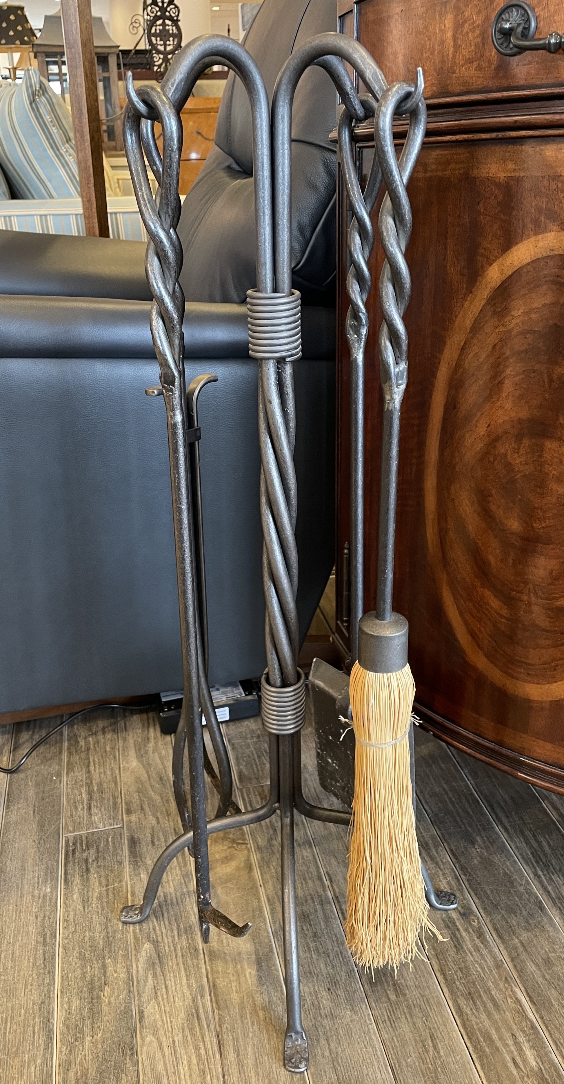 Set of wrought iron fireplace tools. Each tool hangs on a center set of hooks with curved feet. The tools and stand feature a dark iron color with a twisted design. A perfect and practical piece to place at your hearth!