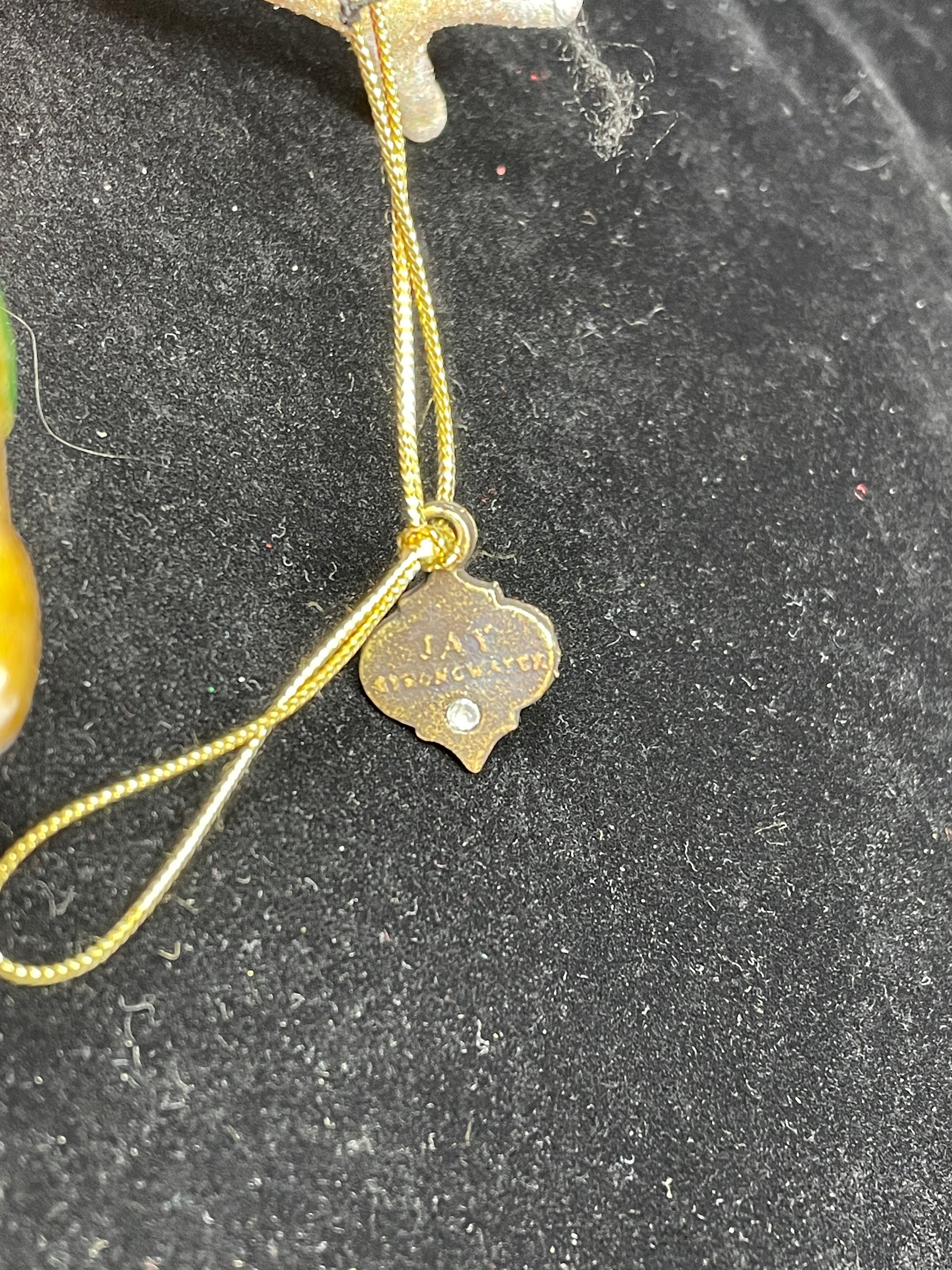 Jay Strongwater Donner reindeer ornament. This beautiful hand-painted, hand-blown glass ornament depicts Donner, one of Santa's reindeer. Donner is in the middle of a leap with his front hooves up. He is a beautiful tan color and is adorned with red white and green details including a saddle, reins, and ornaments. His antlers are covered with sparkling white glitter, and more glittering details are sprinkled throughout. Further, the ornament is accented with stunning Swarovski crystals. The bottom of the ornament displays Donner's name in gold lettering, and so does the magenta ribbon hanging from the ornament loop. A charming ornament sure to bring Christmas cheer to any tree.