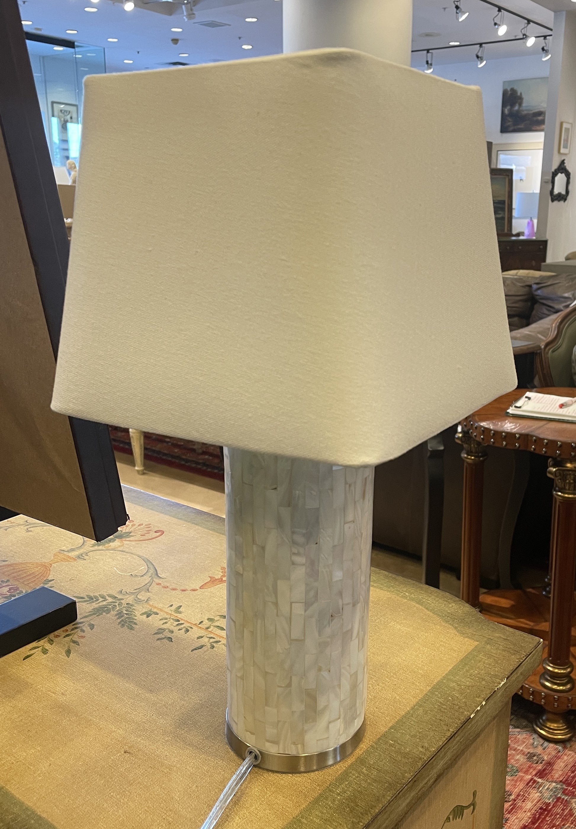 Jamie Young mother of pearl table lamp. This elegant little table lamp is sure to catch eyes. Its cylindrical vase sits on a thin silver colored base. The perimeter of the vase is adorned with small rectangular mother of pearl panels. Atop the vase sits a white square shade with a slight taper. A beautiful lamp with a subtle yet charming design.