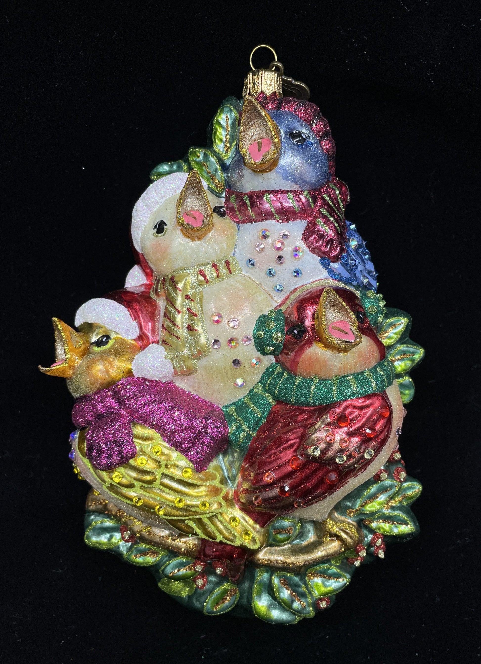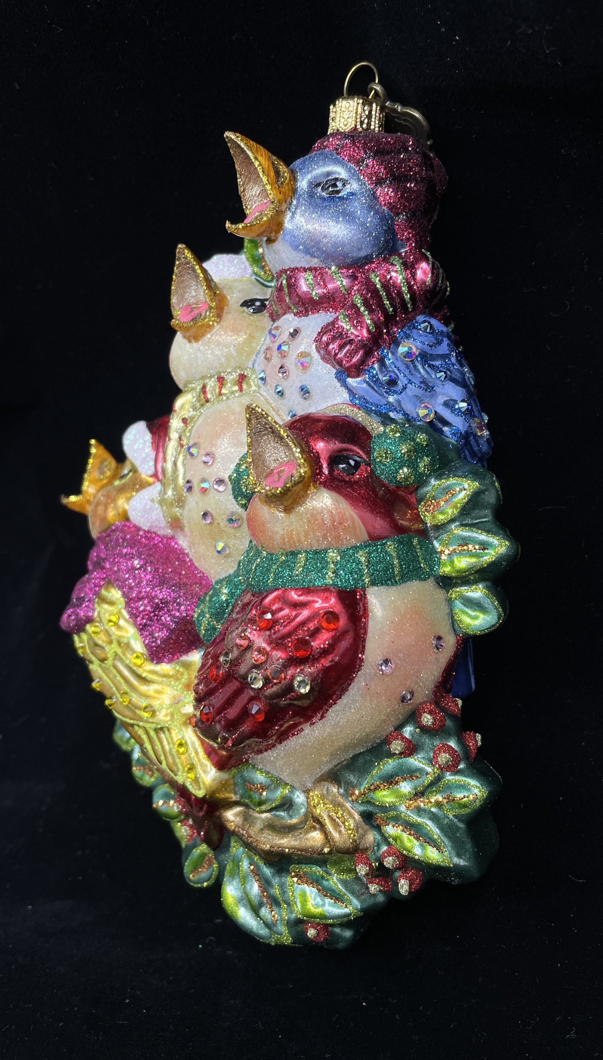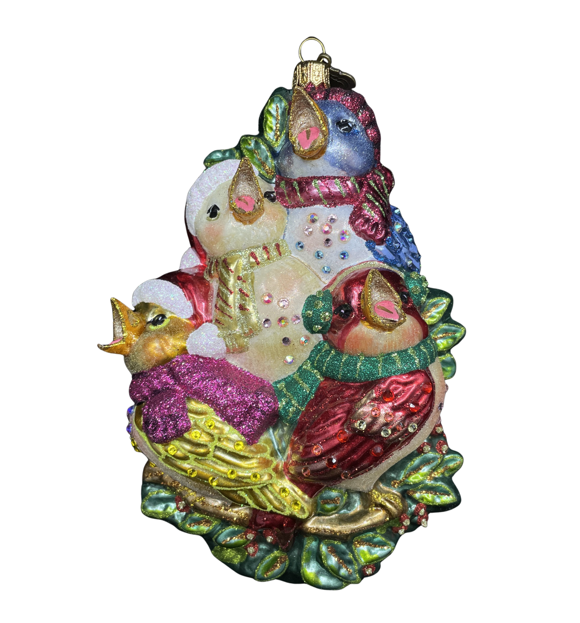 Jay Strongwater four calling birds ornament. This beautiful hand-painted, hand-blown glass ornament displays the four calling birds from the iconic Christmas tune The Twelve Days of Christmas. The birds are dressed in cozy hats and scarves. Two of the birds have Santa hats, one has a beanie, and the last is wearing ear muffs. Each bird is a different color and a slightly different design, but all of them have their beaks open and pointed upwards as though they are singing. The birds in blue, white, red, and yellow are adorned with sparkling details and stunning Swarovski crystals in a rainbow of colors. The other details include purple and green details on top of the other colors already included. The birds sit on a branch of leaves. A playful ornament that is sure to brighten up any tree.