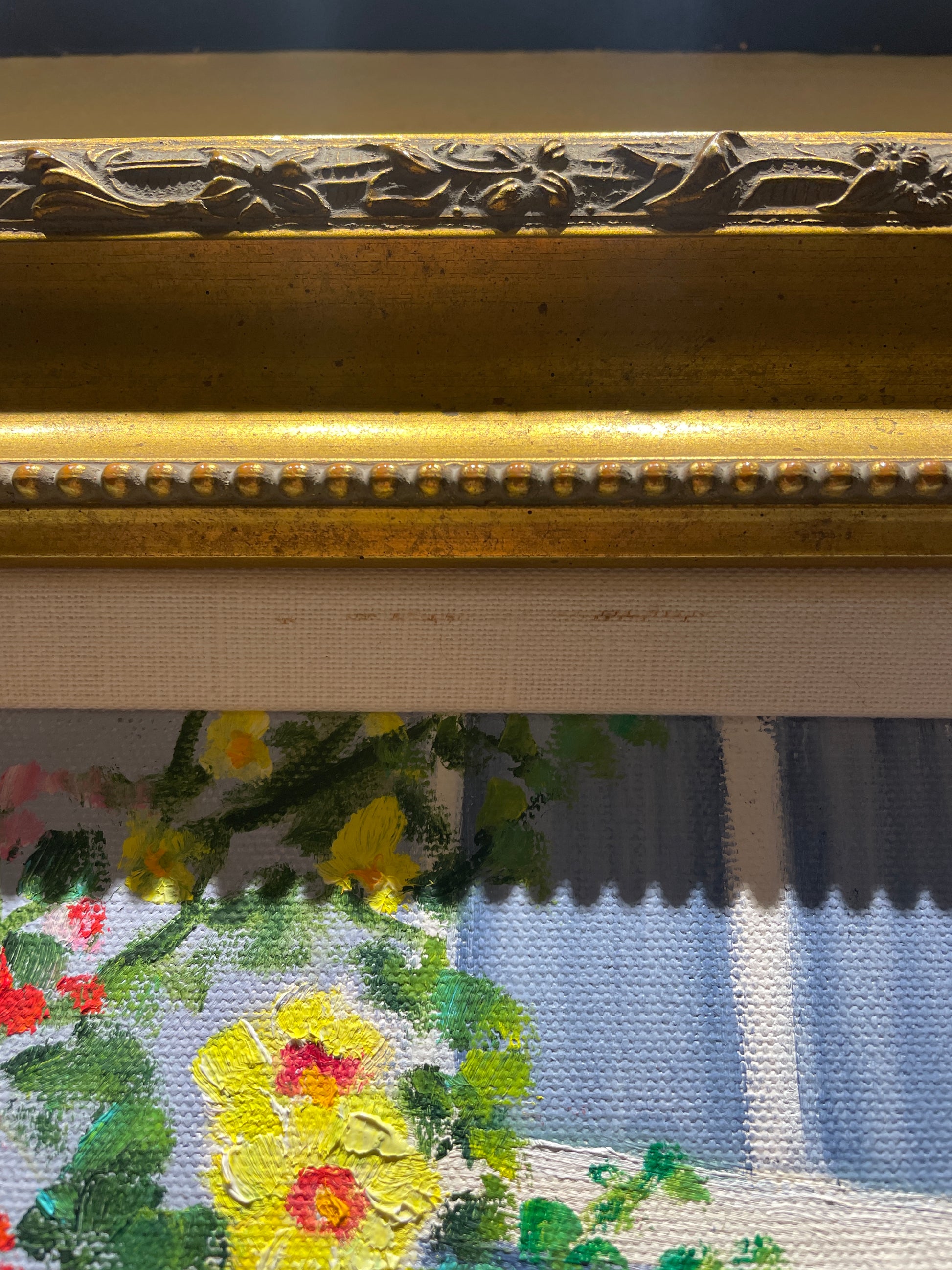 Jeanette Wittenberg oil on canvas painting of a garden with a bay window. Signed lower right. This beautiful painting features a home enveloped in vibrant flowers. The bay window of the home peeks out just slightly, covered on all sides by foliage. The flowers include mostly shades of pink, blue, and purple with pops of yellow. The piece is held in a gilt carved frame with a thin cream colored fabric band on the inner edge. A beautiful piece full of vibrant colors that is sure to add brightness to a room.
