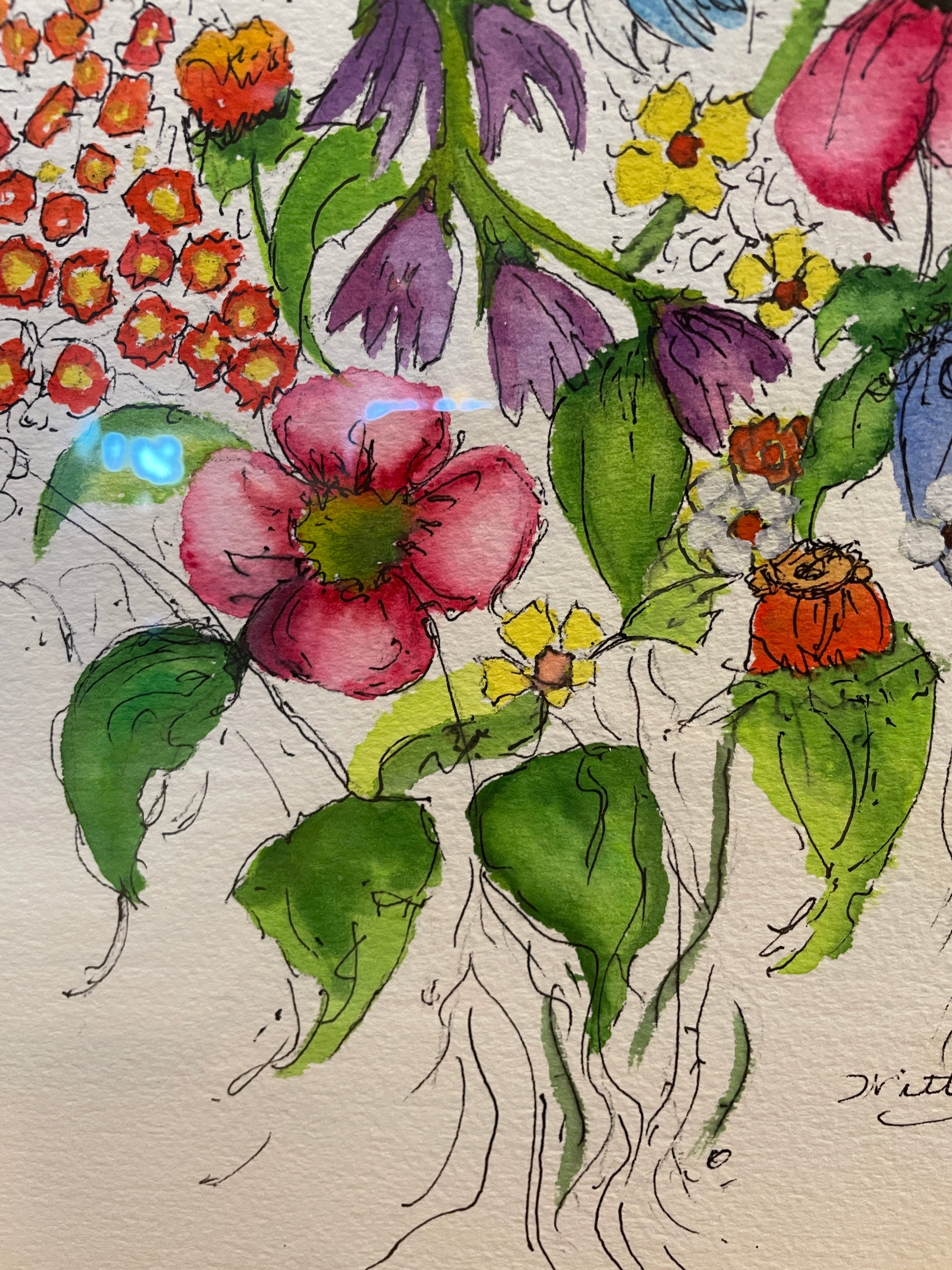 Jeanette Wittenberg watercolor bouquet of flowers. Signed lower right. This beautiful piece features pen drawn flowers colored with vibrant watercolors. The bouquet includes various wildflowers of varying shapes and sizes. A handful of flourishing green leaves sit at the bottom of the piece. The artwork is set on a cream colored mat and held in an ornate carved metallic champagne colored frame. A beautiful piece that is sure to add a pop of vibrance and life to any space.