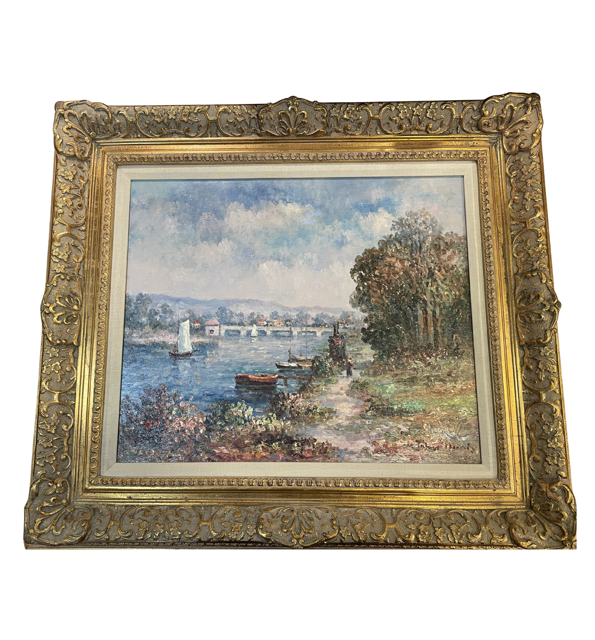 John Moris (Clymer) impressionist oil painting. This composition is signed in the lower right. It is a beautiful landscape of a waterfront view. The river scene includes a variety of small boats and is dappled with the essence of light and color. The artwork is paired with an ornate decorative gold frame. This beautiful piece adds an impressionist touch to a space.
