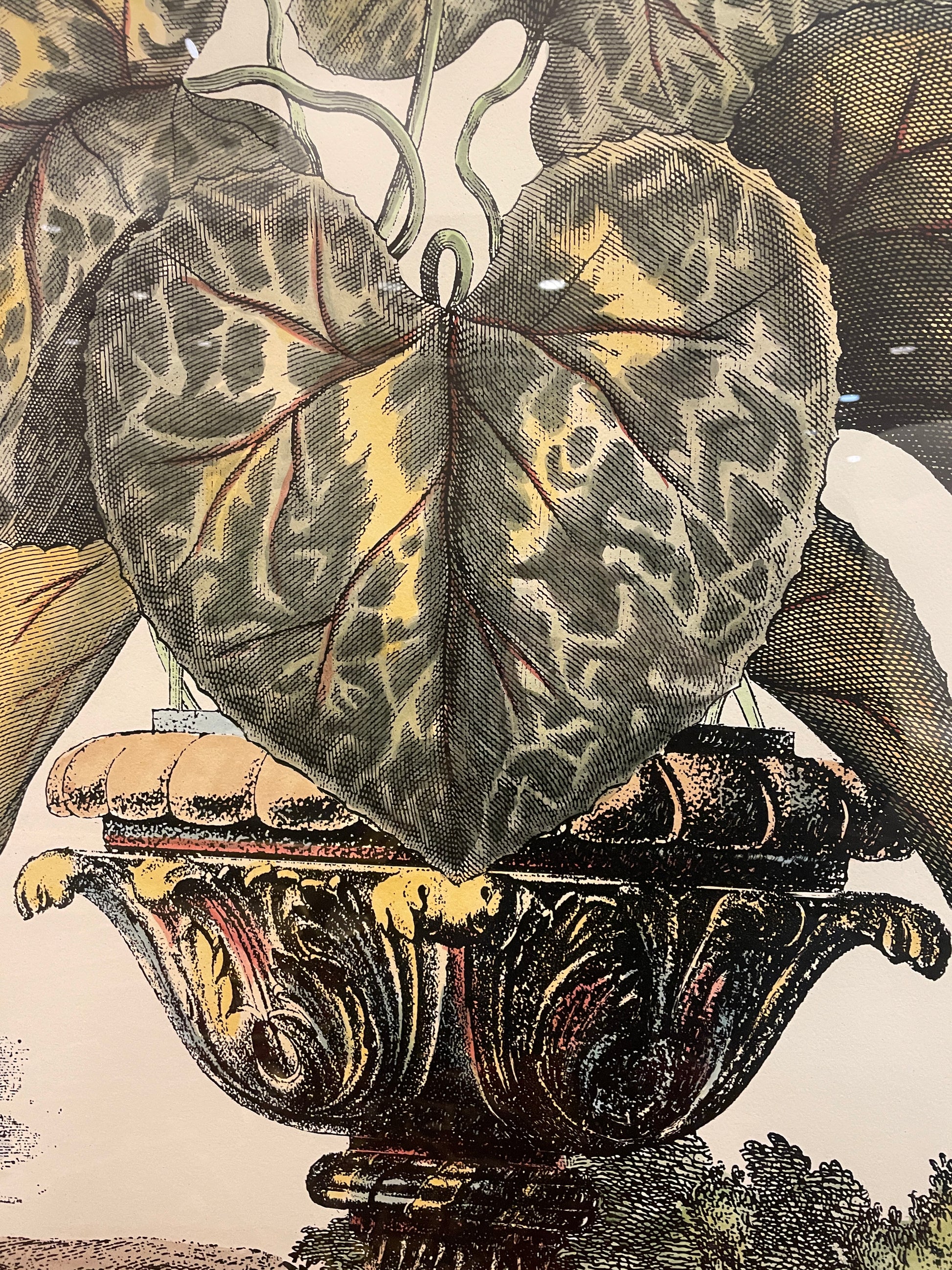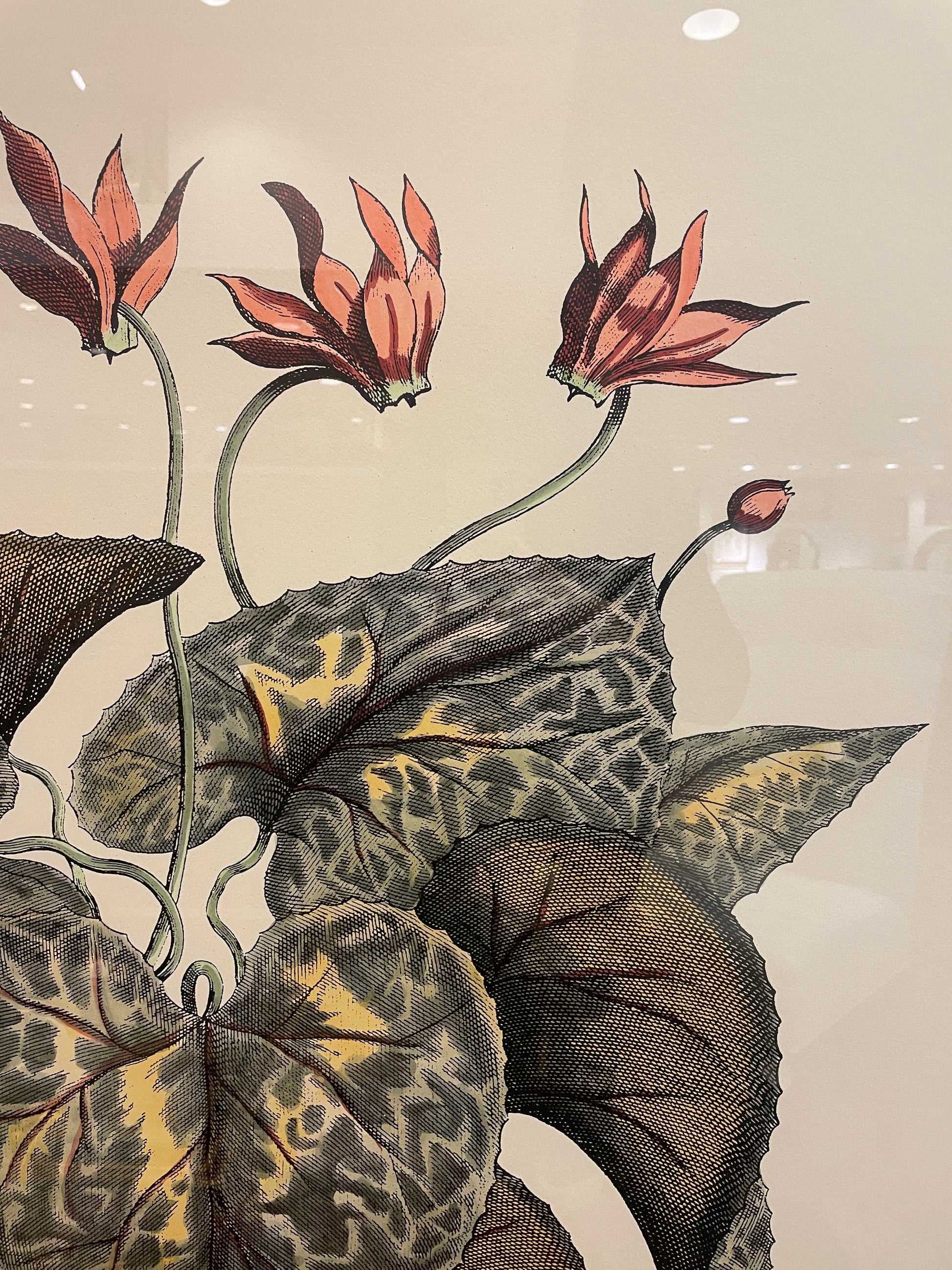 John Richard extra large botanical. This beautiful work of art is a reproduction of a botanical engraving. The huge piece depicts a cyclamen in a planter that sits in front of a simple landscape. The plant has many large, green, heart-shaped leaves, four small pink flowers and two buds on slender stems. The planter is intricately detailed with leaf-like scrolled details. The piece is set on a black mat and held in an ornate carved gilt frame. A charming botanical piece with a showstopping size and beautiful understated color palette.