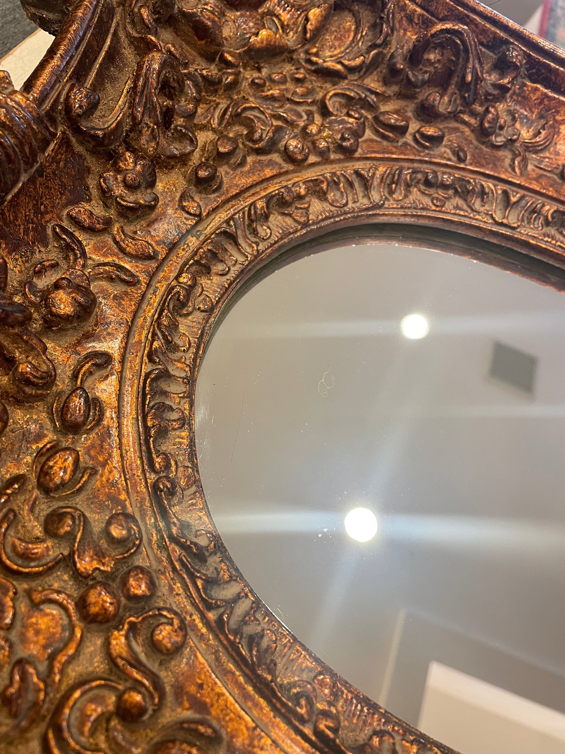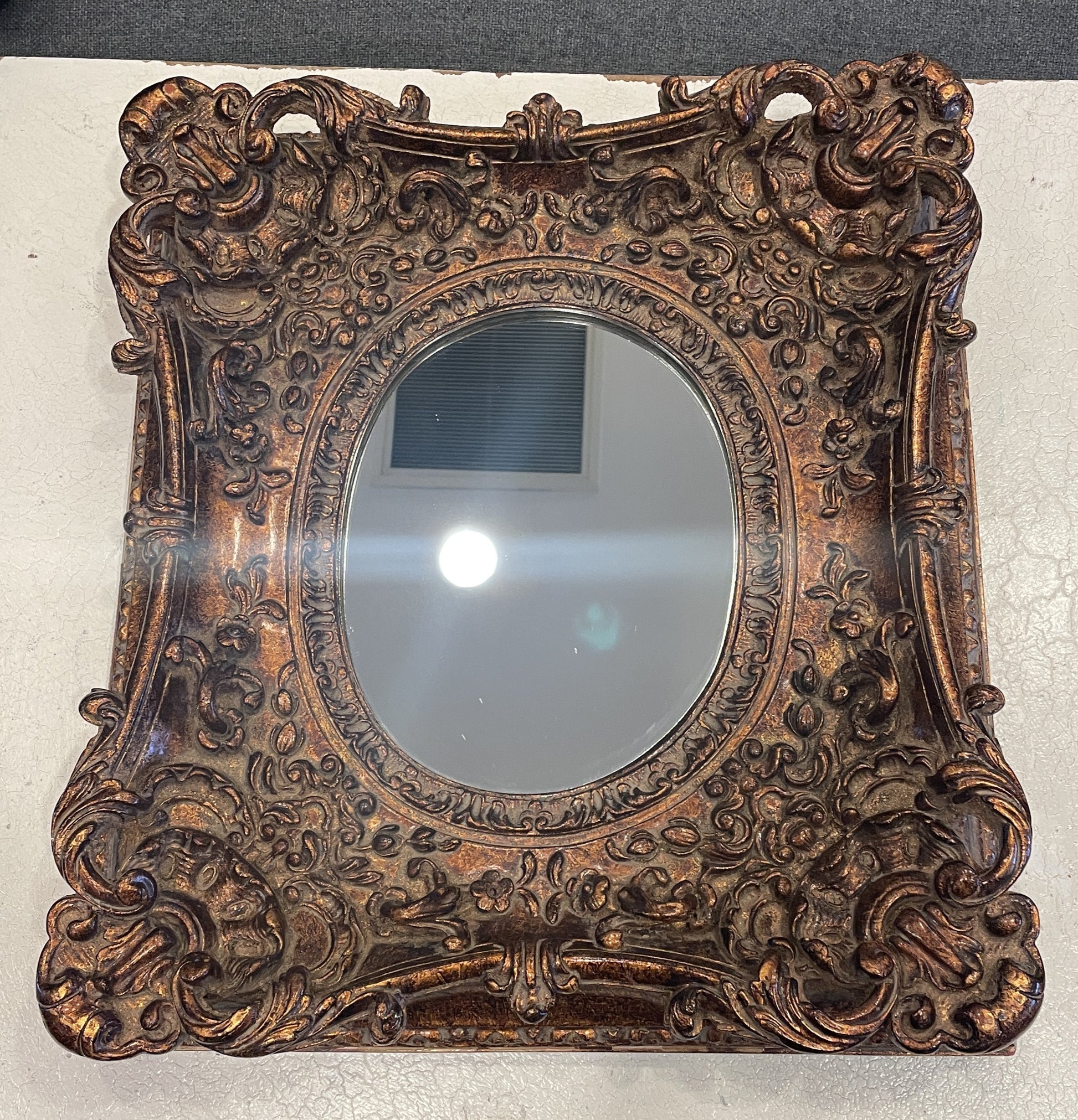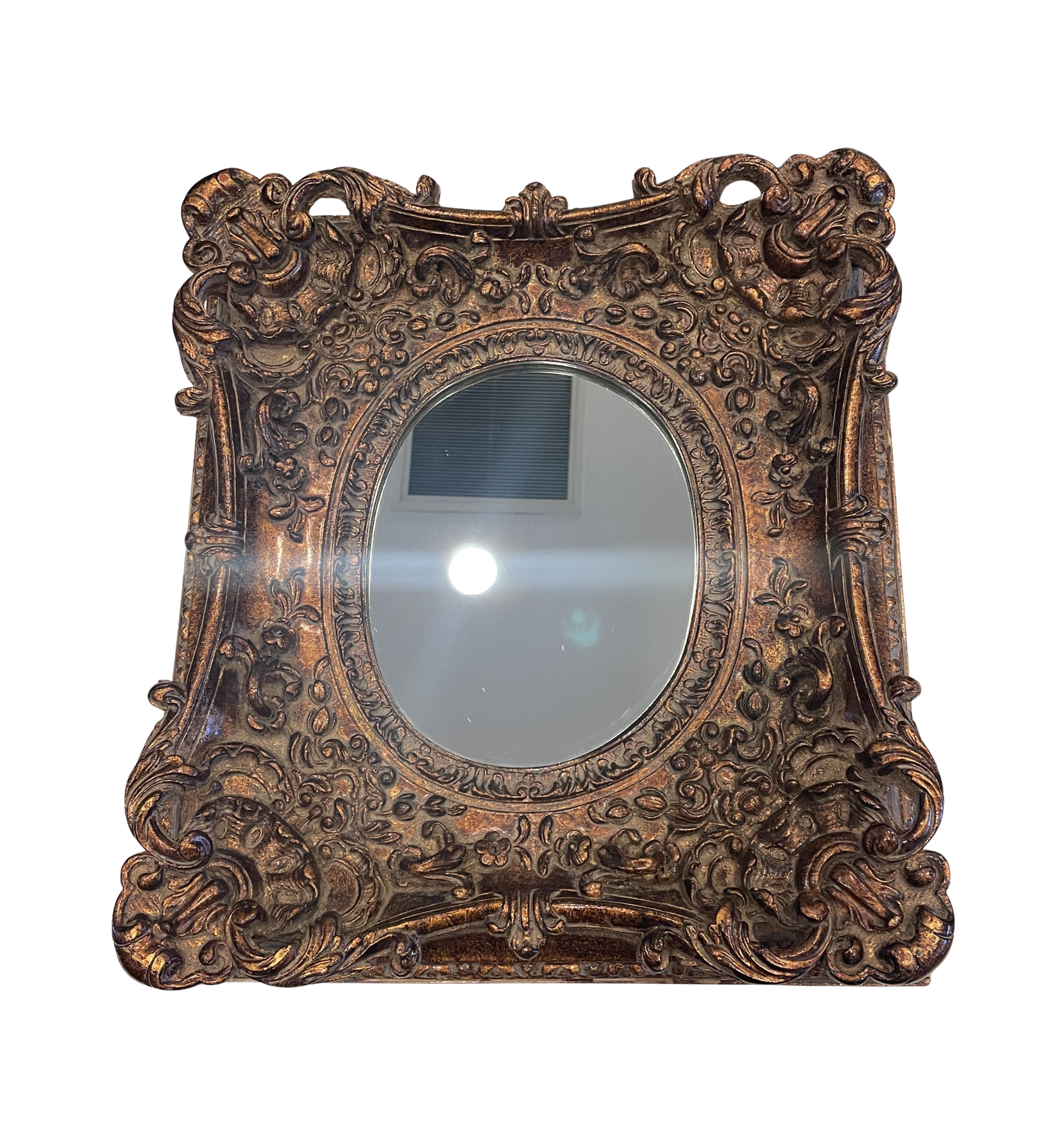 John Richard small mirror. This charming little mirror has an ornate rectangular frame surrounding an oblong mirror. The frame has a warm antique copper finish. It is further adorned with gorgeous, intricate carvings that include scrolled details and small flowers. A small mirror that makes a big statement thanks to its detailed design.