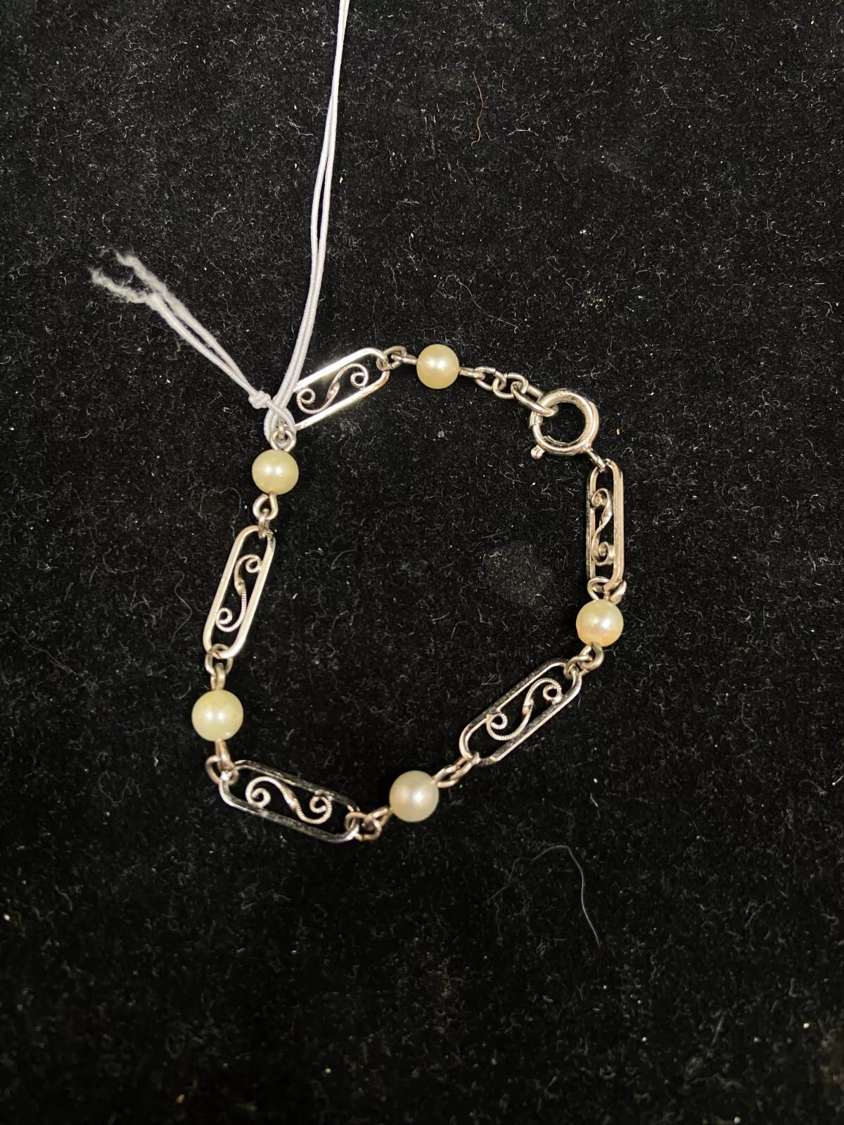 Bracelet features five pearls separated by sterling silver dividers. The dividers have a swirl design in each one.