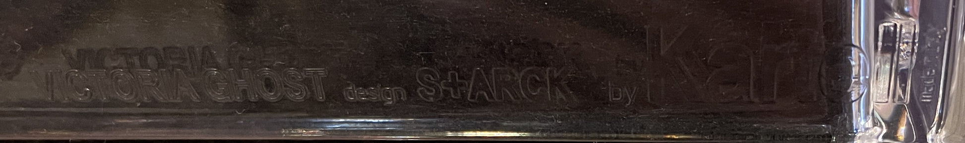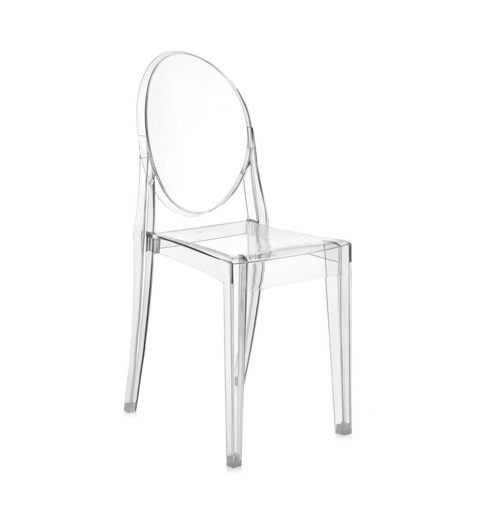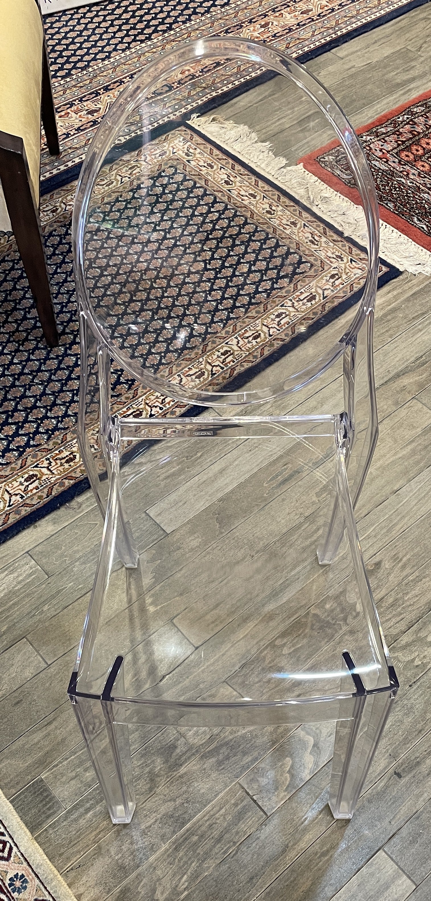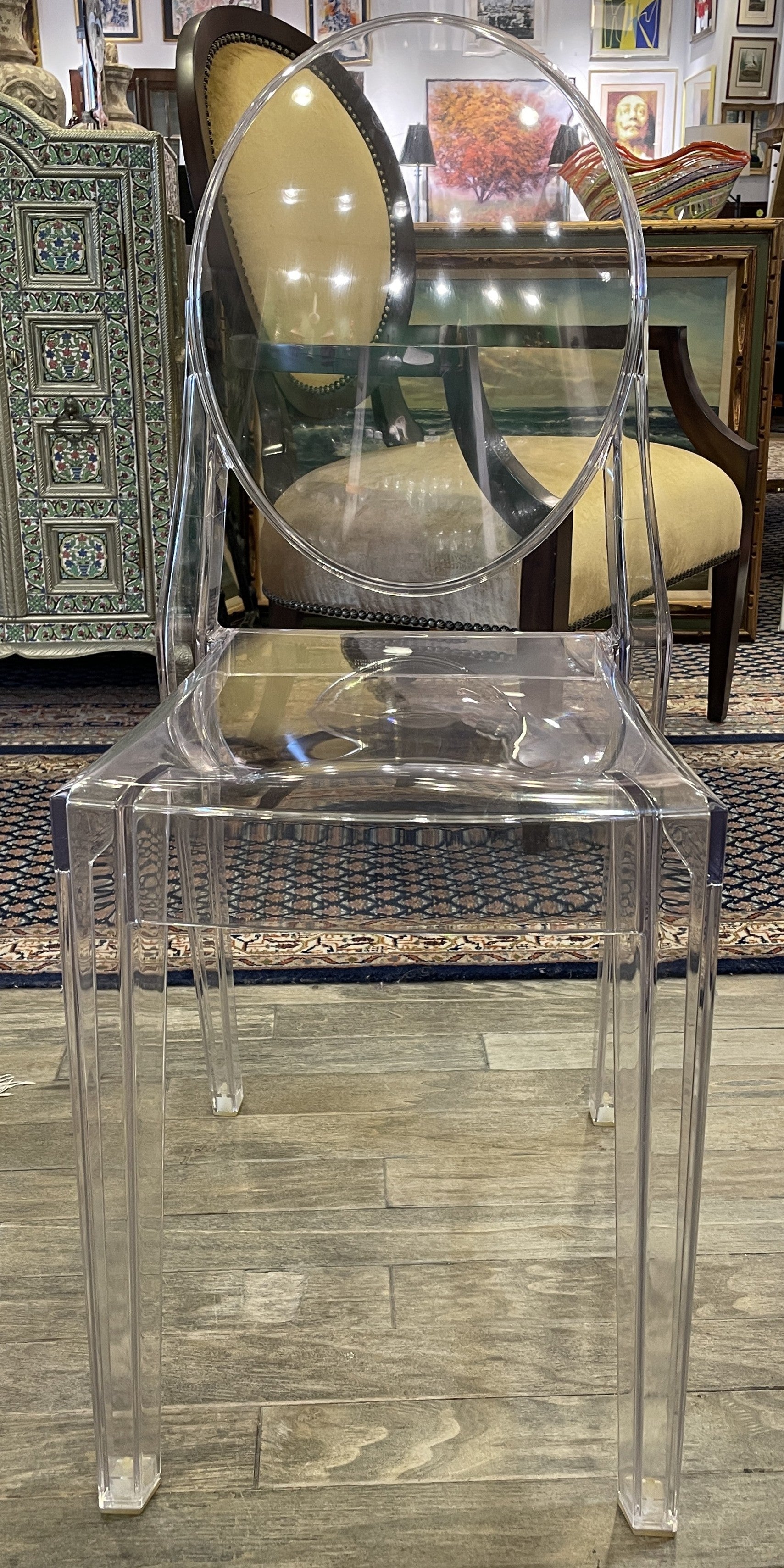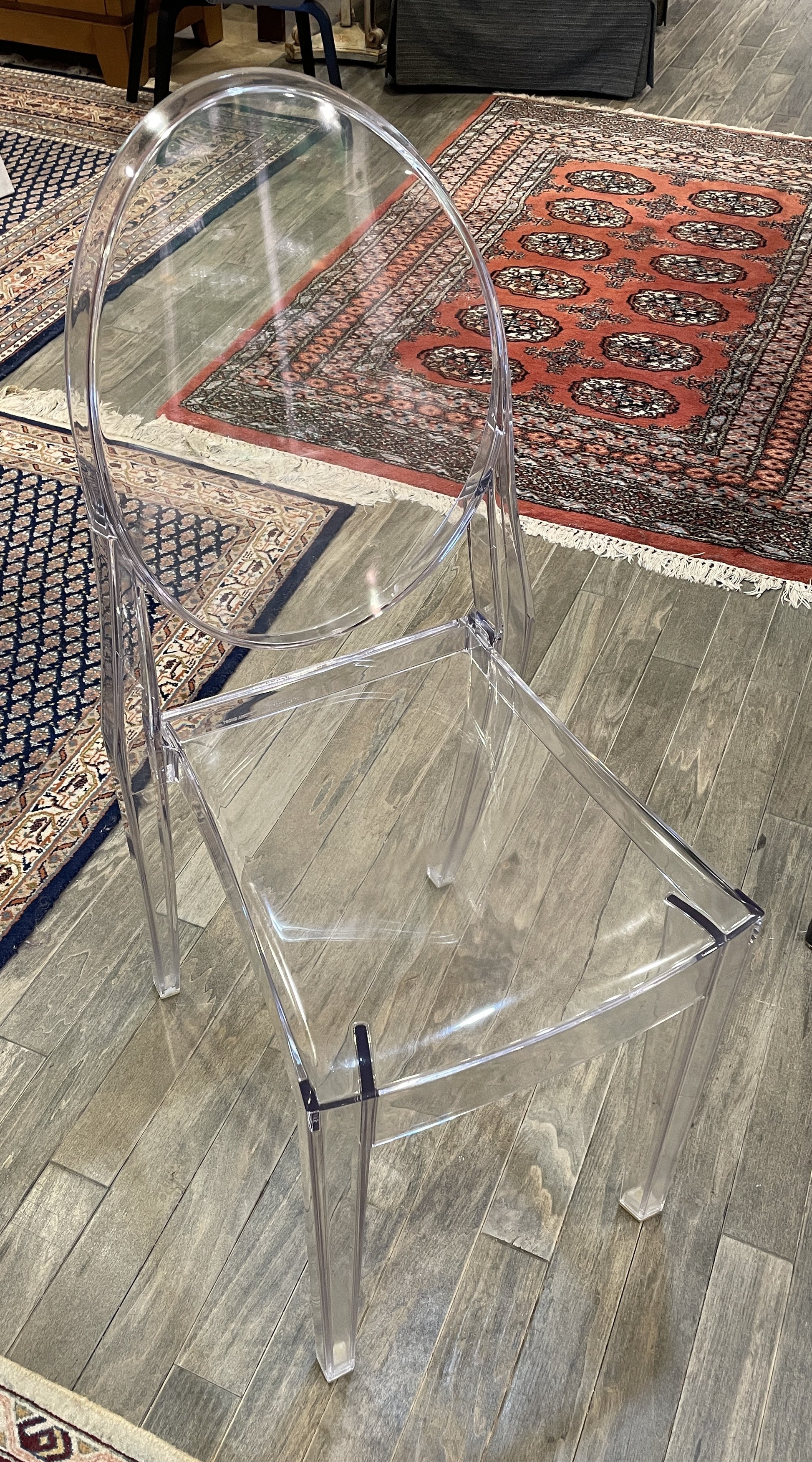 Kartell "Ghost" side chairs - set of 8. The chairs are armless and have a rounded back held up by two supports that stem from the hind legs. The four legs are squared, and the hind legs curve out ever so slightly. Despite their rigid appearance, these chairs are super comfortable! These geometric clear chairs are a beautiful and sleek addition that both blend in and stand out against whatever their paired with.
