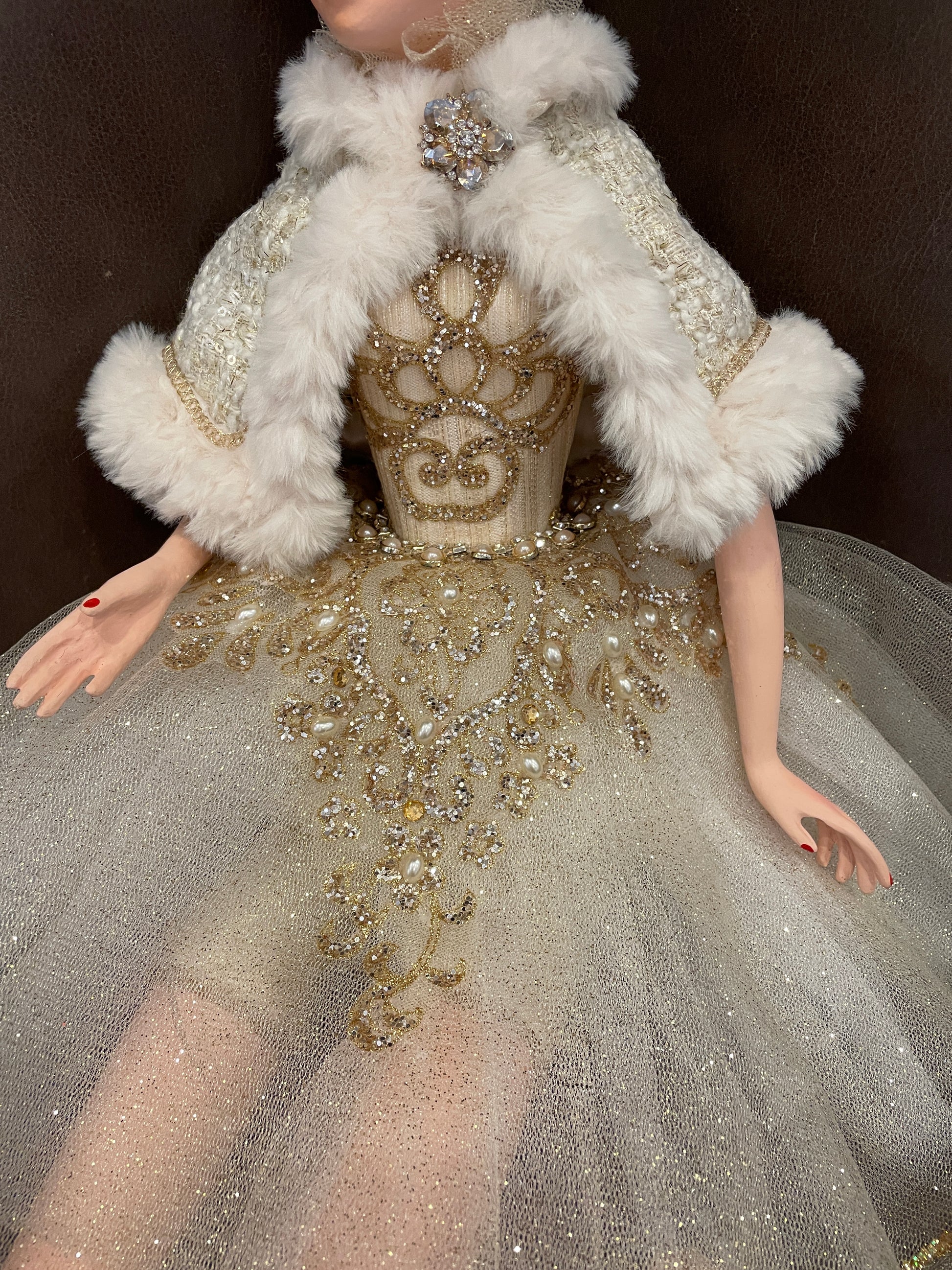 Katherine's Collections "Joy" ballerina. This beautiful sitting doll is decorated with beautiful accessories. Her brown hair is topped with a gold crown that has fluffy white accents and shimmering rhinestones. Her dress is a beautiful white color with gold lace details on the bodice and upper portion of the skirt. The skirt is made of a translucent tulle. The ballerina also wears a short cape with sparkling white fabric and fluffy white trim. She has a beautiful rhinestone adorned brooch and earrings. To complete the look, she wears simple white ballet flats with a rhinestone detail on the toe. An elegant ballerina doll with a sophisticated color palette that is sure to elevate a Christmas scene.