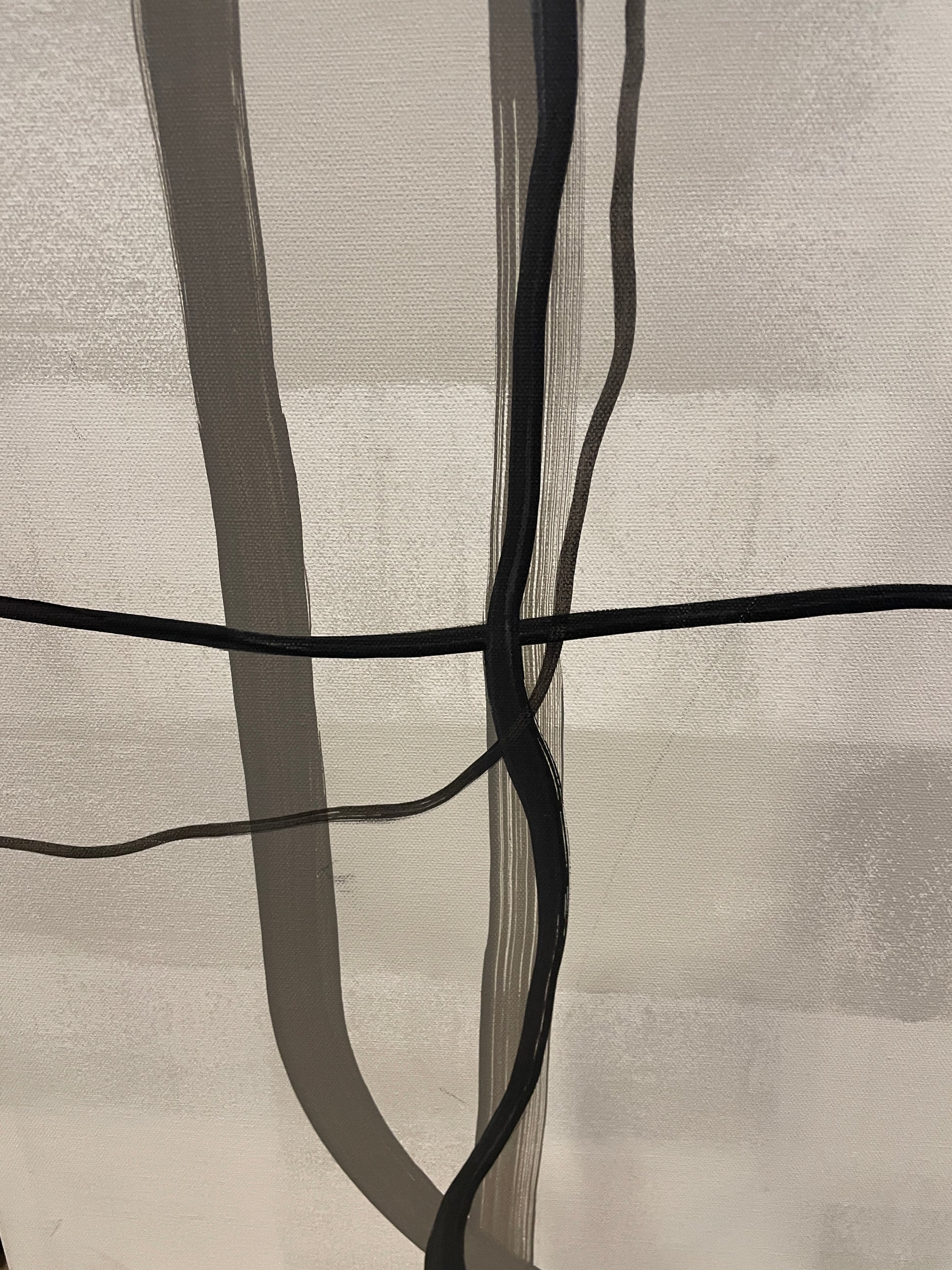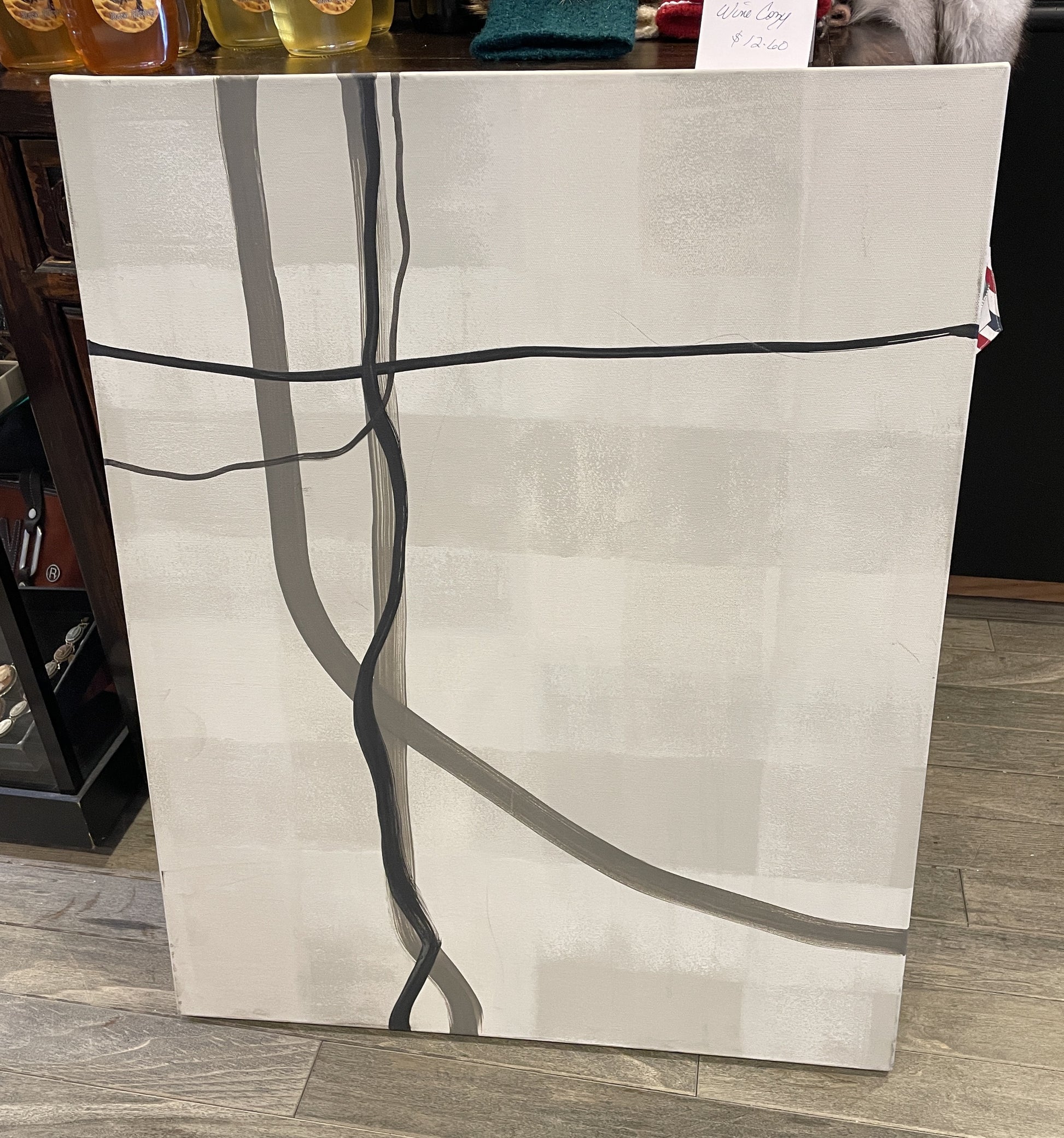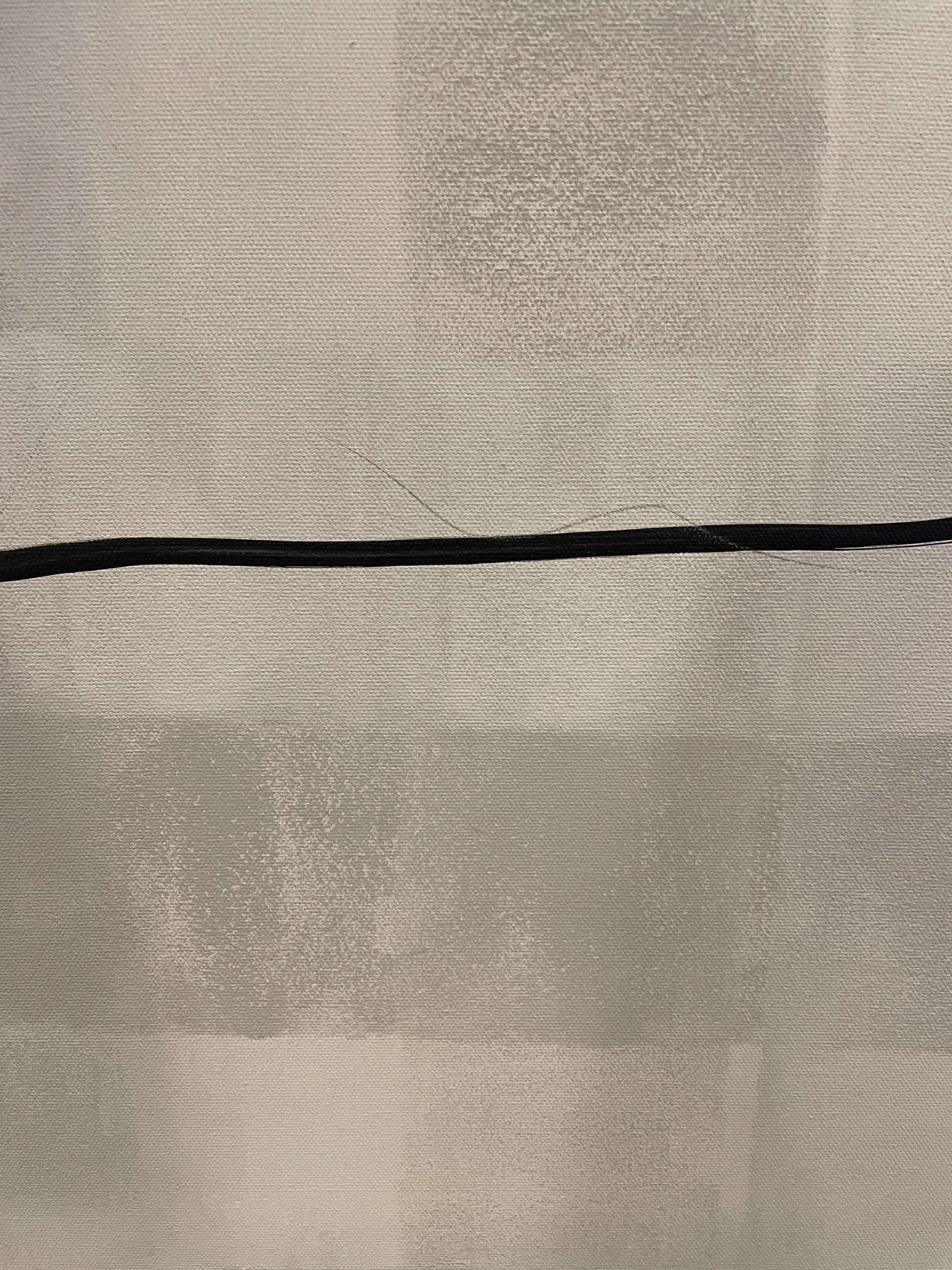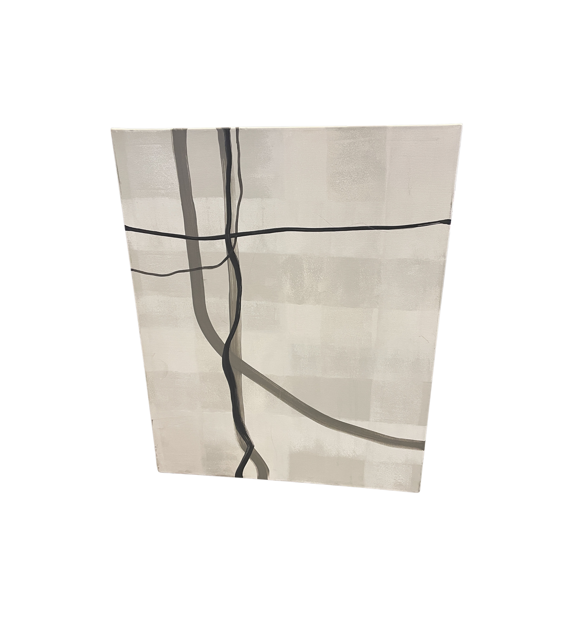 Kathryn Augustyn acrylic abstract on canvas. Signed en verso. This elegant abstract piece features a neutral color palette of black, white, and gray. The background of the piece has varying panels of light gray shades. Atop the background are darker lines that stretch across the canvas. A classy piece of art that is a great complement to various decor styles with its neutral abstract appeal.