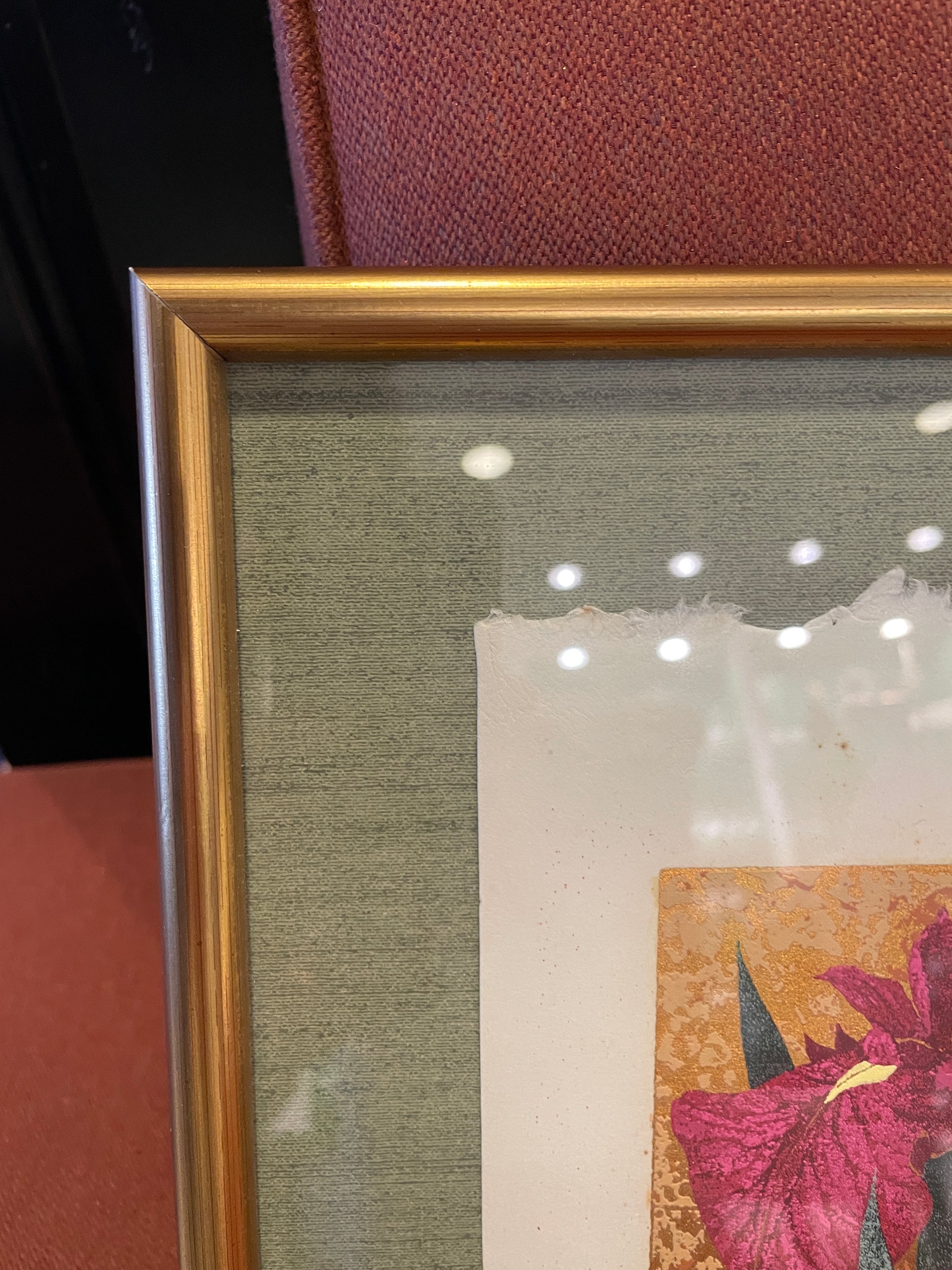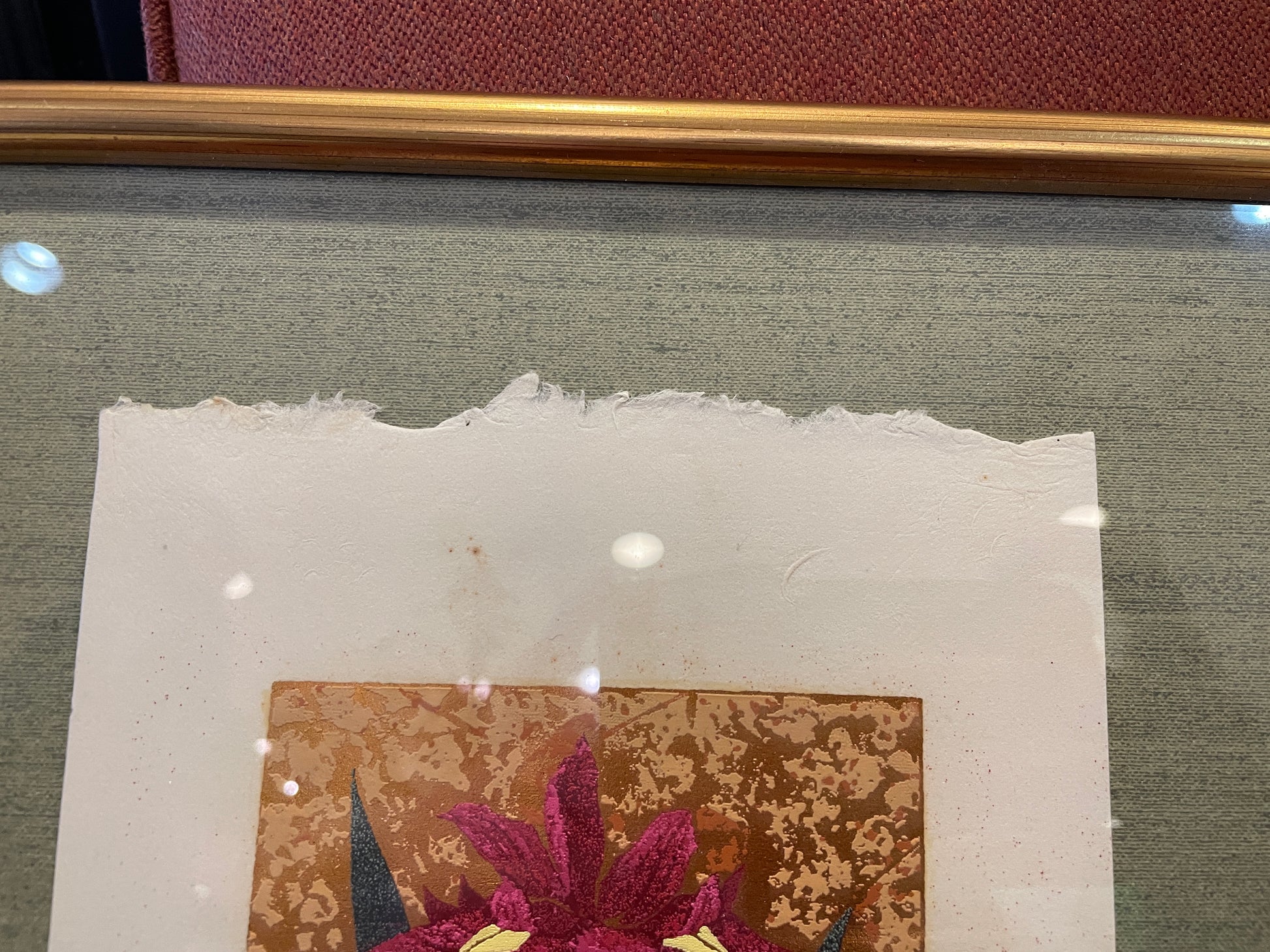 Kazutoshi Siguira "Iris" silkscreen print. Pencil Signed on the lower edge. This beautiful print sits on a piece of paper with a torn upper edge. The print has gorgeous texture with a gold background, green leaves, and magenta petals. The background includes gold leaf that shimmers when it catches the light. The singular iris takes center stage with its vibrant, rich colors that manage to outshine even the gold leaf in the background. The piece is set on a gray mat and held in a simple gold frame.