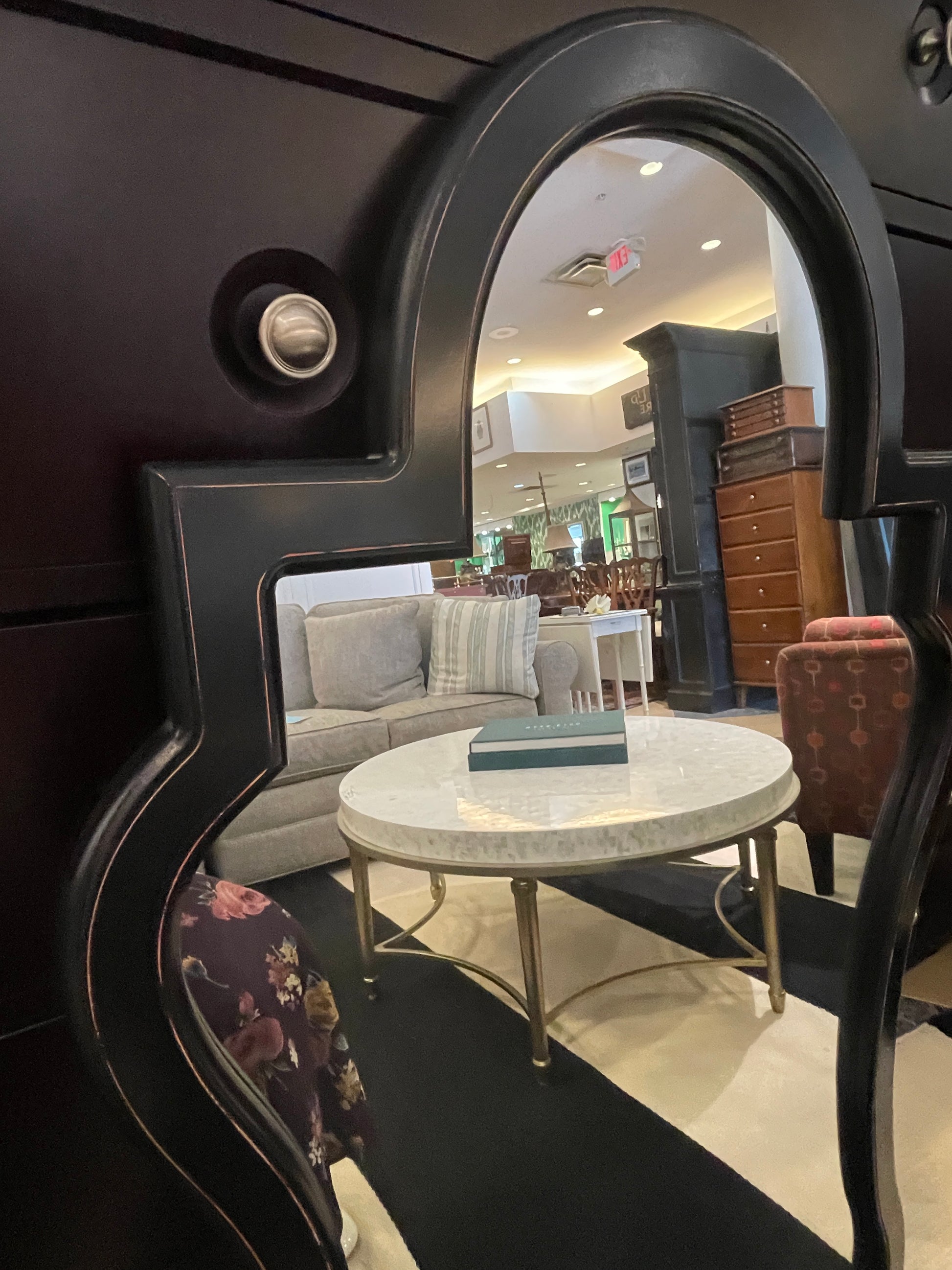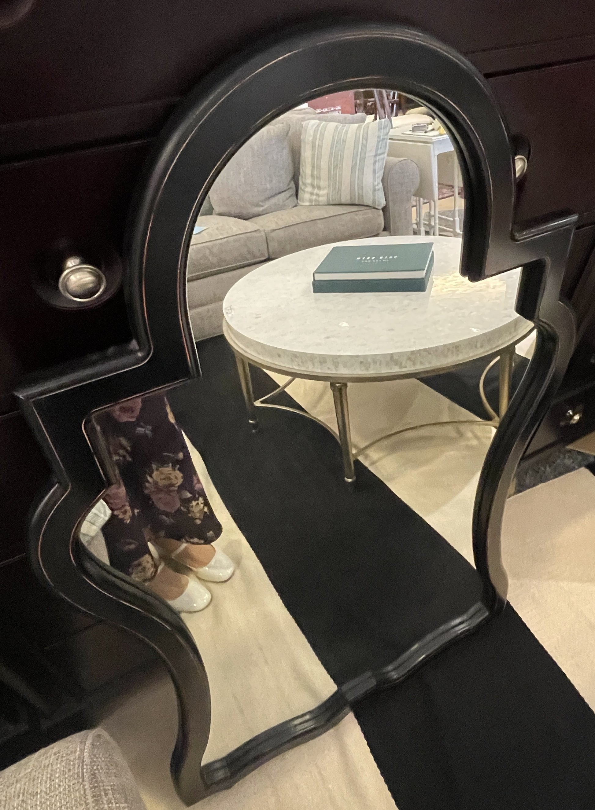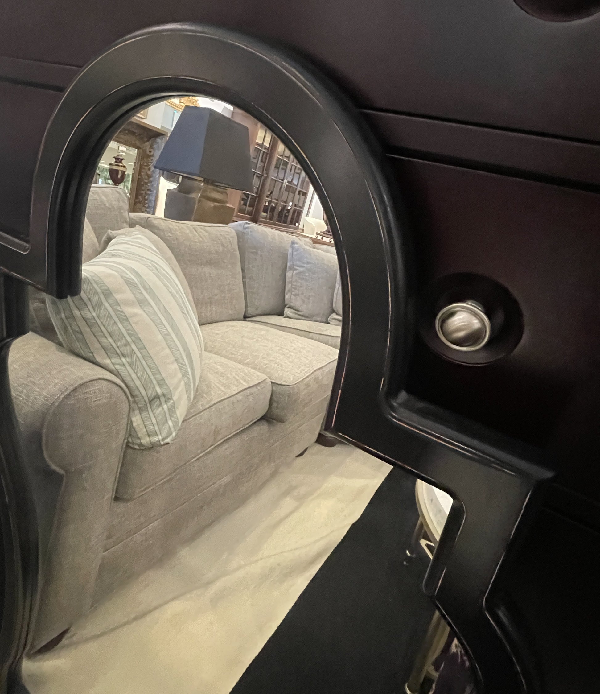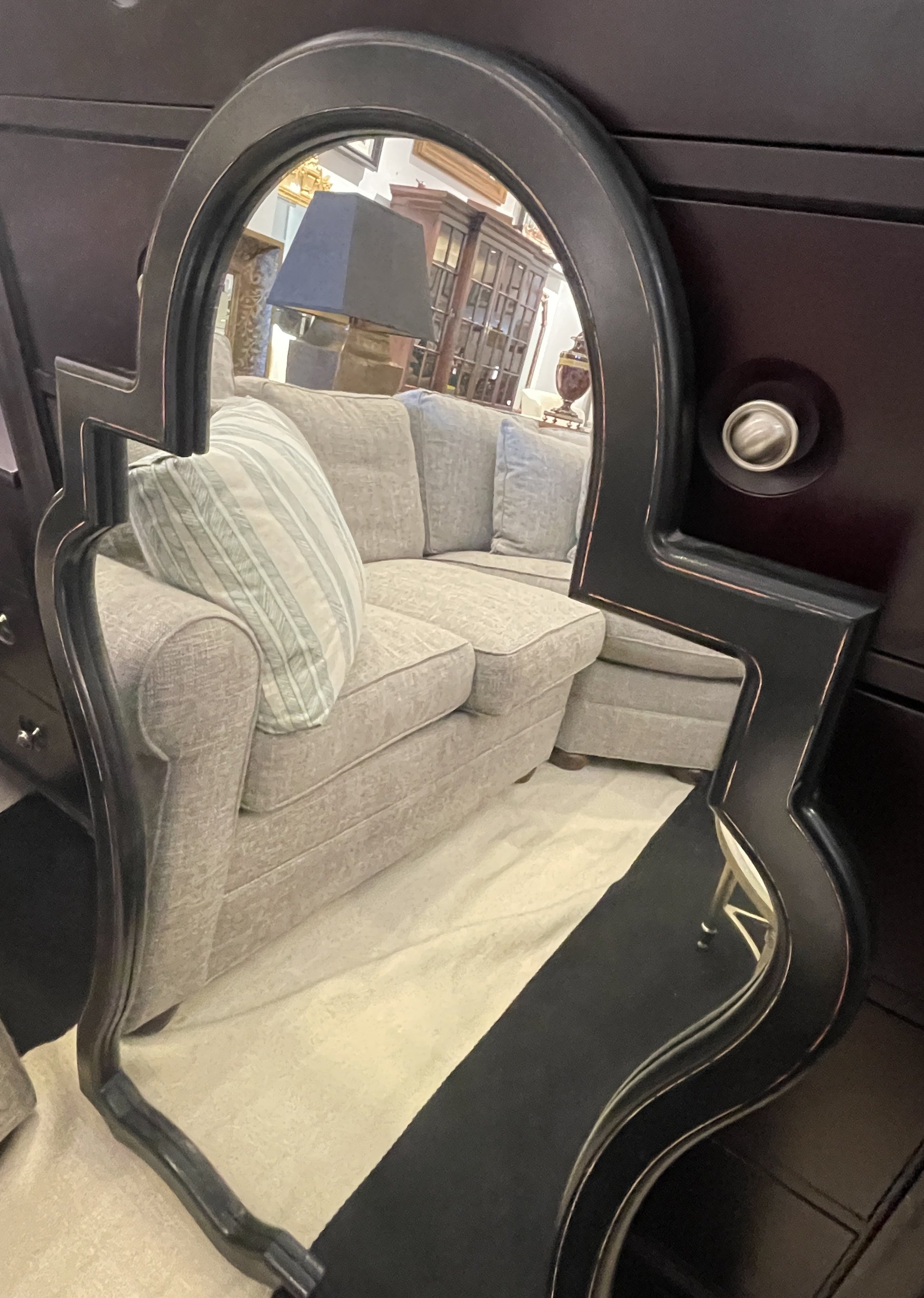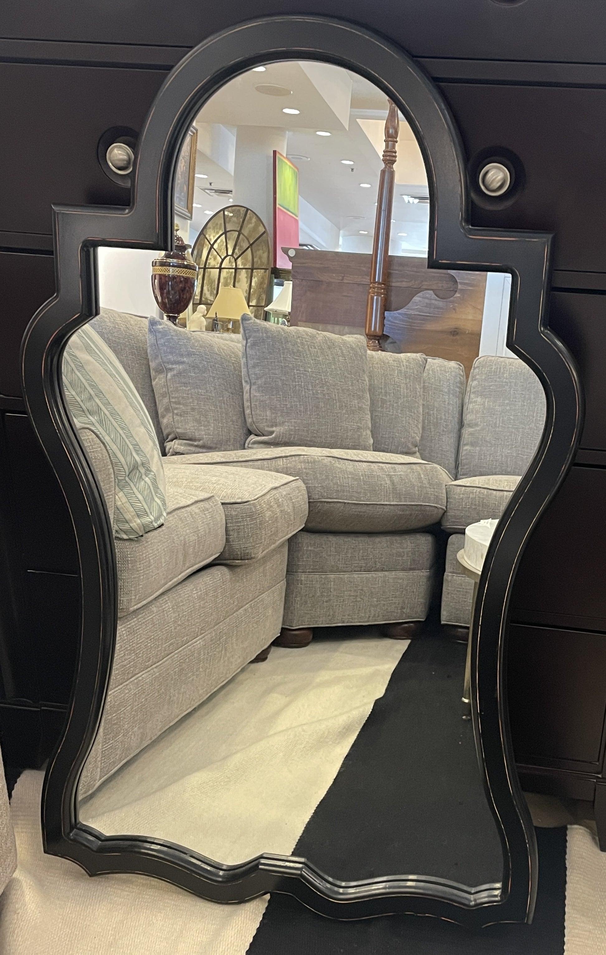 Black, keyhole shaped mirror. Features a contemporary appearance and slight intentional distressing to reveal red and gold lines on the edge of the frame. Metal hooks hang on the back of the mirror to allow it to be easily affixed to the wall. Perfect as an accent mirror or a vanity mirror!