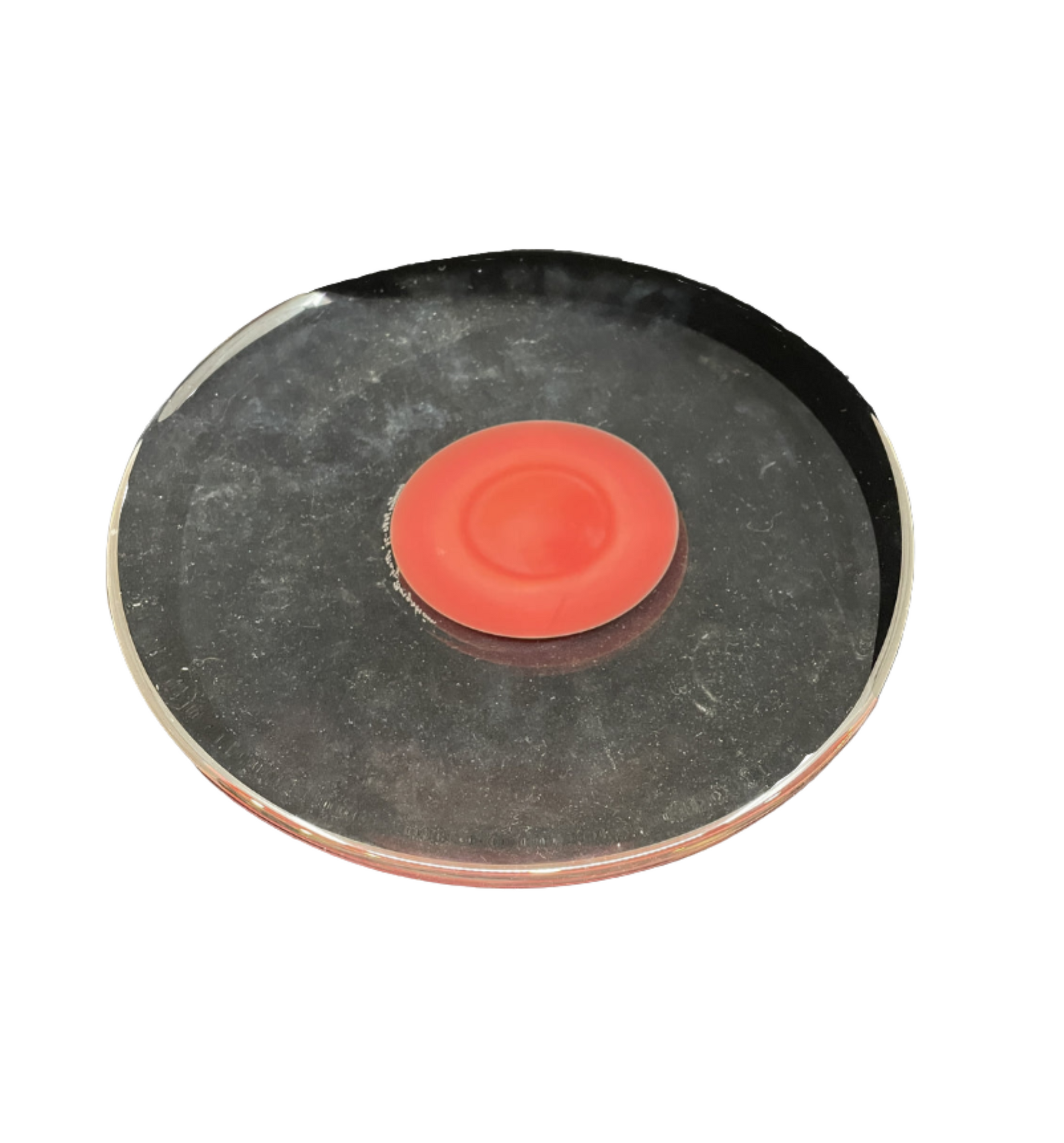 This modern center bowl from Kosta Boda, designed by Monica Backström, features a clear glass plate with a subtly concave shape. A bold red circle sits at its center, while a touch of black along the outer edge enhances its abstract design. An etched signature is precent in the center.