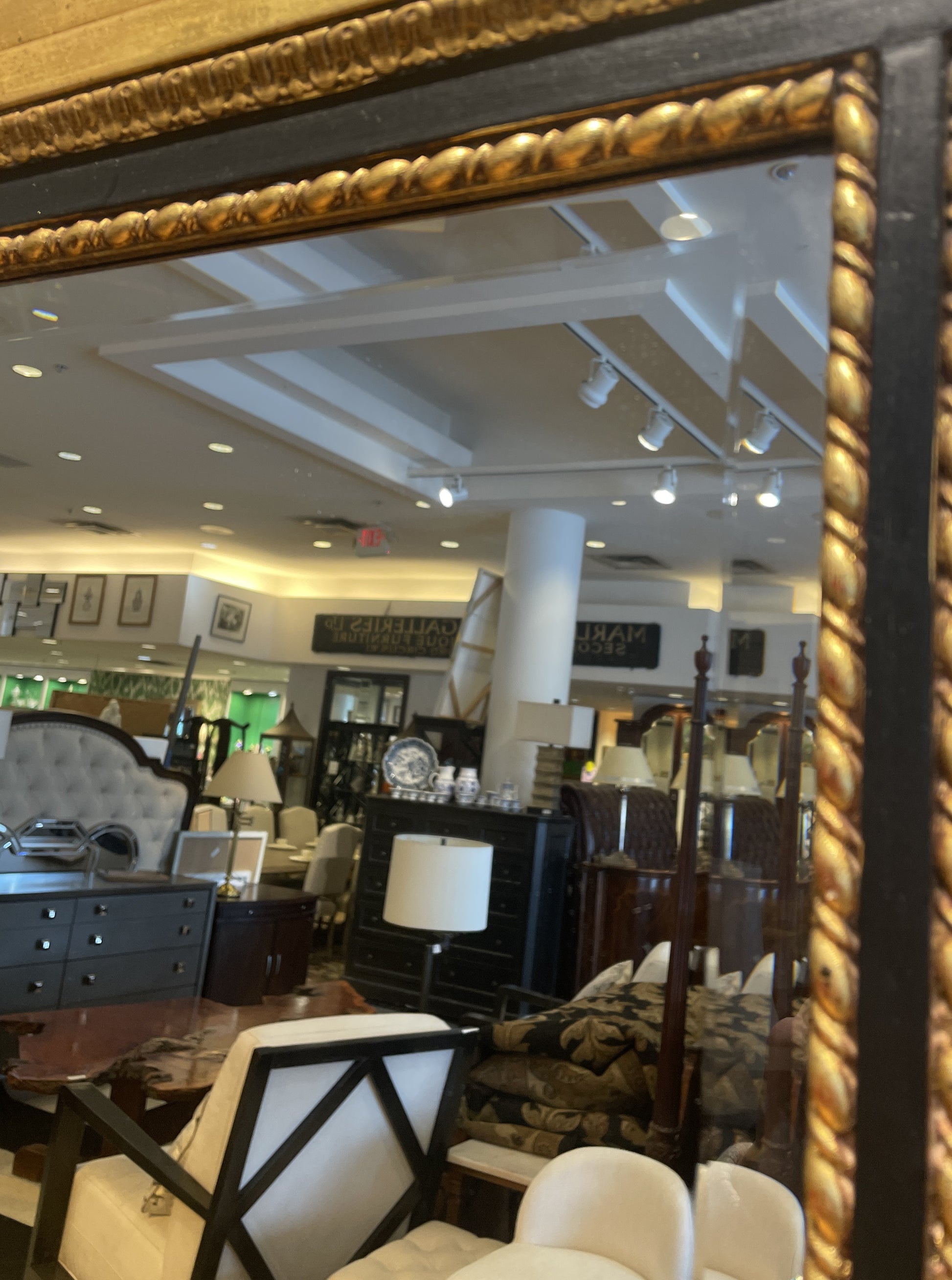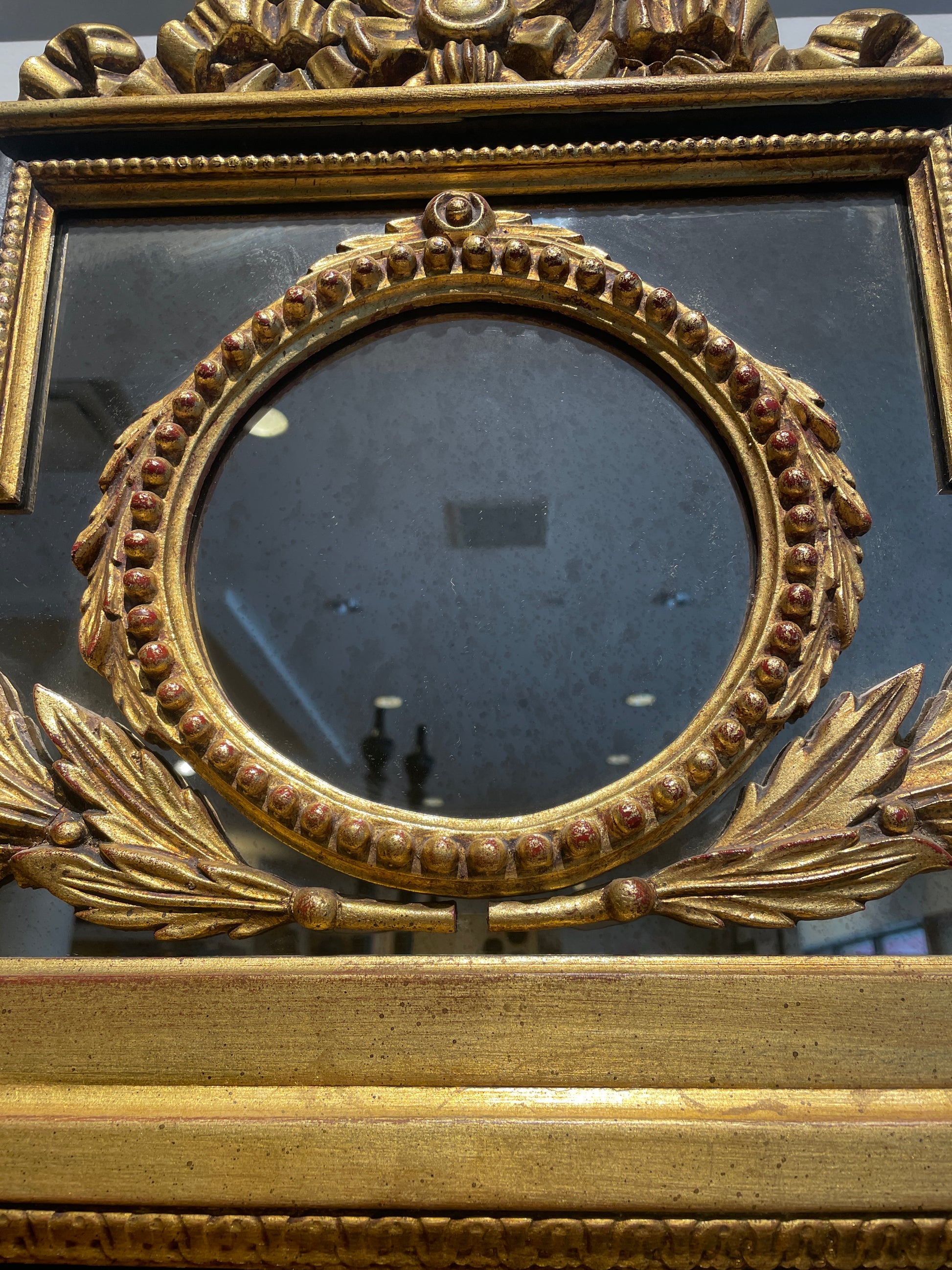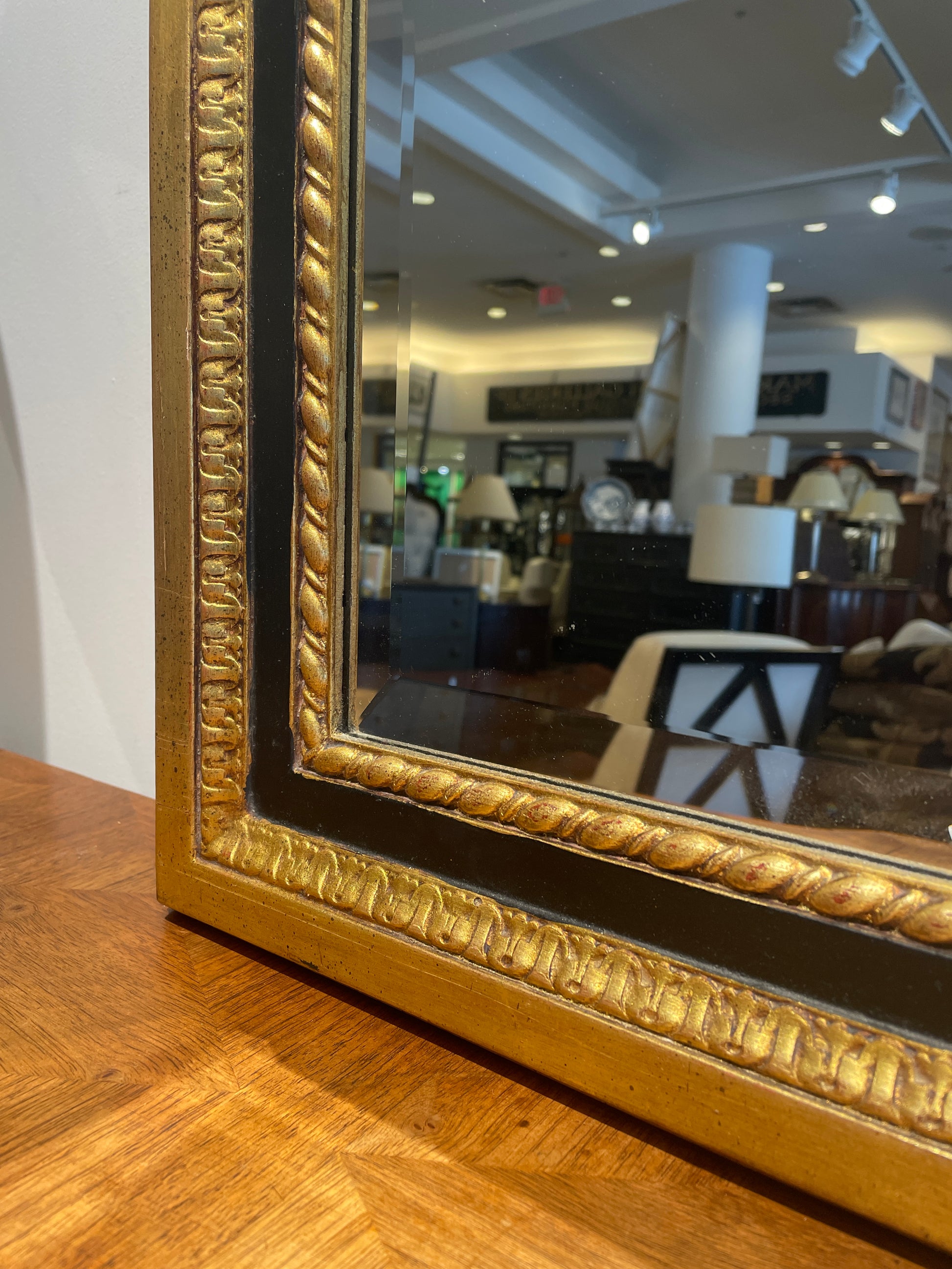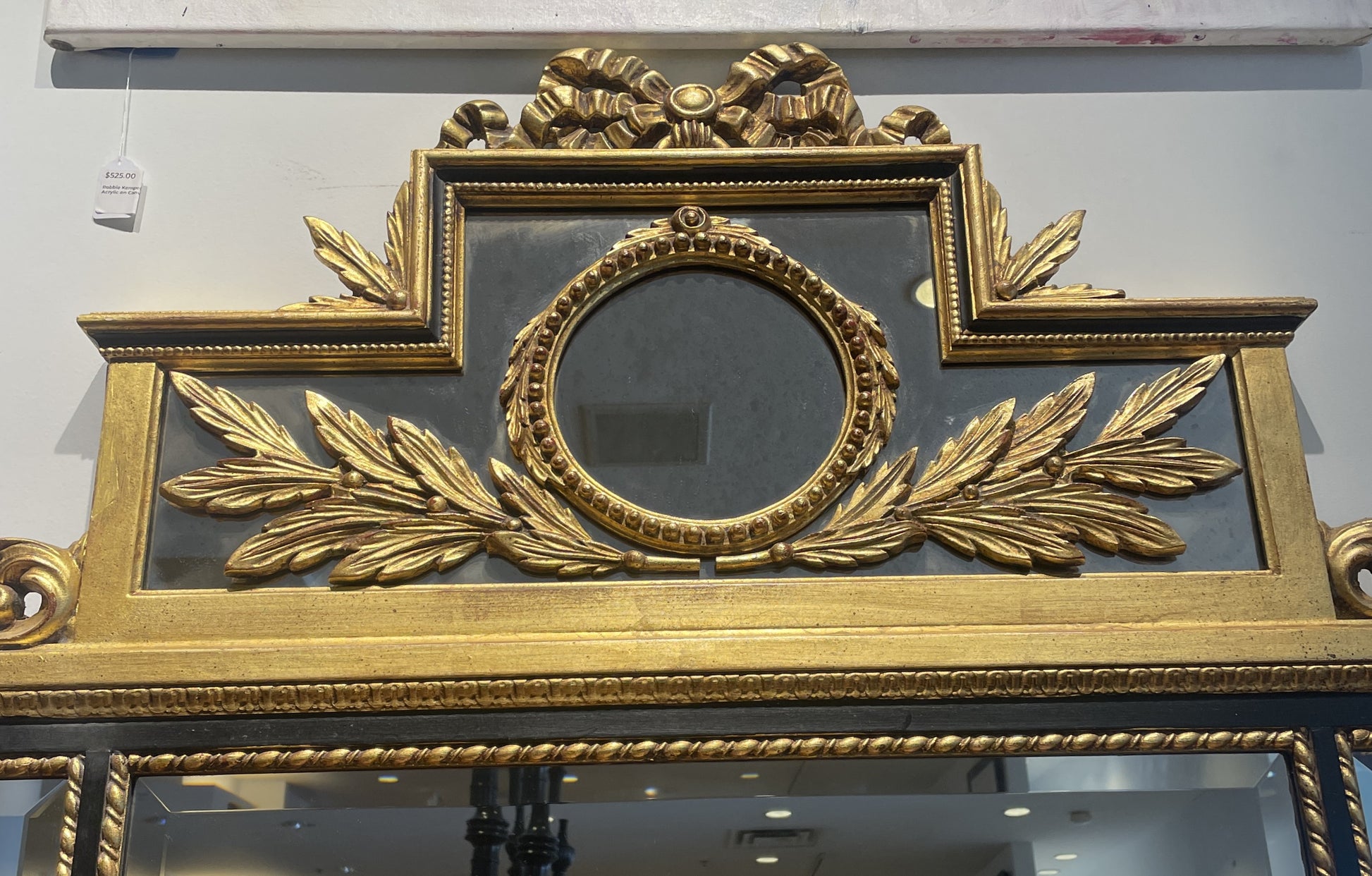 LaBarge regency style buffet mirror. This stunning mirror features an intricate design consisting of multiple mirror "panels" and an ornate black and gilt frame. The lower portion of the mirror is relatively simple with three sections of mirror. Each mirror is beveled and accented with a twisted gilt border. The frame has a black center band that contrasts the gold details beautifully. The top of the mirror is truly the showstopping part of this piece. An upside-down T-shaped mirror is accented with a wreath, ribbon, and leaf details. A gorgeous mirror that's sure to add a regency flair to any space.