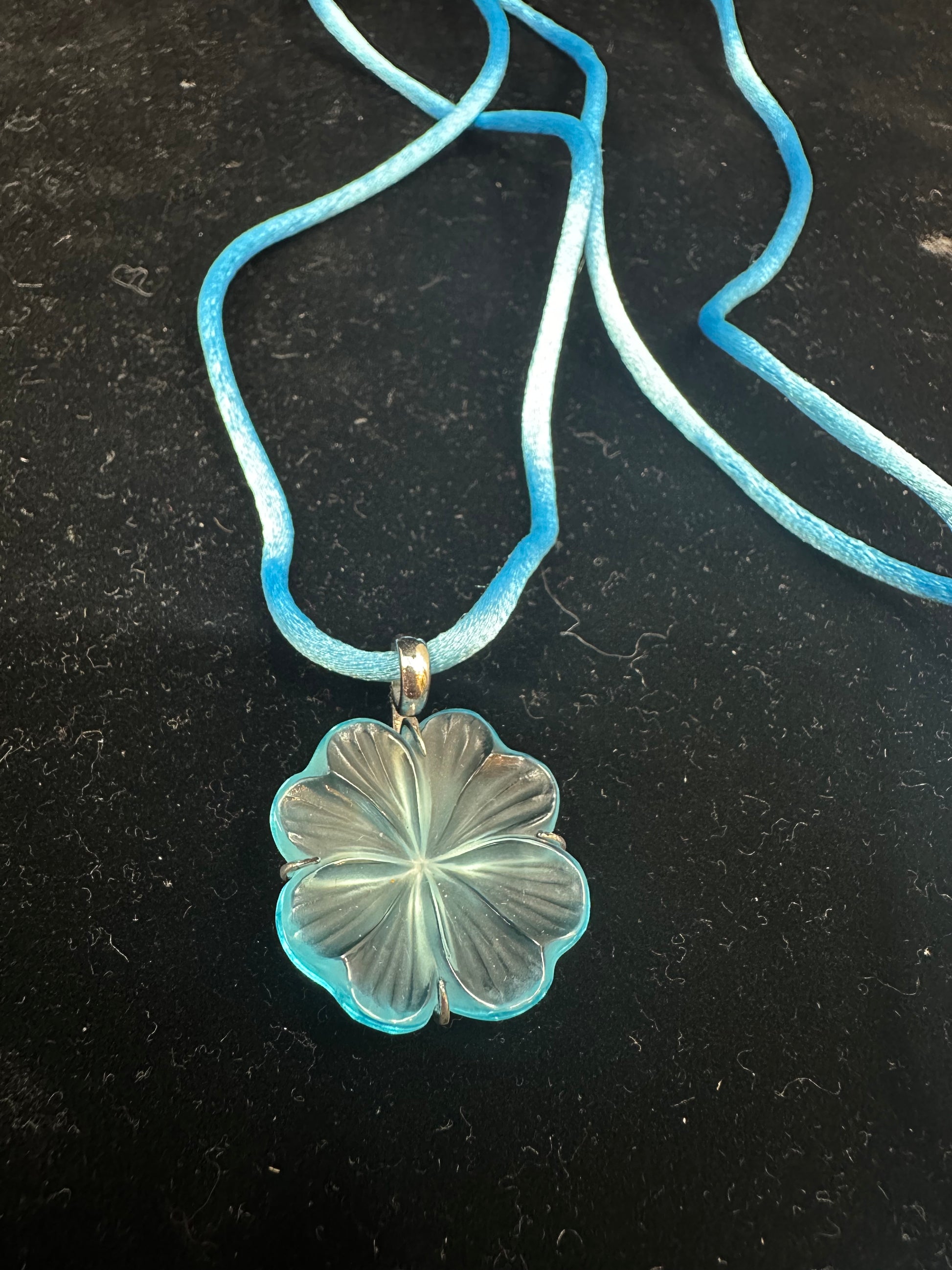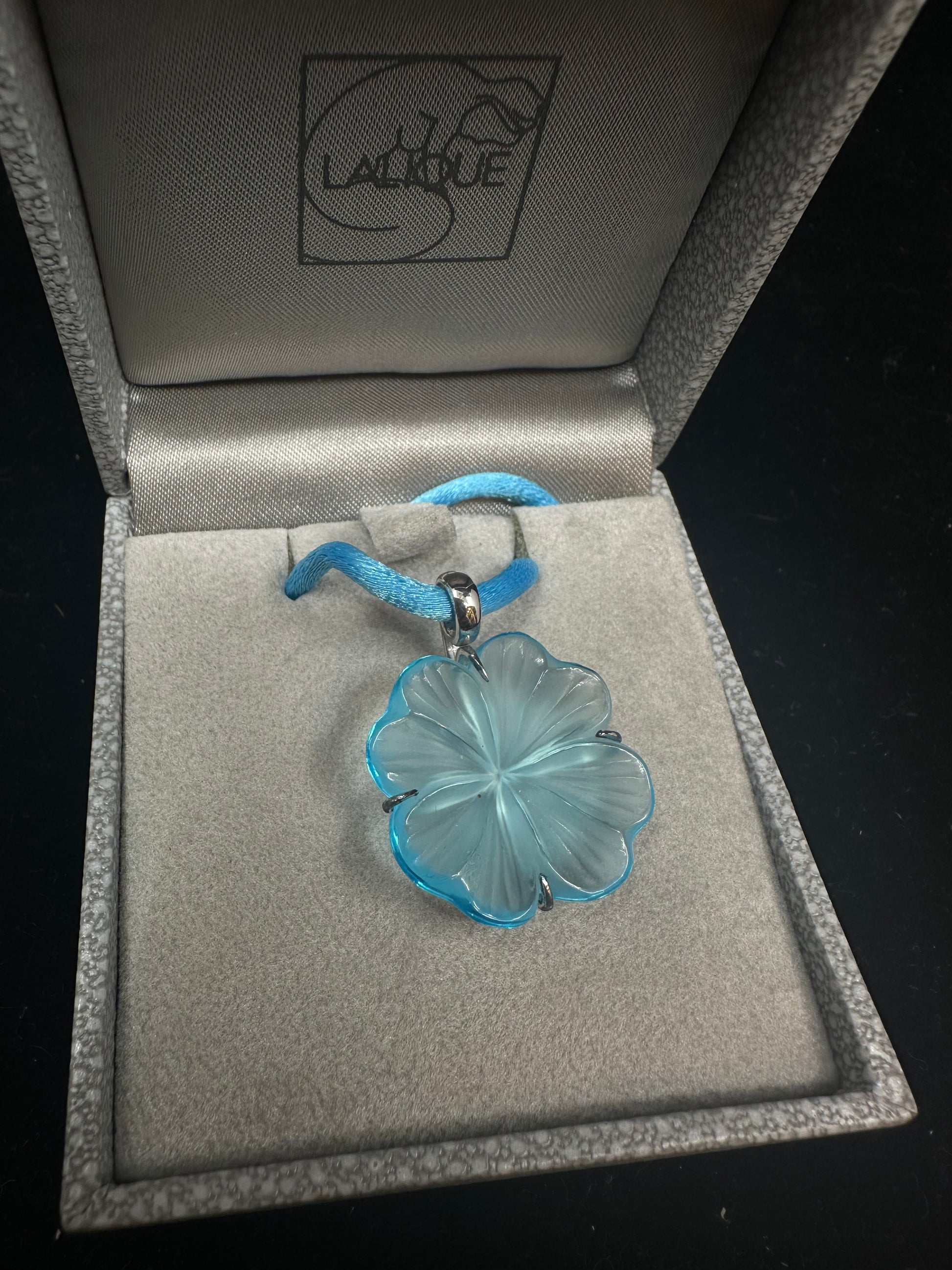 Blue flower necklace by the brand Lalique. Features a bright azure blue coloration with a matching blue chord. The flower is held on a silver hanging piece with Lalique branding stamped on the back. Includes original box and card.