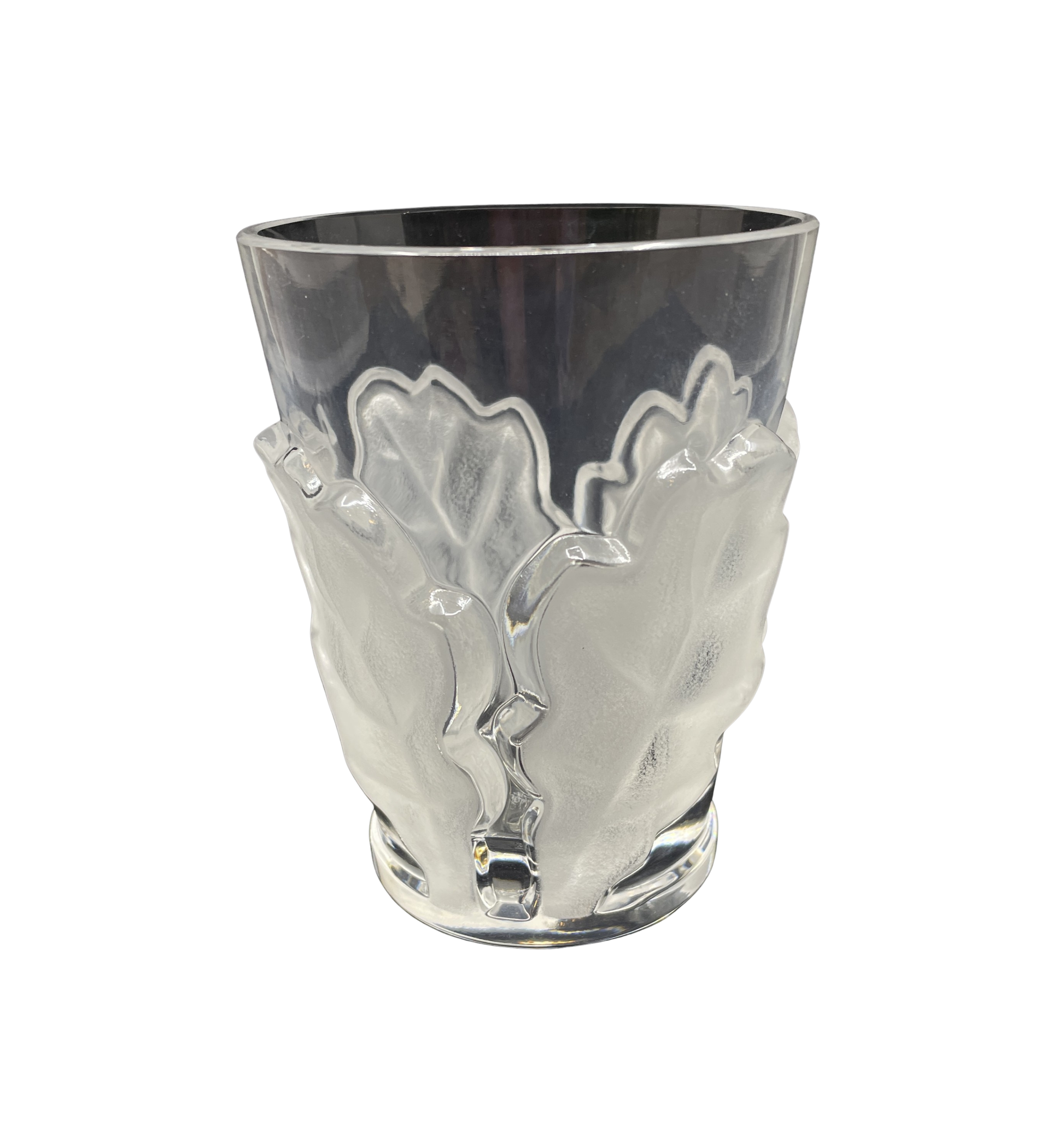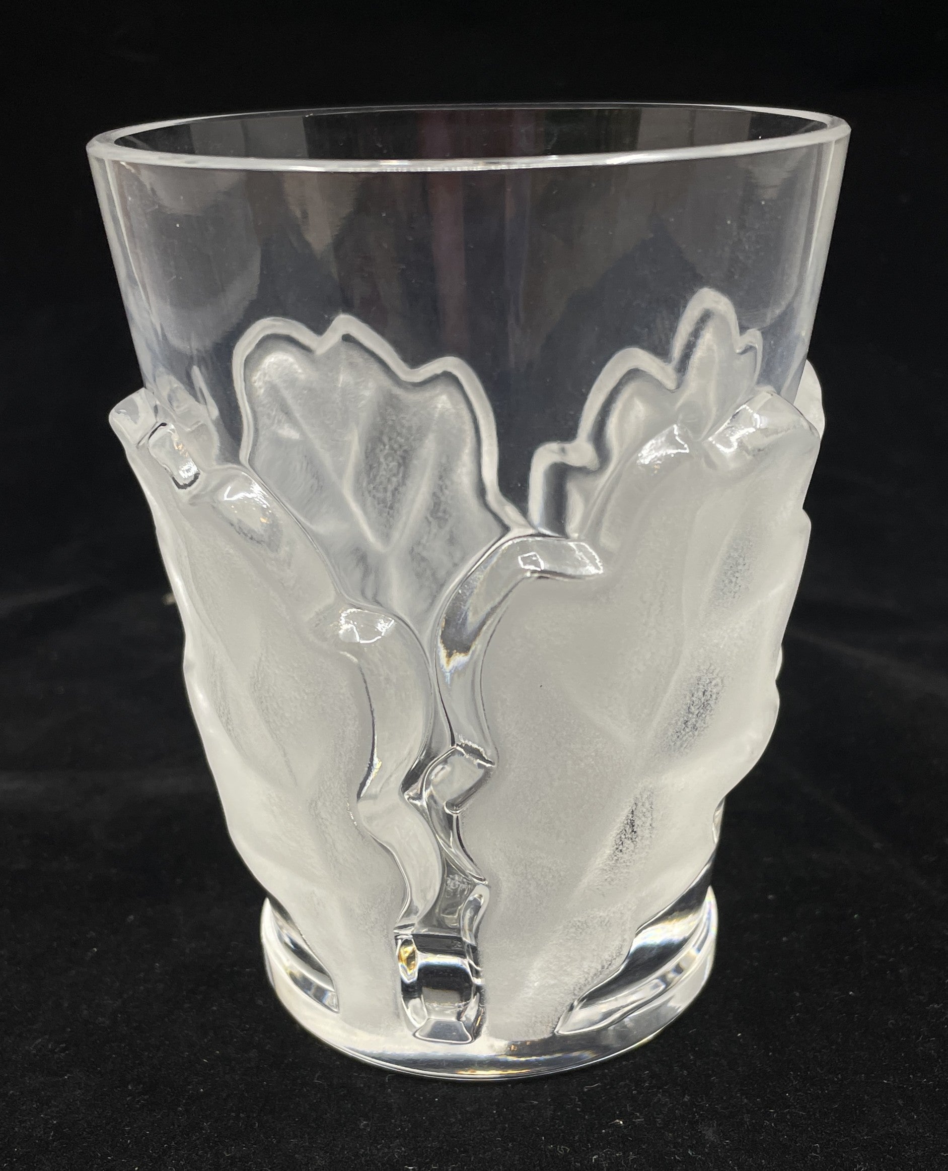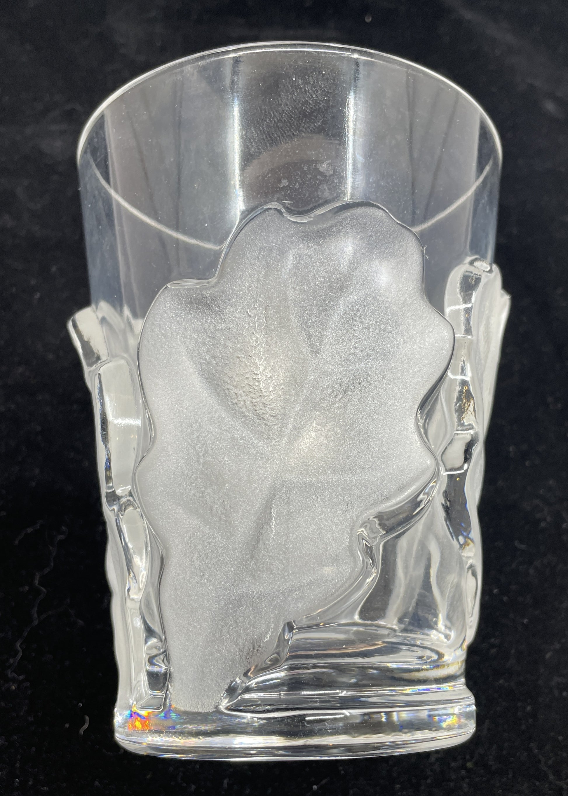 Lalique "Chene" discontinued double old fashioned glass. Signature incised on the bottom. This stunning crystal glass features a frosted oak leaf design that repeats four times. The leaves protrude out from the clear cylindrical glass. A gorgeous collector's item that is sure to add a touch of luxury to any space.