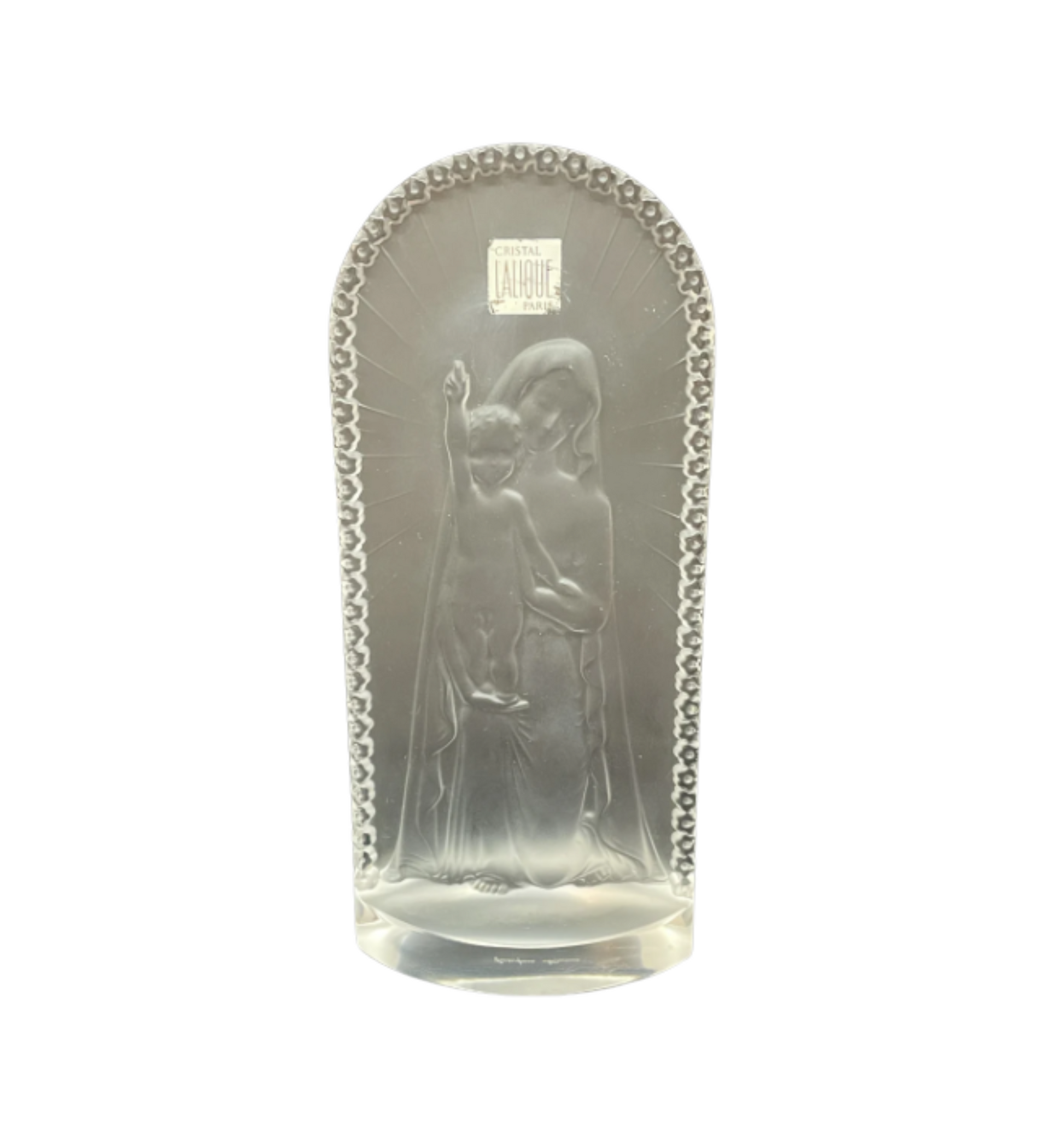 Glass sculpture from Lalique. Features slightly frosted glass archway with Madonna holding a child who is pointing up to the sky. The border is adorned with flowers. Signed on the bottom.