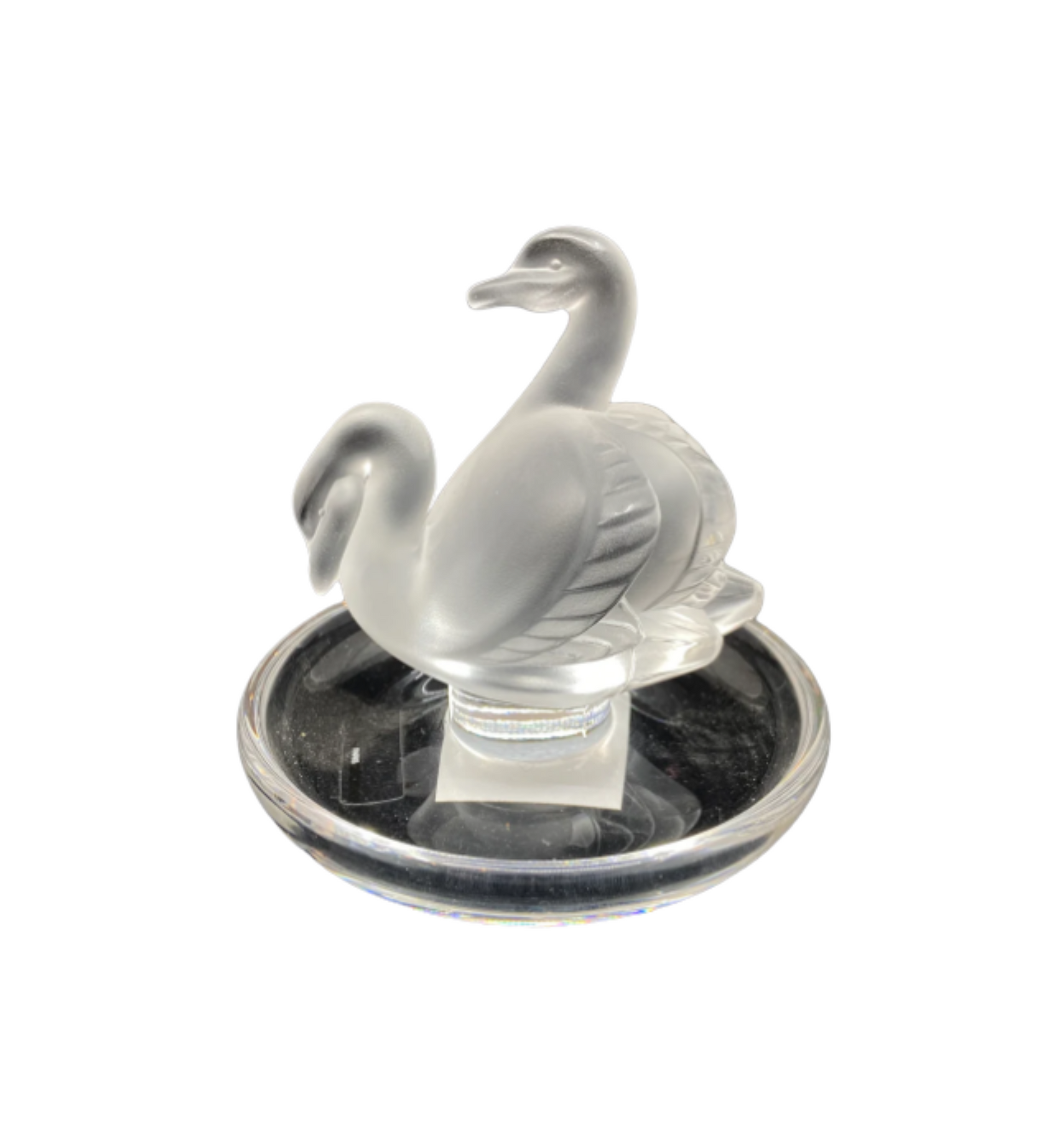 Ring holder by Lalique. Features a crystal dish with two frosted swans in the center. Lalique sticker and mark on bottom.
