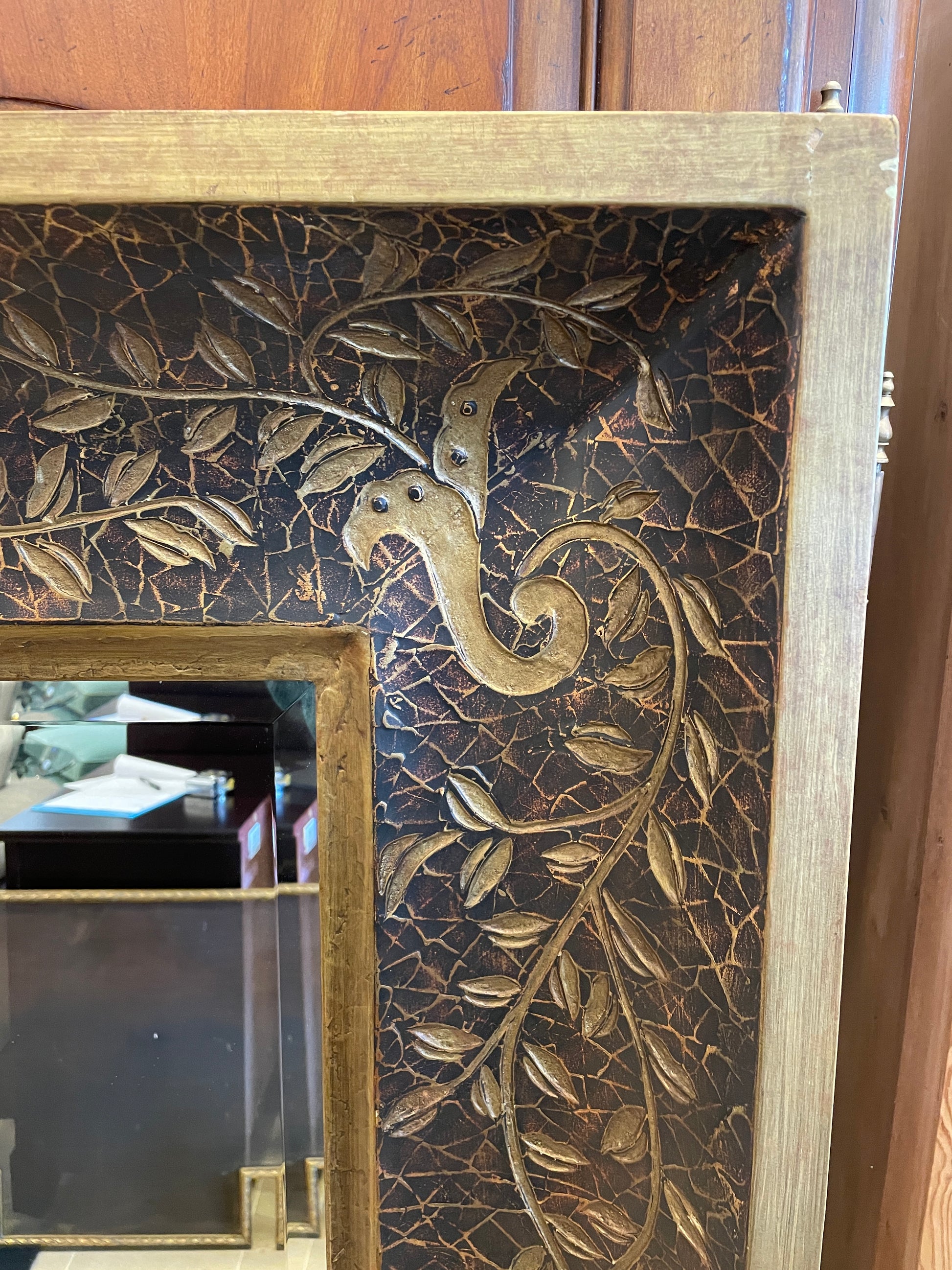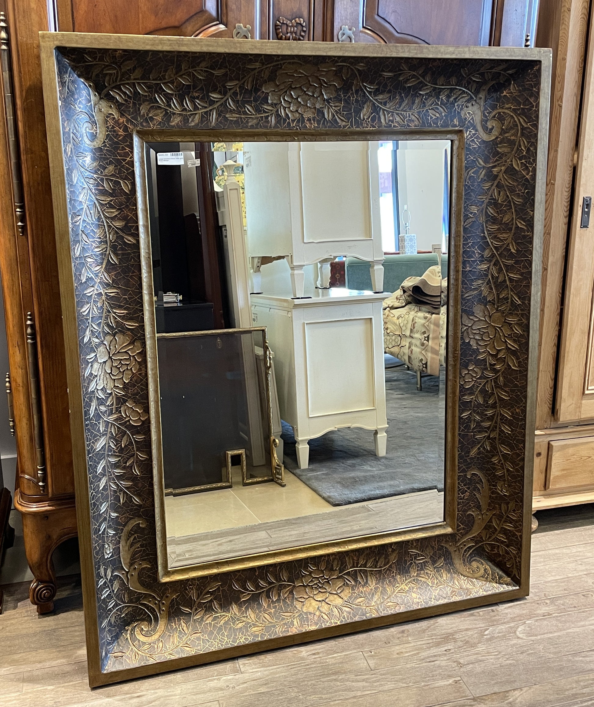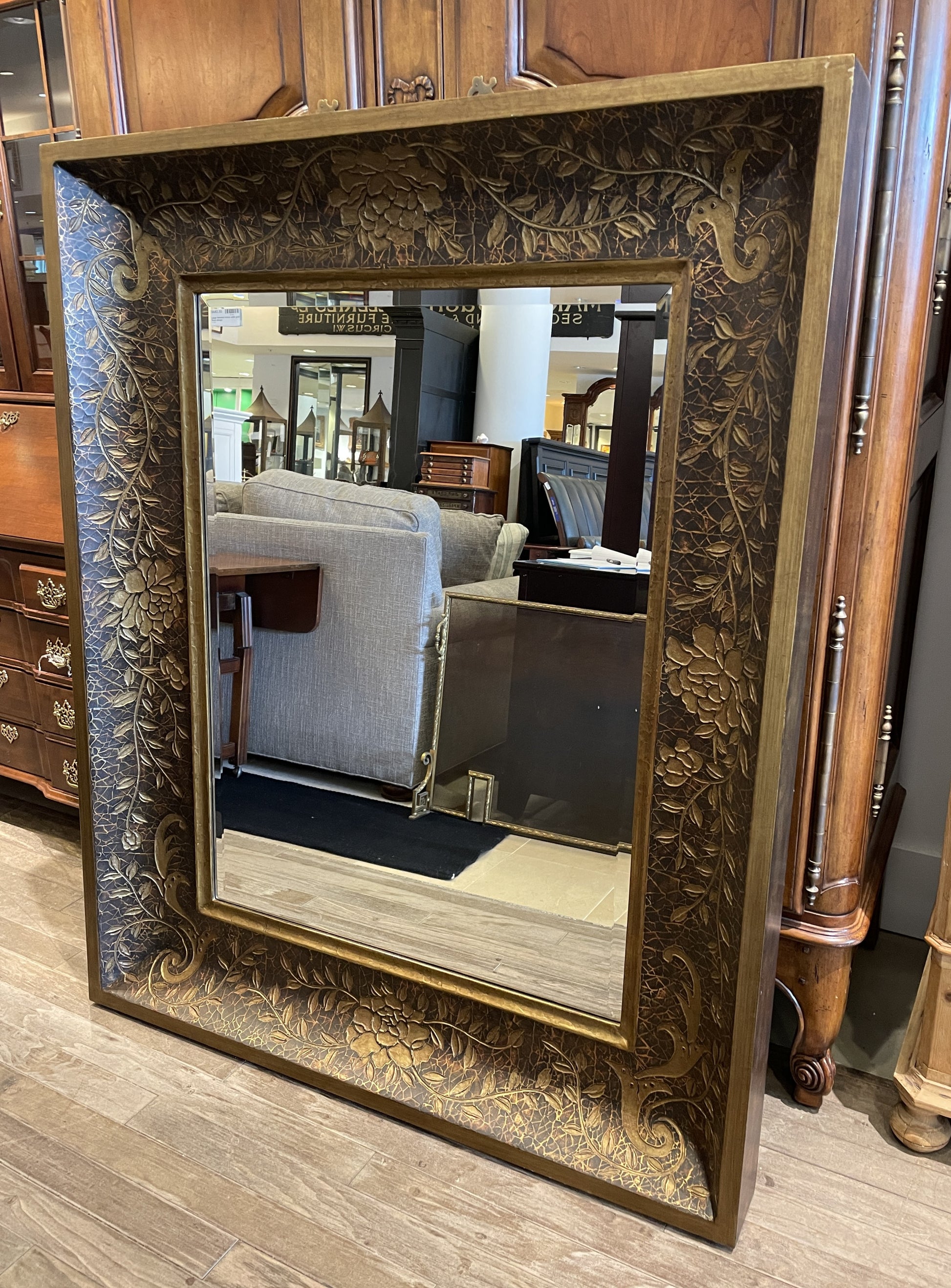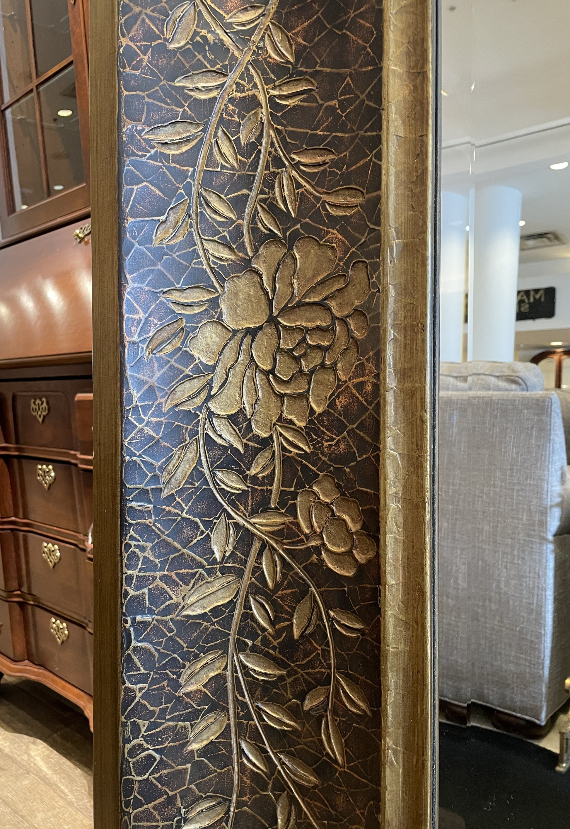 Large rectangular mirror featuring beveled glass with a dark frame detailed by gilt floral designs and a crackle finish.
