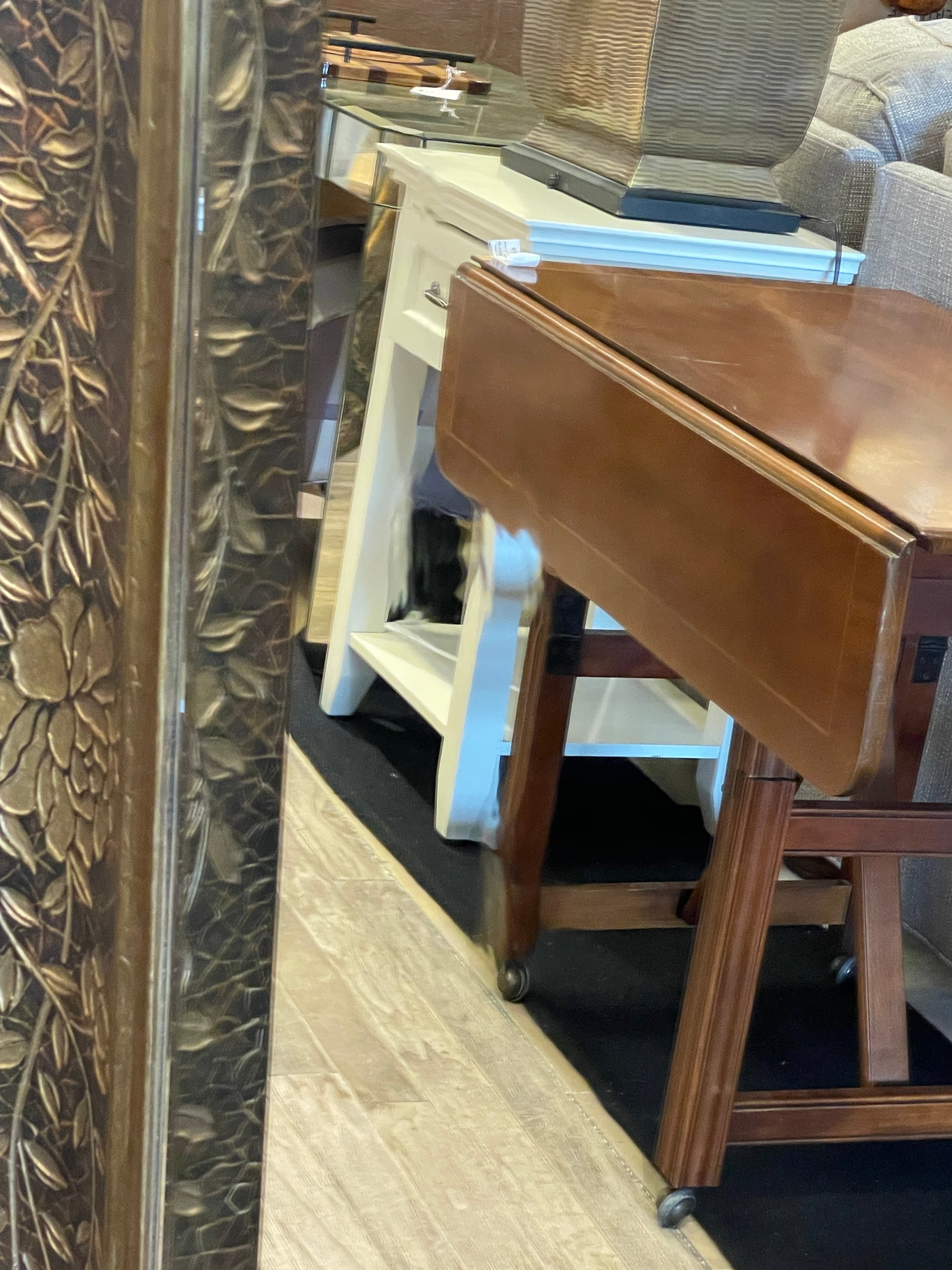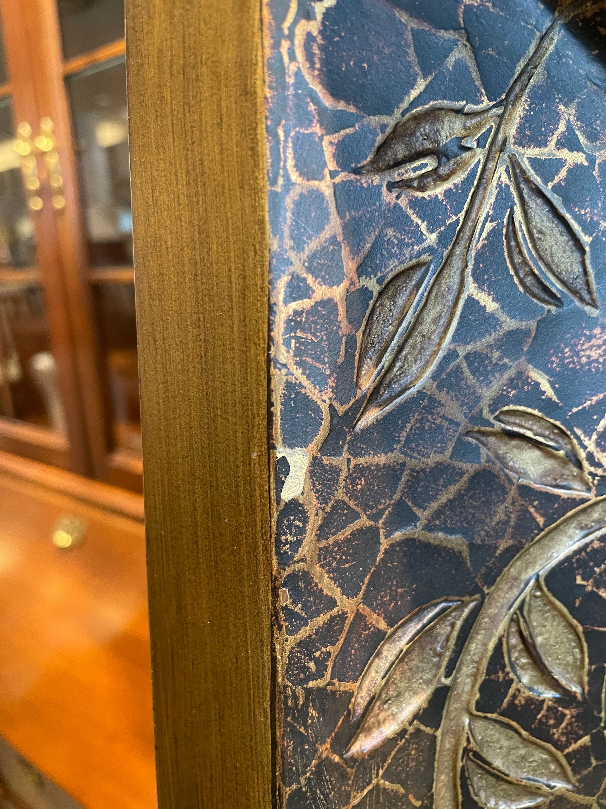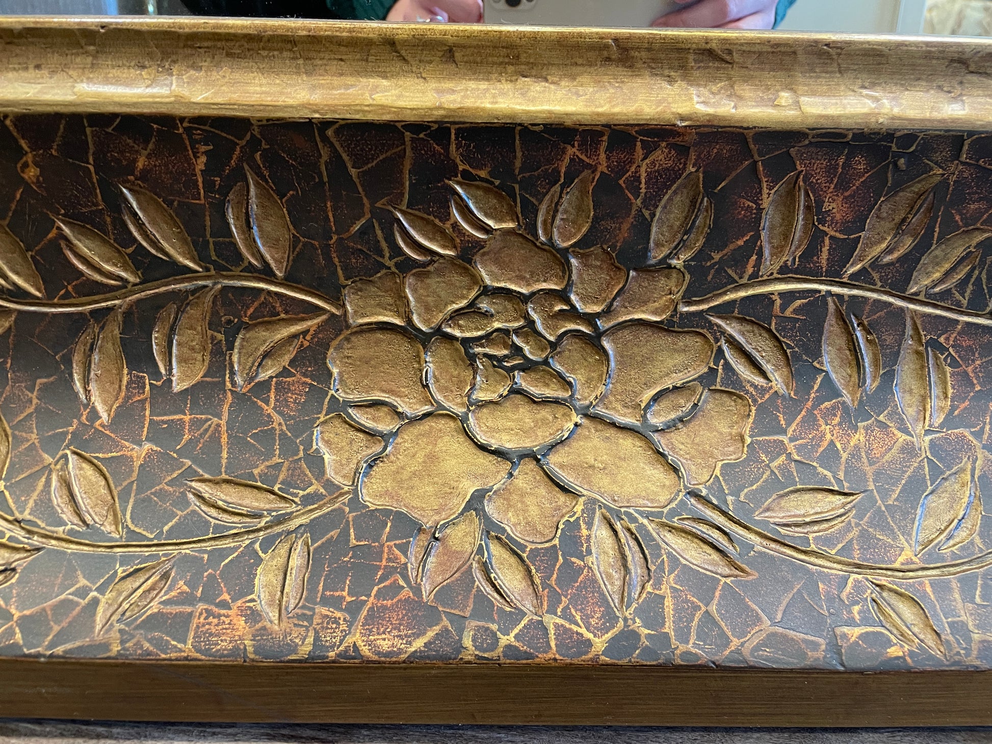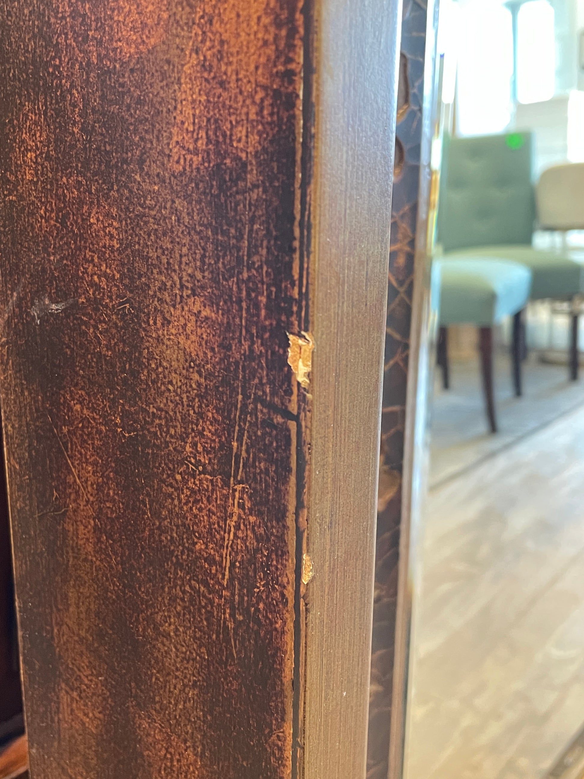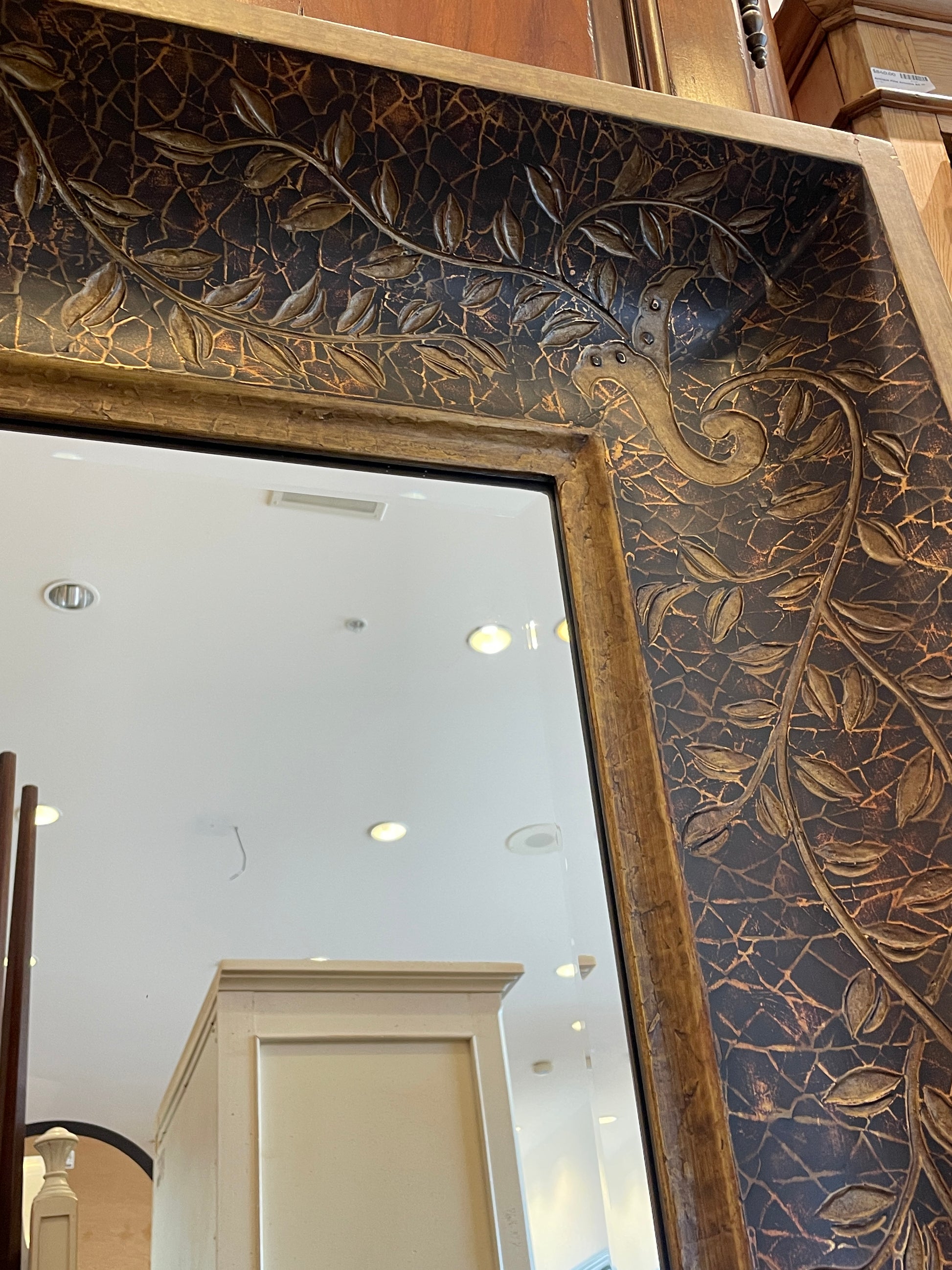 Large rectangular mirror featuring beveled glass with a dark frame detailed by gilt floral designs and a crackle finish.