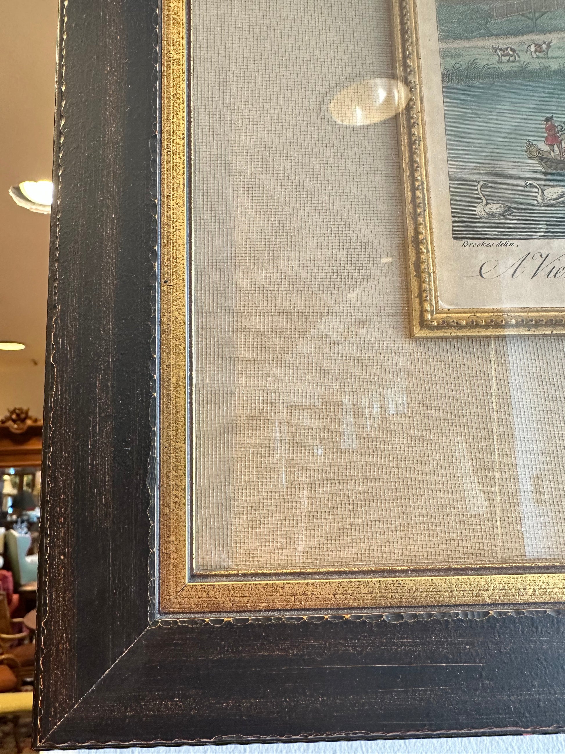 Laurie and Whittle Hand Colored Engraving Windsor titled "A View of the Royal Palace of Windsor Vue du Palais Royal de Windsor A vingt un miles de Londres." Features colors of green, blue, grey, brown, white with hints of pink, red, and yellow. The frame is black and gold. It depicts a serene view of Windsor Palace from across the river Thames. There are boat on the water, a man with a fishing pole and two ladies and a couple on the bank in the foreground, people wanking and a man herding cows on the far bank in front of the palace and two swans in the river to the left. Signed in pencil on the bottom right corner.