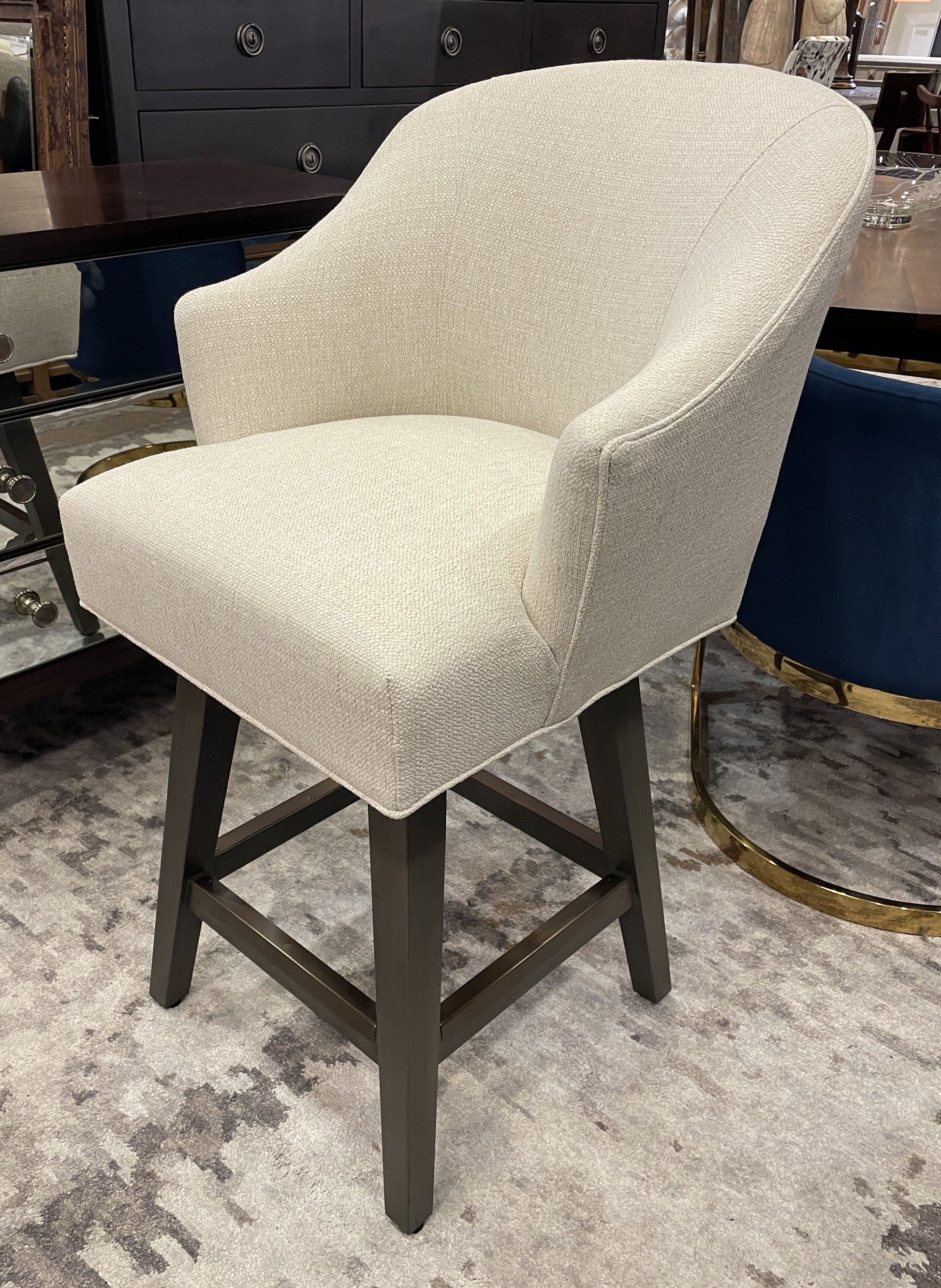 Lee Industries bar stool in new condition. This beautiful piece features a dark wooden frame and white tweed upholstered seat. The legs of the chair are attached with a box stretcher that has a subtle brass plate capping off the top of each part. The cushioned swivel seat has a contoured back. A sleek barstool that is sure to elevate a space with modern charm.