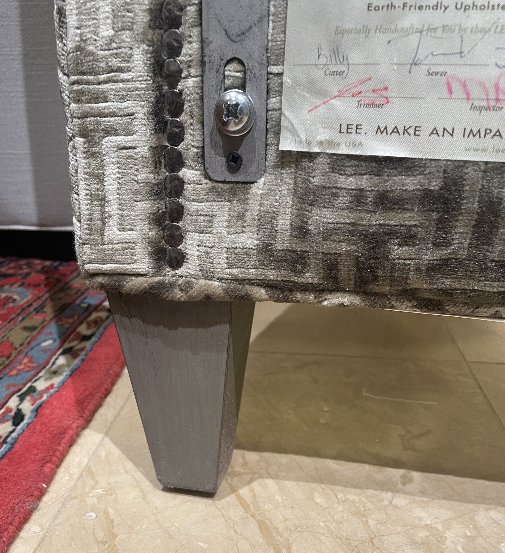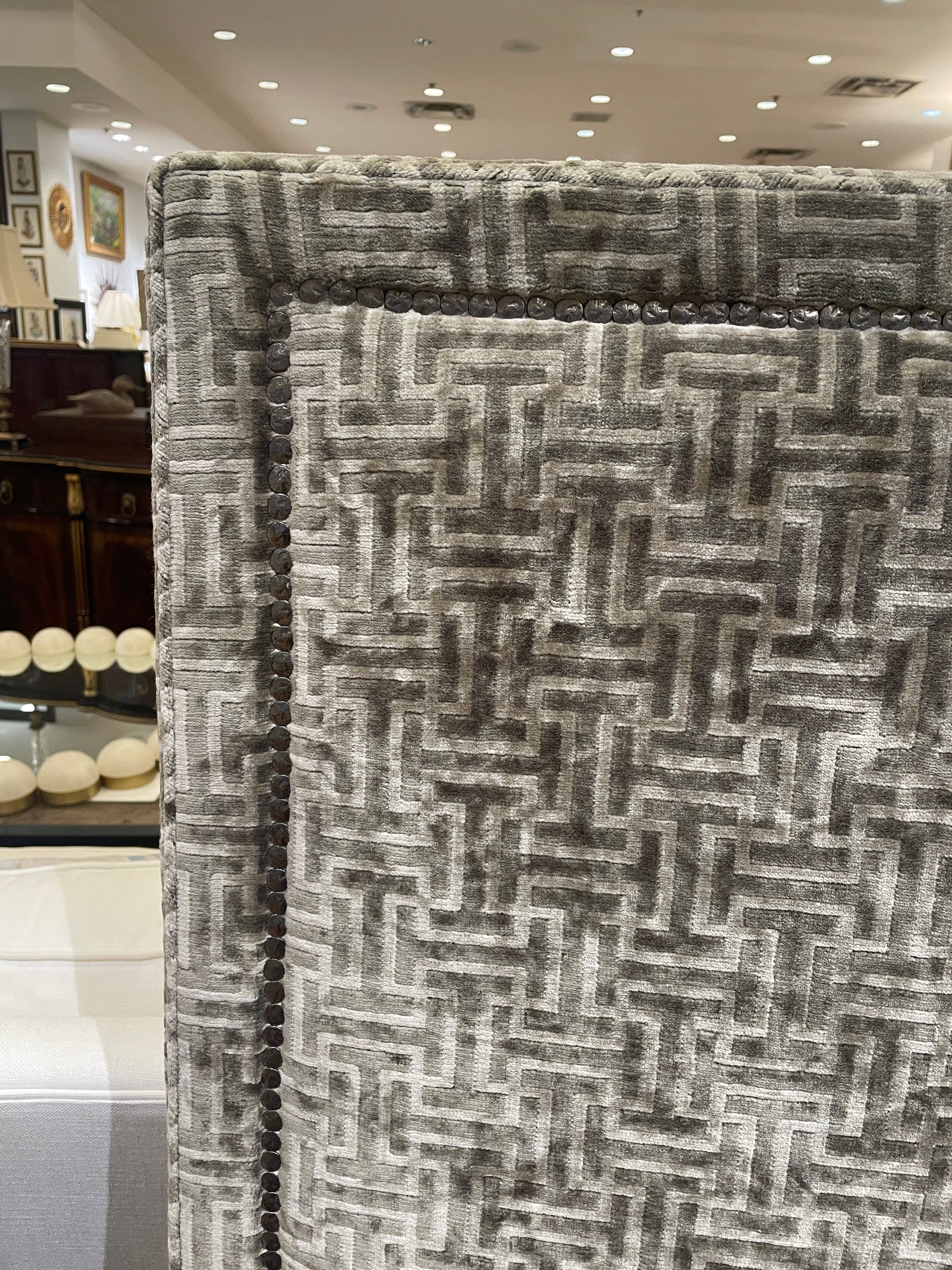 Lee Industries upholstered geometric pattern king bed frame. This charming bed is upholstered with a soft, geometric patterned fabric. The bed has an overall gray color palette with two tones of gray in the upholstery and gray tapered legs. The pattern of the fabric has a symmetrical, Greek key-like design. The outer edge of the headboard is accented by a dark nailhead trim. The sideboards and footboard are also upholstered with the same design. A contemporary bed sure to elevate a space with its eye-catching pattern and simple forms.