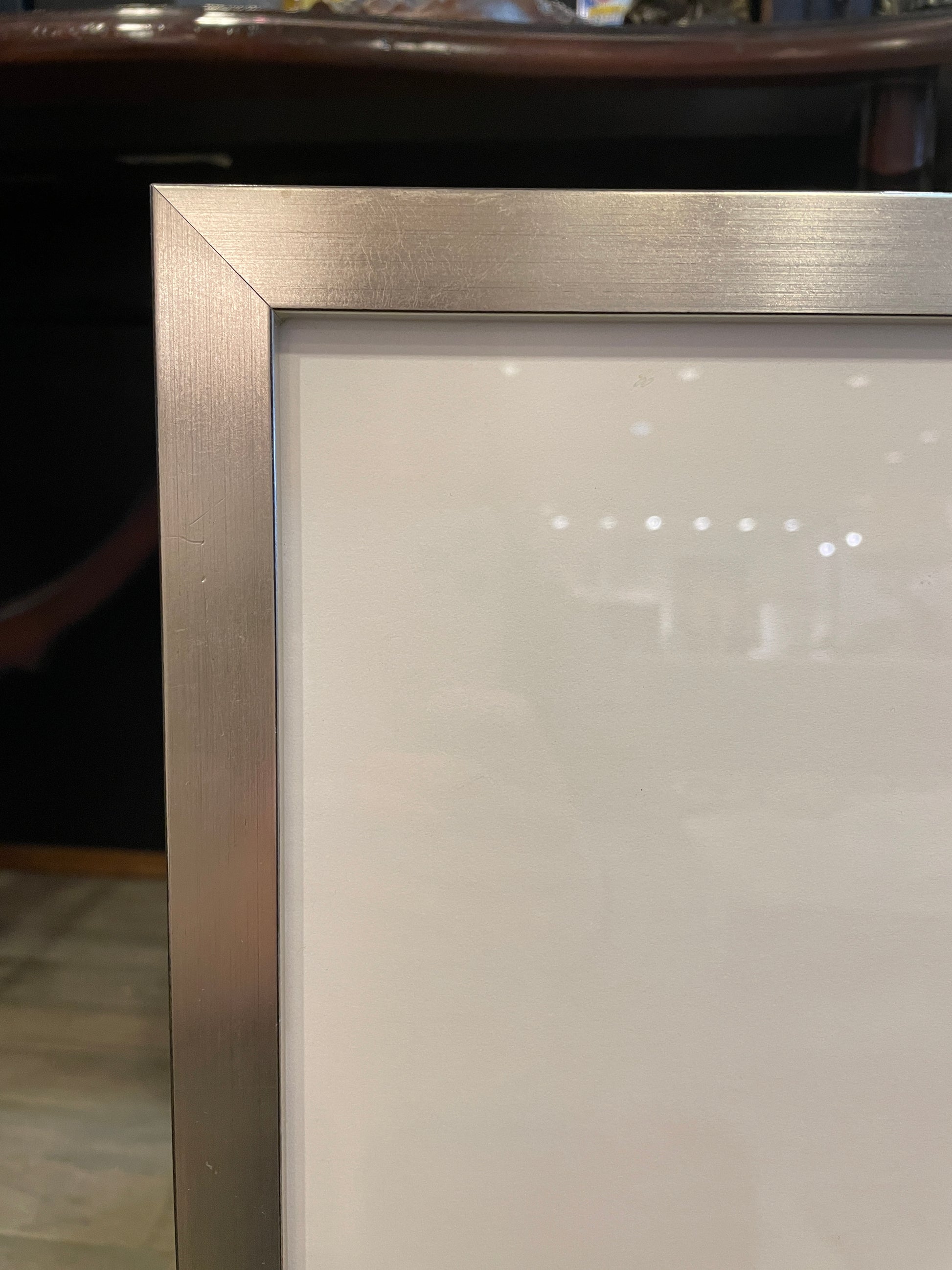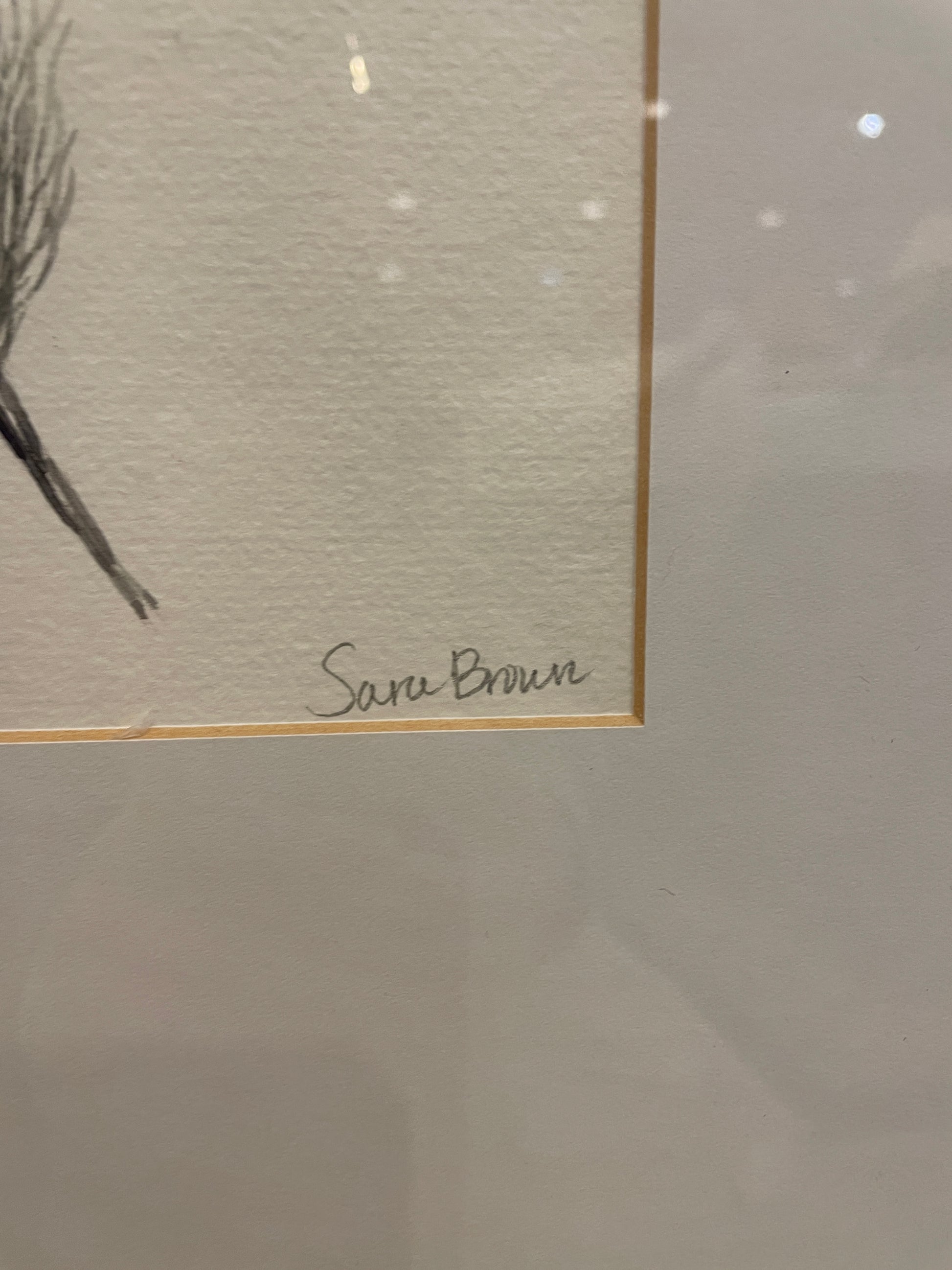 LeftBank Studios feather art by Sarah Brown. Signed lower right. This beautiful work of art depicts a feather in shades of gray. The small piece is eye-catching especially thanks to the broad, white mat surrounding it that allows the dark feather to really pop. The feather has a light tip and darker lower portion, and is beautifully detailed with individual barbs. The piece is set on the white mat and held in an elegant silver frame. A sleek, minimalist work of art that is sure to add a touch of class to any space.