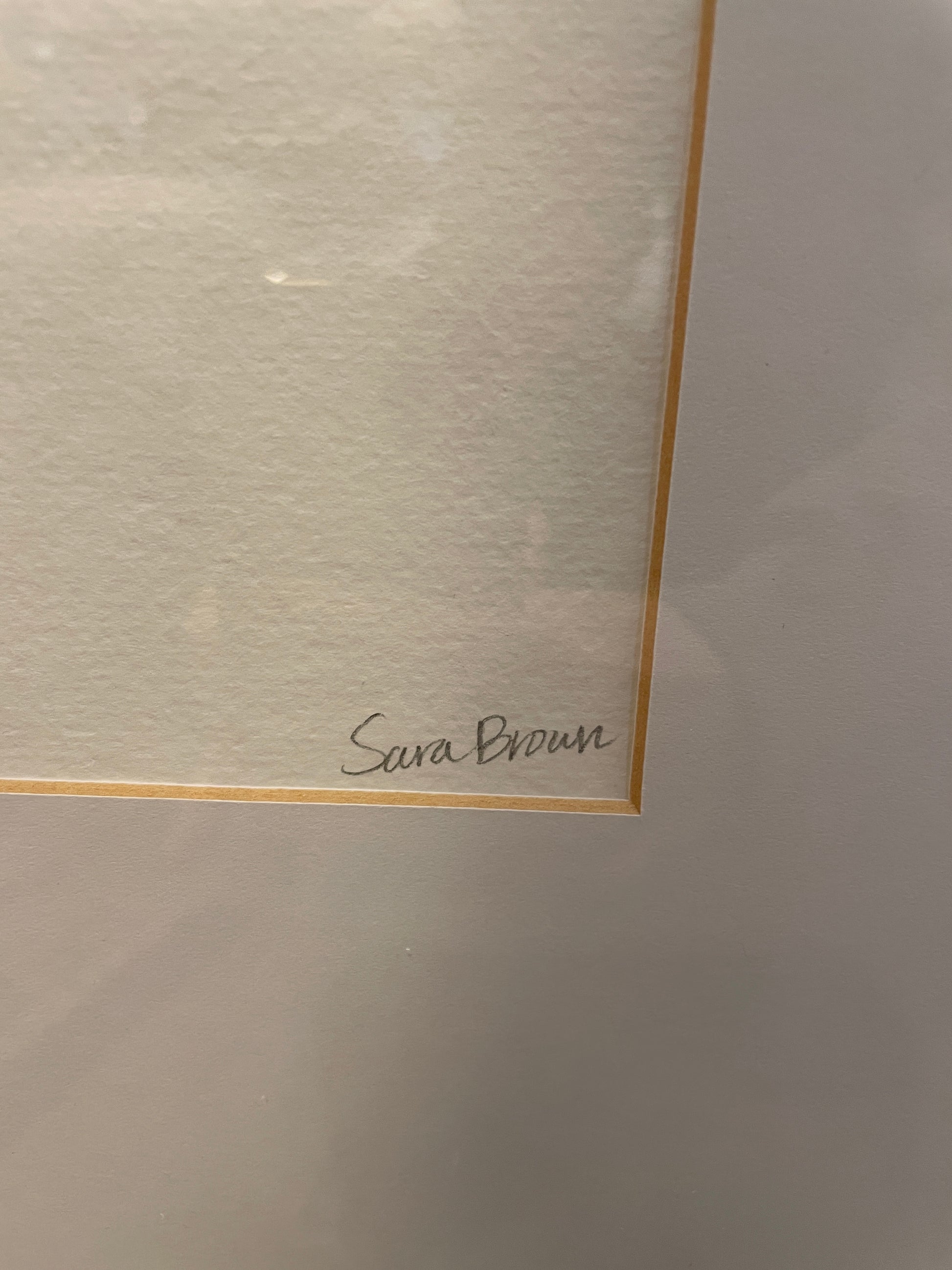 LeftBank Studios feather art by Sarah Brown. Signed lower right. This beautiful work of art depicts a feather in shades of gray. The small piece is eye-catching especially thanks to the broad, white mat surrounding it that allows the dark feather to really pop. The feather has a light tip and darker lower portion, and is beautifully detailed with individual barbs. The piece is set on the white mat and held in an elegant silver frame. A sleek, minimalist work of art that is sure to add a touch of class to any space.