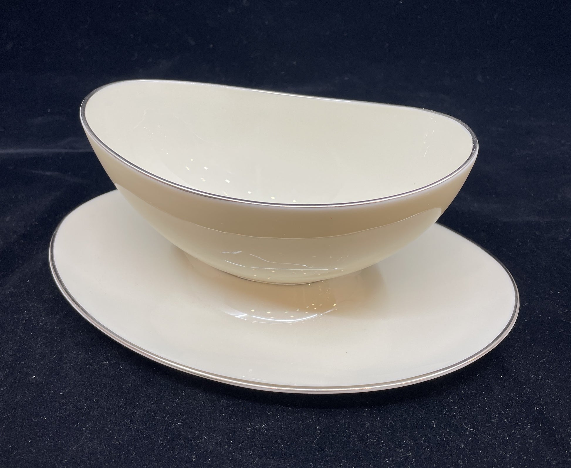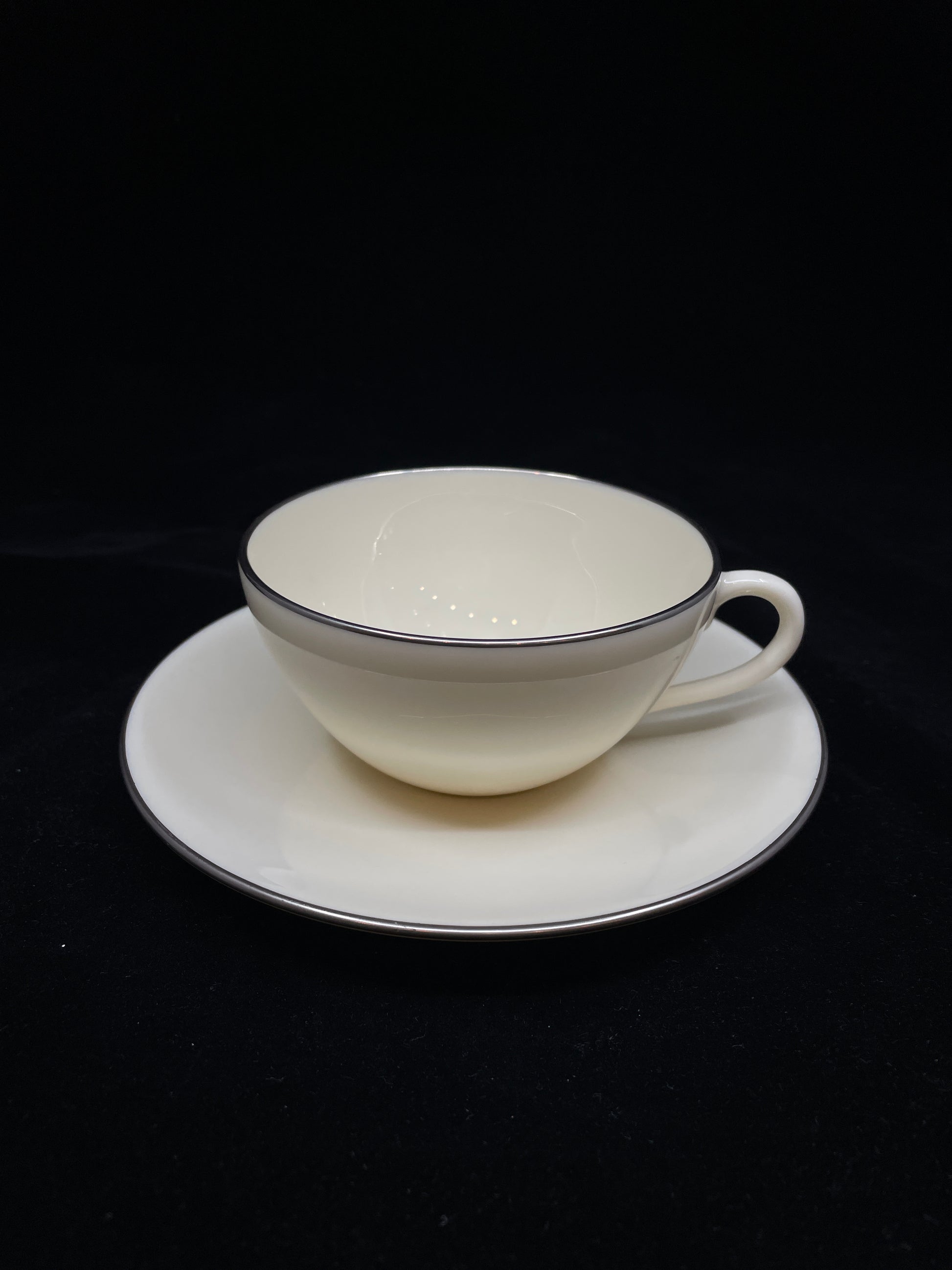 Lenox Olympia Platinum china setting for eight. Marked with the brand and style on the bottom of each piece. This beautiful set of china features a sleek and simple design. Ivory colored bone china is accented with a thin platinum rim. This set is a perfect versatile set thanks to its elegant and versatile design.