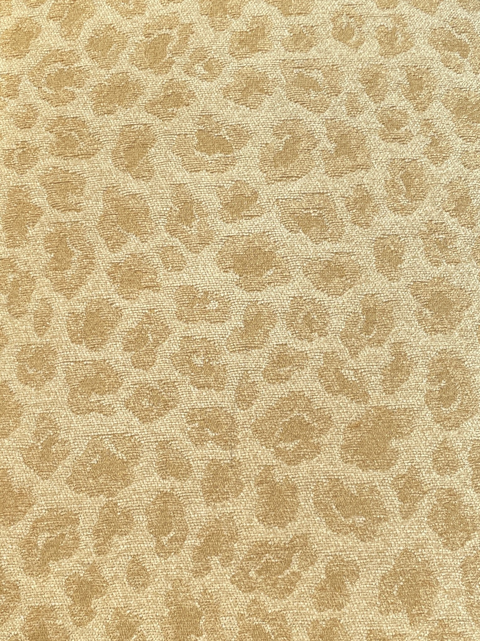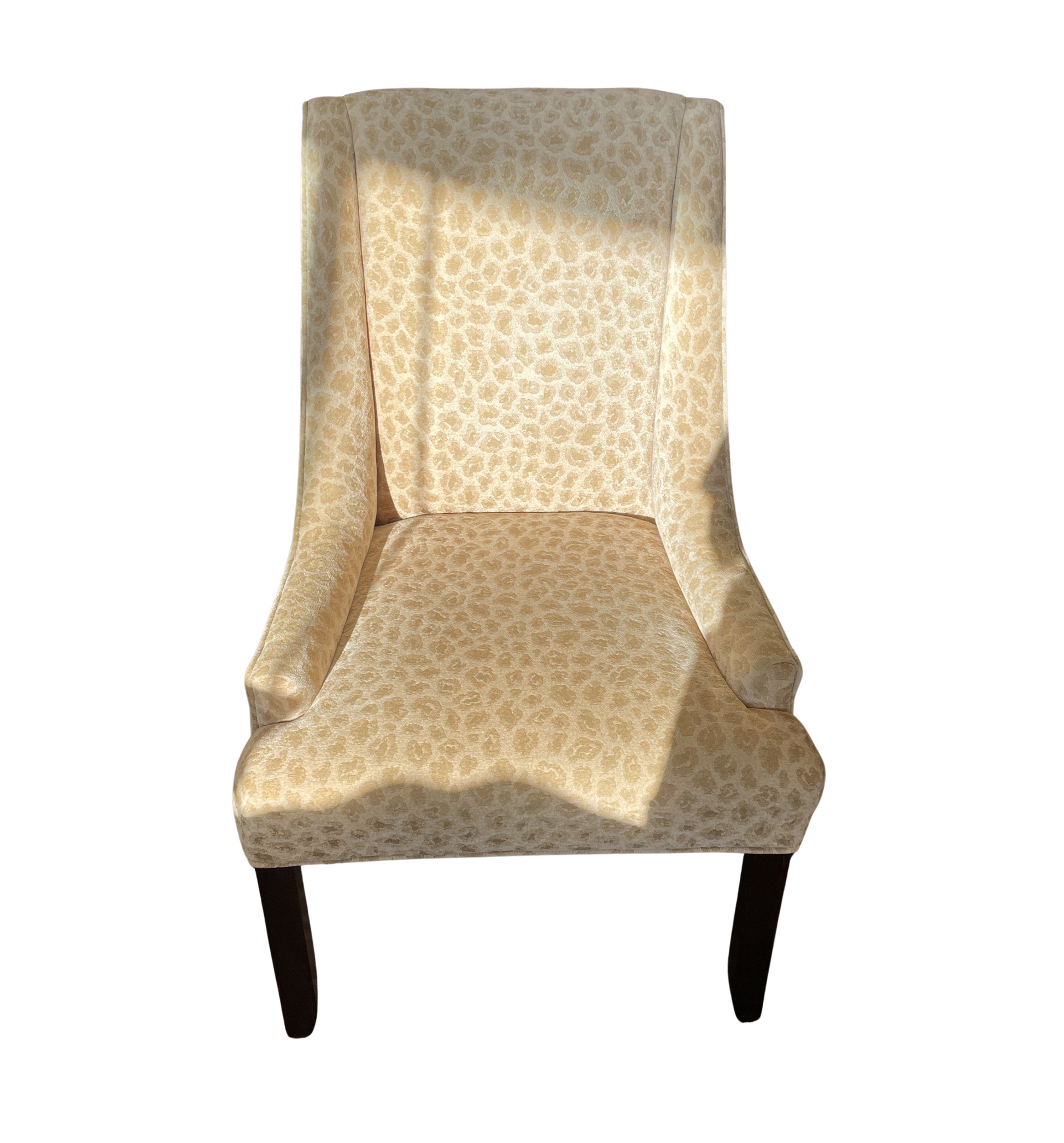 Leopard print occasional chair. Atop four dark wood legs sits a comfortable seat. The piece is upholstered in a light, off white color with slightly darker leopard print. The chair has two arms that reach up most of the length of the chair, stopping a couple inches short of the front of the seat. A beautiful chair full of charm and character.