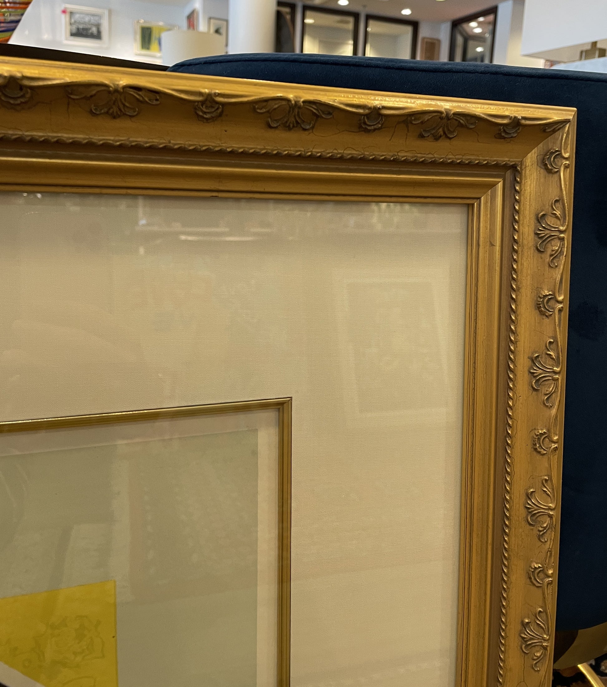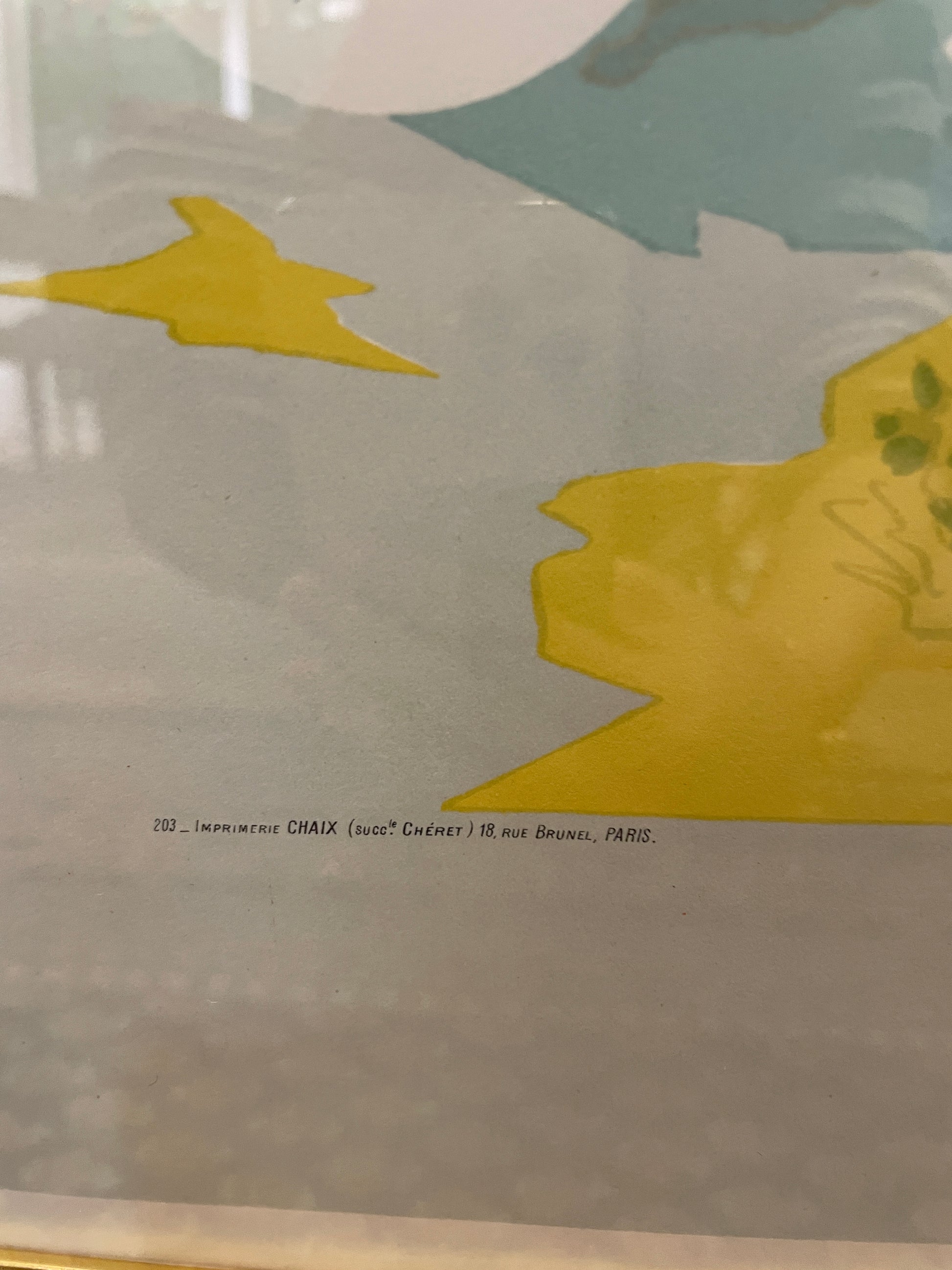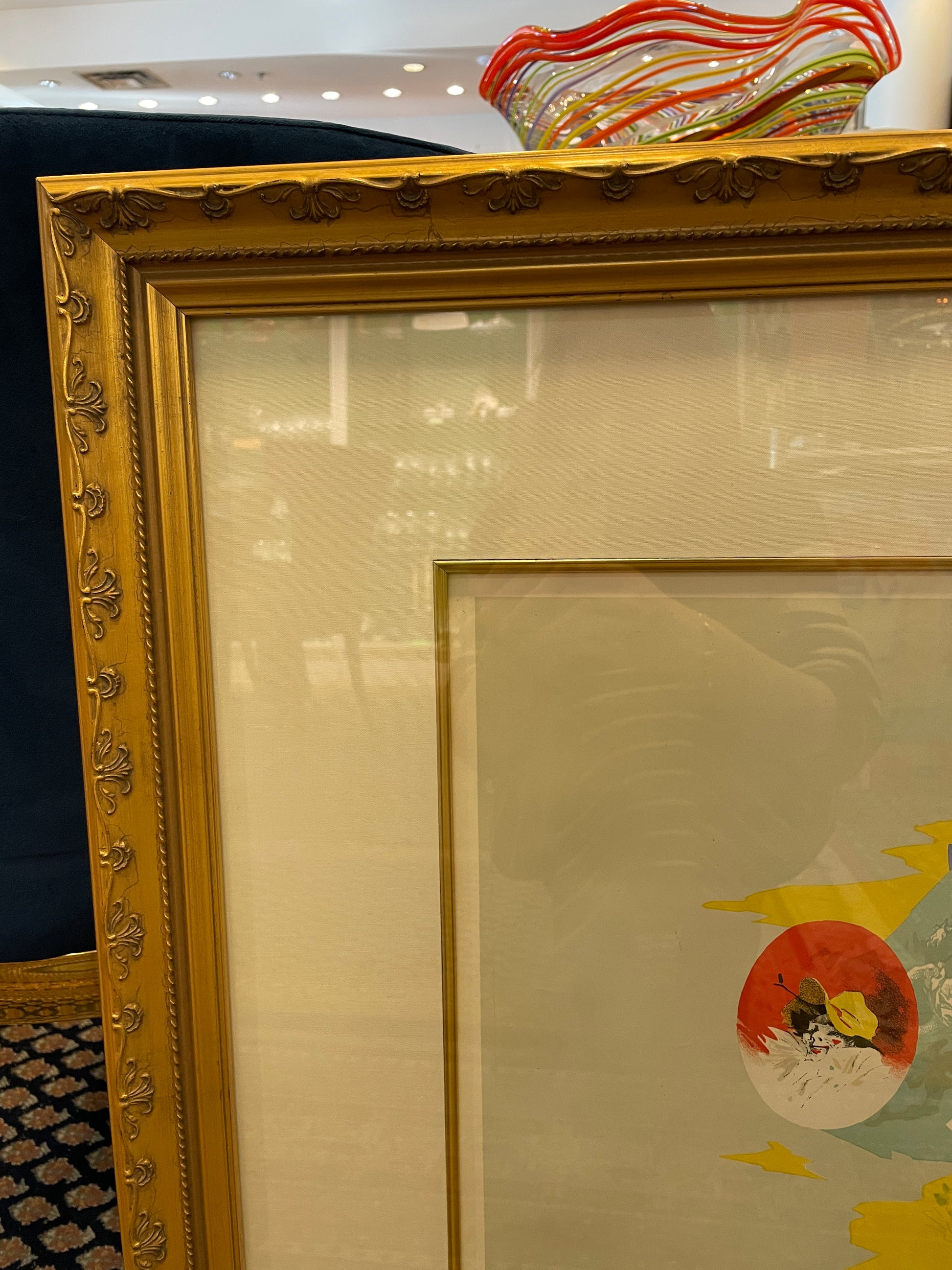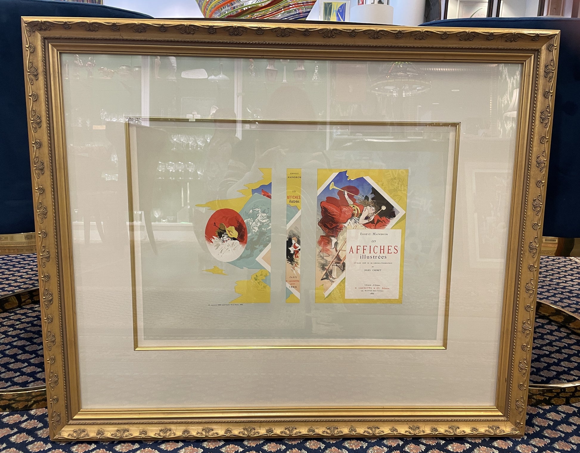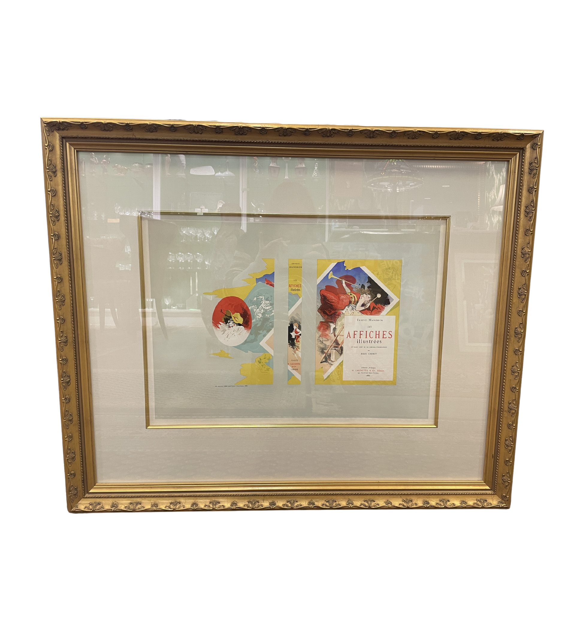 Jules Cheret Les Affiches Illustrees by Maindron book cover colored lithograph. This unique art nouveau piece is matted in white and framed in a carved gold frame. The art is the three sides of a book cover (front, spine, and back) displayed out flat with segments between the components. The piece mainly features the primary colors of blue, red, and yellow with some flashes of other colors included as well. Perfect for book lovers and art lovers alike.